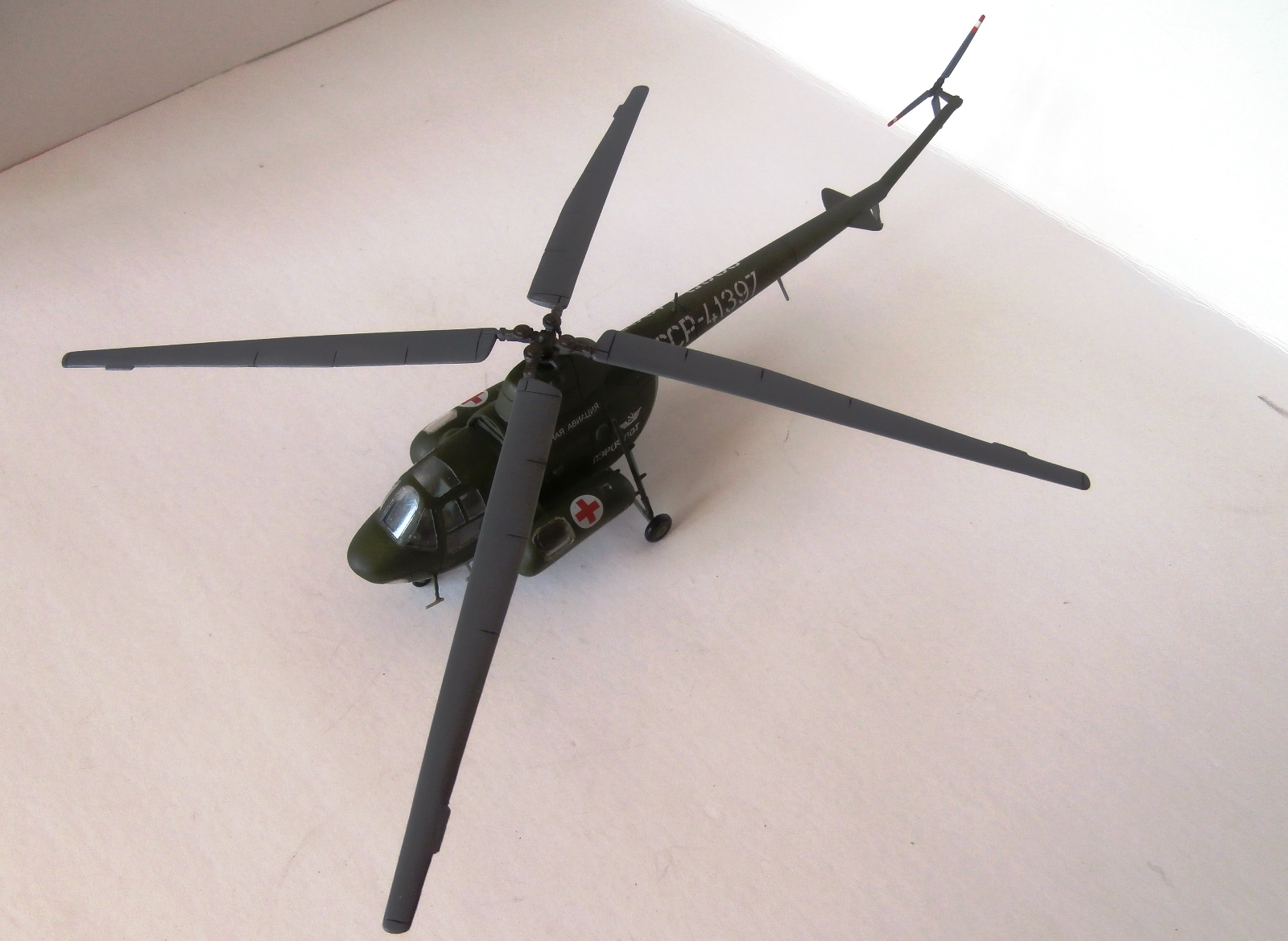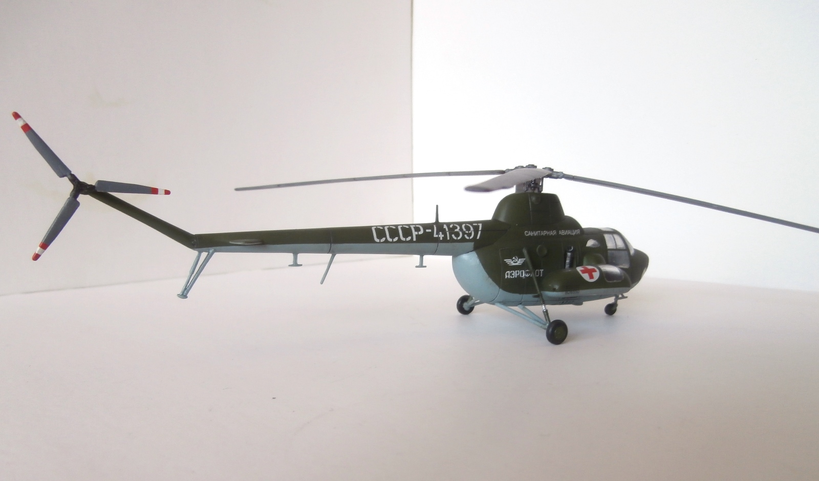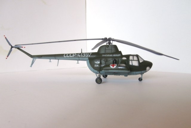 Представляю свою попытку изобразить Ми-1 в санитарном варианте (на коробке написано Ми-3). Сборка на заказ. Так же как и МН-53Е, сей наборчик попал ко мне начатым.