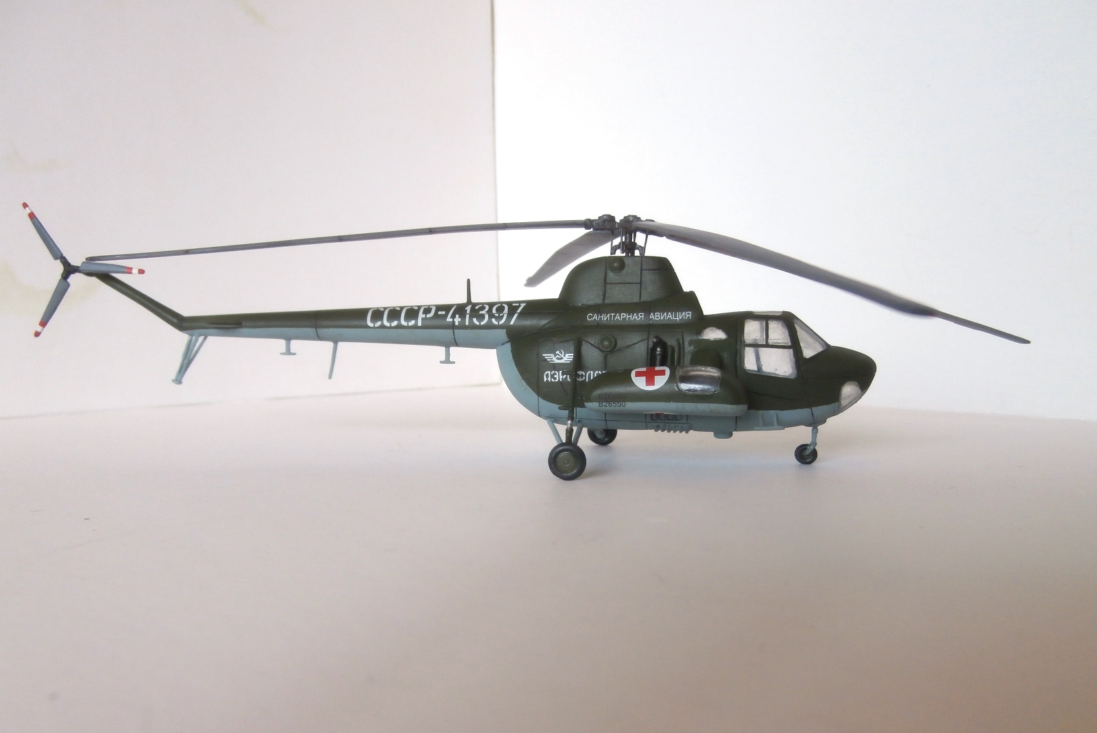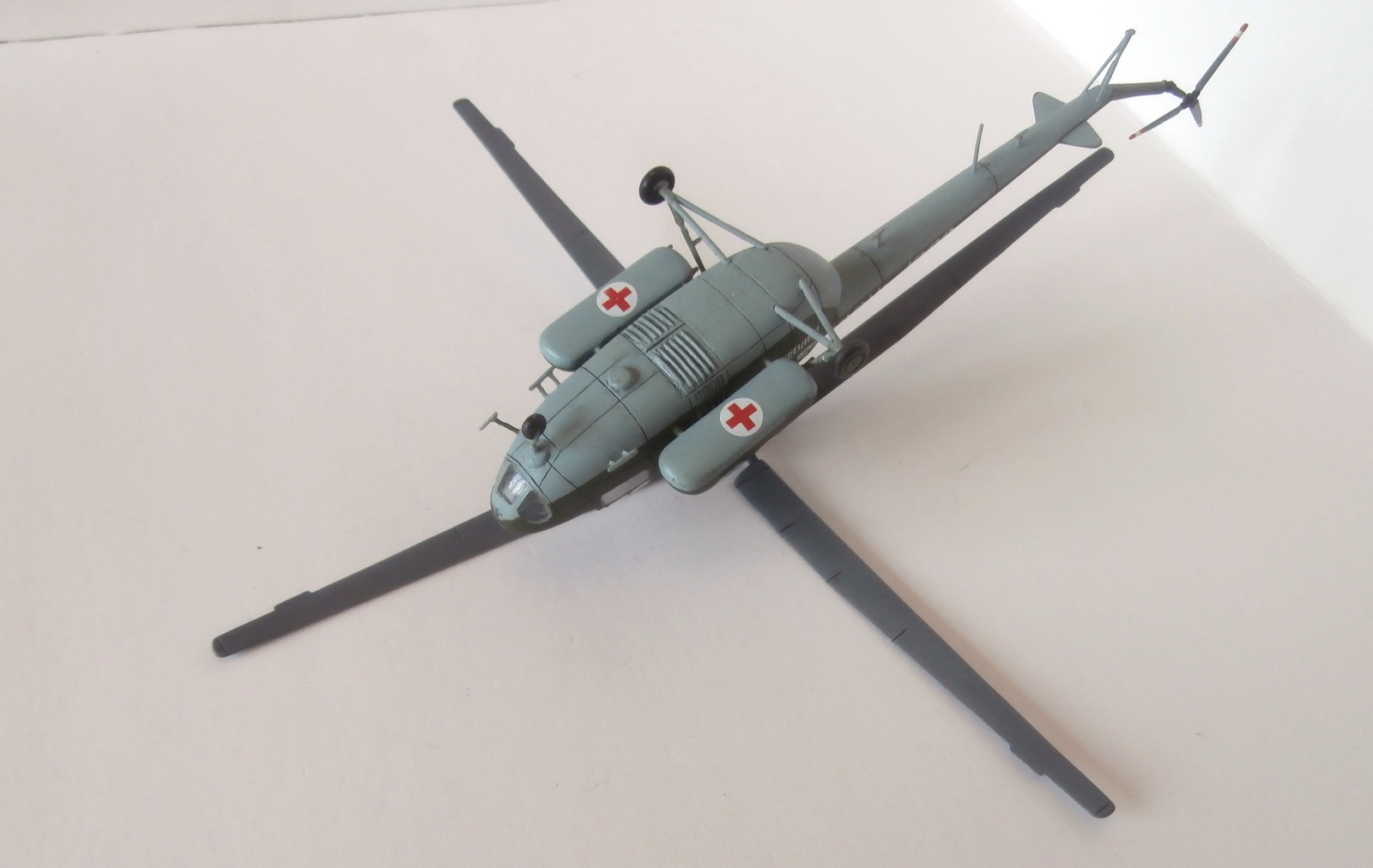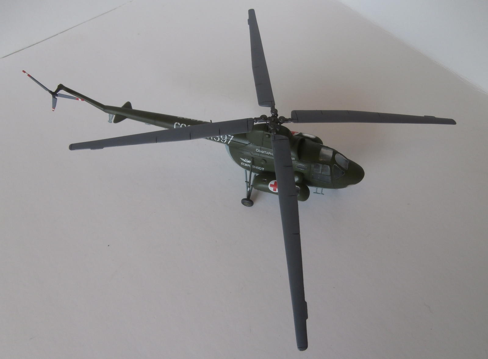 Представляю свою попытку изобразить Ми-1 в санитарном варианте (на коробке написано Ми-3). Сборка на заказ. Так же как и МН-53Е, сей наборчик попал ко мне начатым.