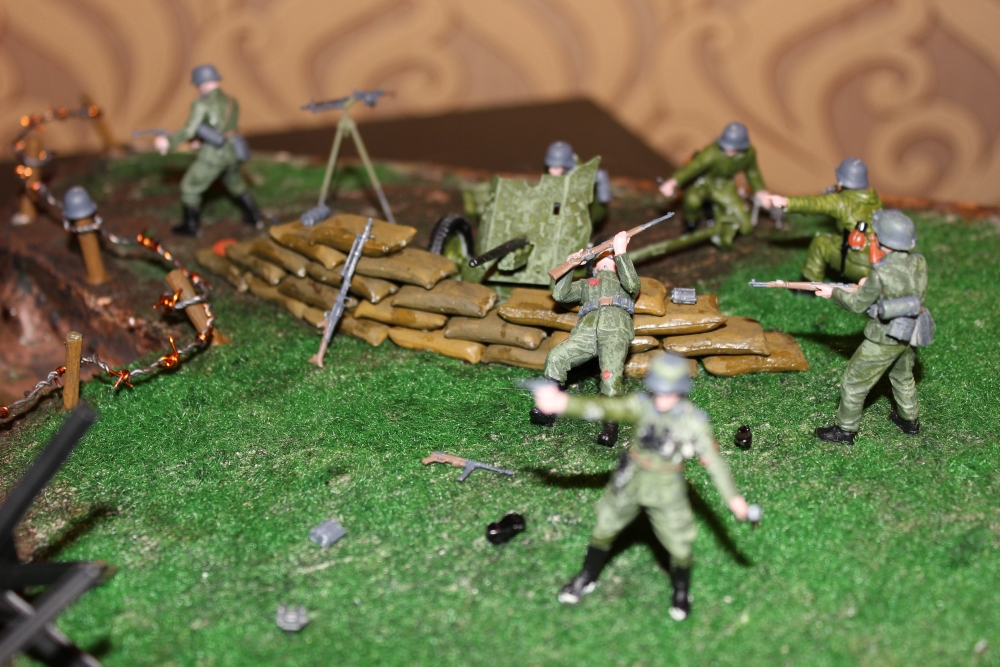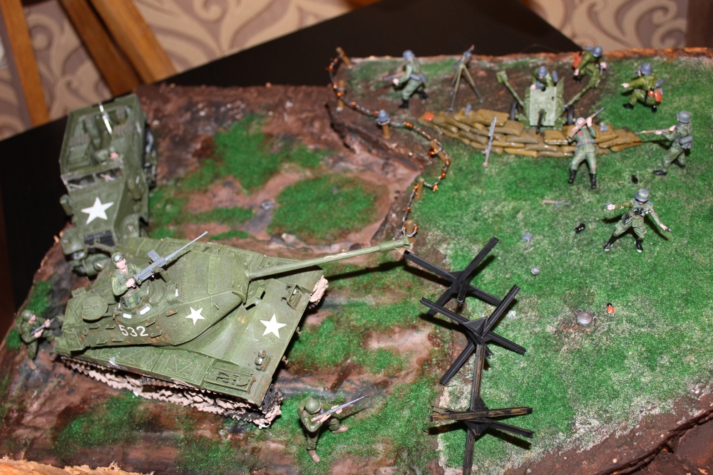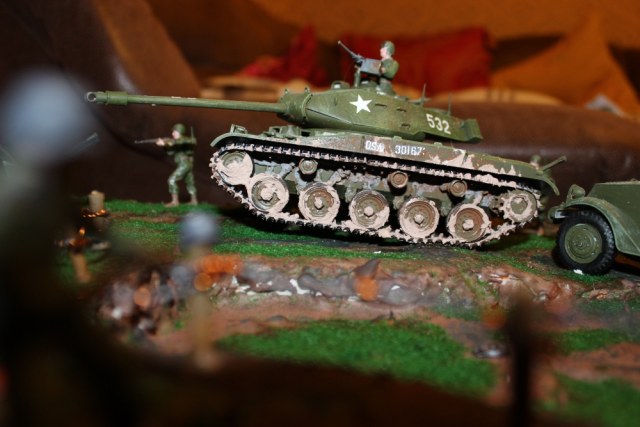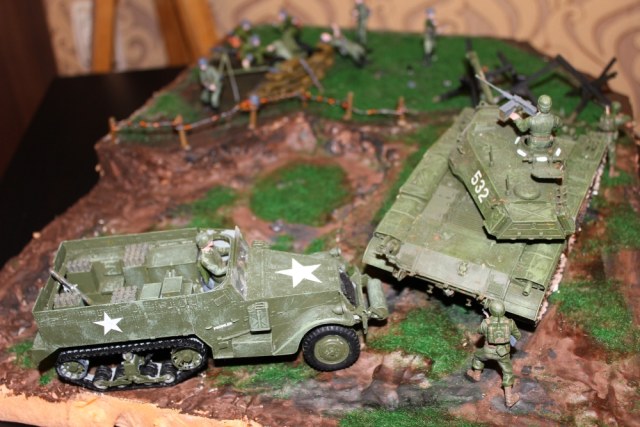 Доброго всем времени суток! Я - начинающий моделист, который решил впервые сделать диораму. На данной диораме представлены американские и немецкие войска, к сожалению, данное действие не могло происходить в реальном мире, ибо дата выпуска танка и обстановки в мире отличаются. Почему же американские войска?(некоторые спрашивают). Потому что мне изначально подарили М41 и в связи с этим, я решил начать именно с него. Помимо Танка от Тамии и БТР М4 от Драгона, были использованы солдатики (немцы) от МастерБокс, пушка от Звезды, мешки, ежи от Тамии, так же трава и пигменты от ZipMaket. К концу процесса очень хотелось завершить, но сессия(не хватало времени) ... поэтому и не доделал качественно солдатиков у пушки.