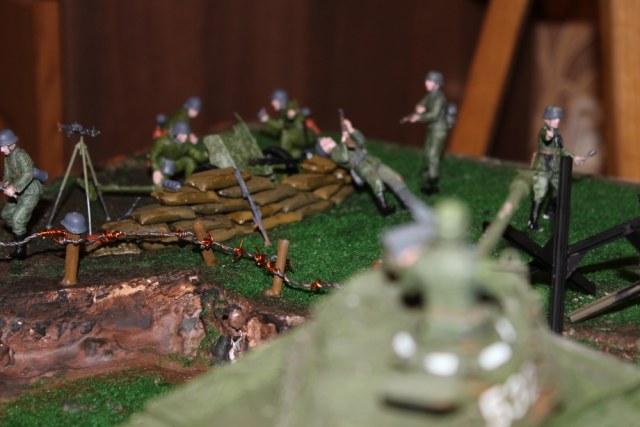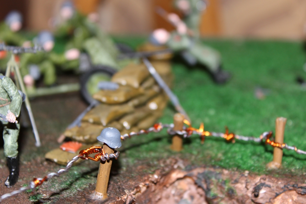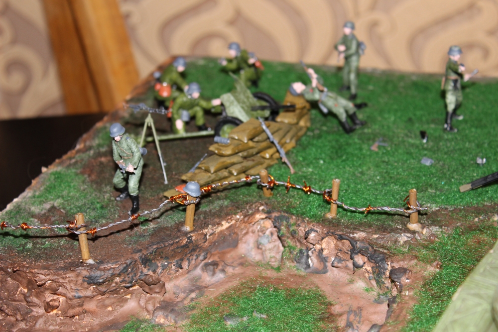 Я понимаю что вы начинающий моделист, но; начнем с того что фотографий катострофически мало для диорамы,и диорамы надо делать в соответсвии с историей, а не то что подарили в кучу сбрасывать. По самой диораме; что за торосы между столбов натянуты, медные калючки не вписываются (хотя бы их закрасили в цвет тросов) , я уже не говорю что всё это явно переразмерено, грязь на "бульдоге" не соответсвует тому грунту по которому он ездит, да и скажем так загрязнение не удалось, выглядит как будто танк по тесту ездил, и откуда взялась грязь на пушке, зато у М4 гусянки и колёса стерильно чистые, лиц у солдат почему то не на одной фотке не видно, почему то мне кажется что они просто выкрашены в телесный цвет и всё, на технике катастрофически не хватает следов эксплутации, ну и так ещё много чего по мелочи.