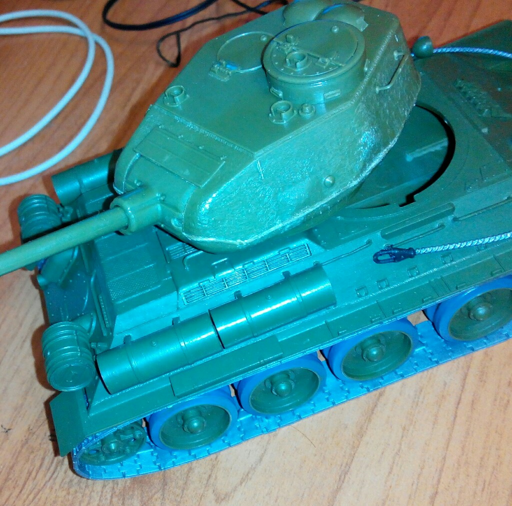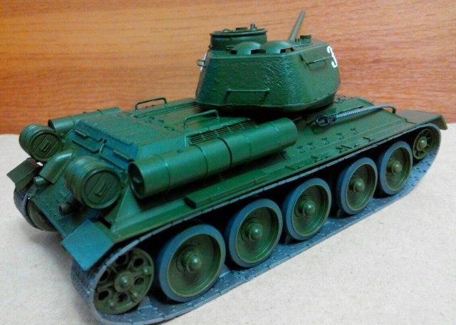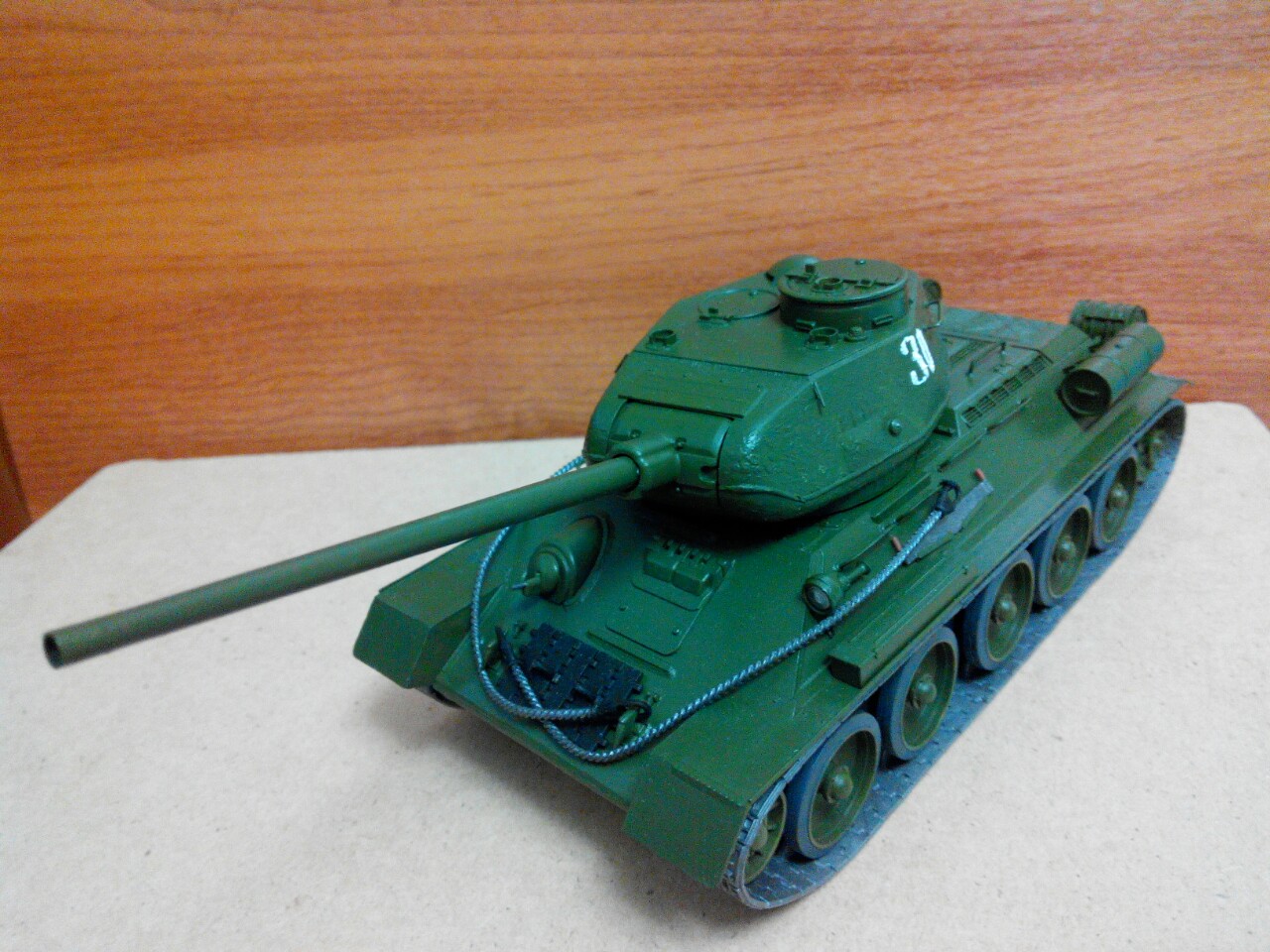 Начнём с того что фотографий мало, из них две (2-я и 3-я) вообще можно сказать одинаковые, а те фото что есть не лучшего качества, модель толком не рассмотреть, в названии модели что значит №30 ? Вы его делали основываясь на конкретном прототипе с этим бортовым номером !? цвет модели ядовито зелёный, выхлопные трубы почему то тоже зелёные, щели на башне и на корме, не добавляют реалистичности, гусянки (в верху) висят в воздухе и что значит "танк на ходу", он с моторчиком и ездит !? Модели явно не хватает, смывки, тонировки, следов эксплуатации и т.д.