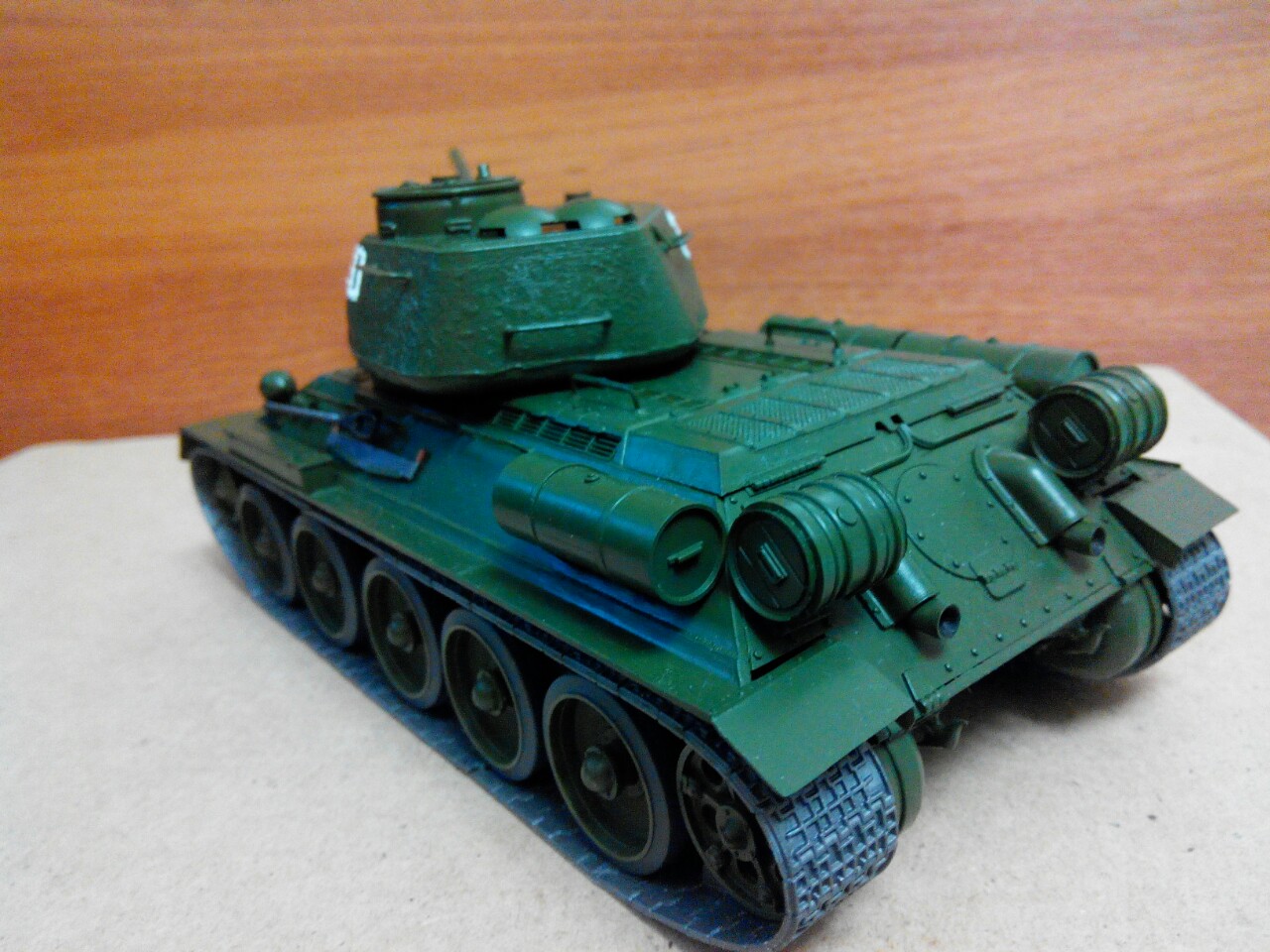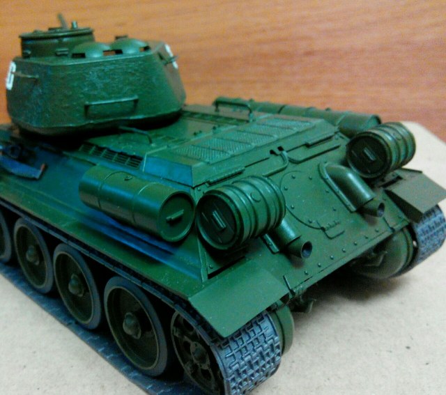 Доброго времени суток! Прошу Вас оценить мою первую модель,т.к. не владеют различными техниками окрашивания модели, танк покрашен просто кистью и красками Звезда. Склеен также клеем Звезда. Гусеницы из набора. Т.к. танк находу) строго не судите их не реалисненость.