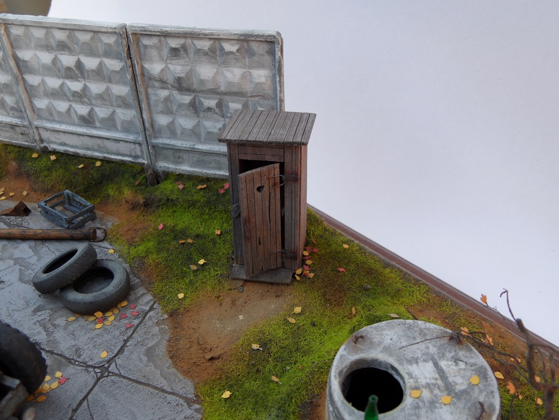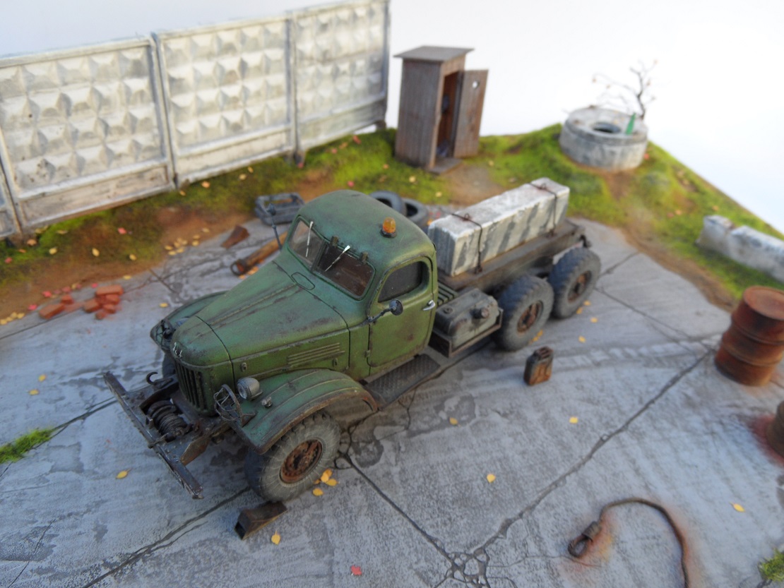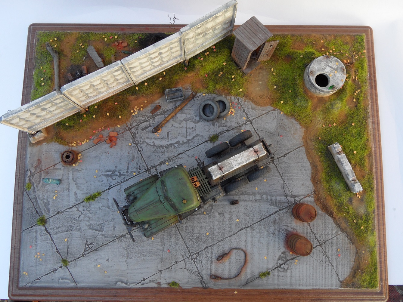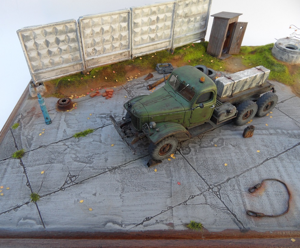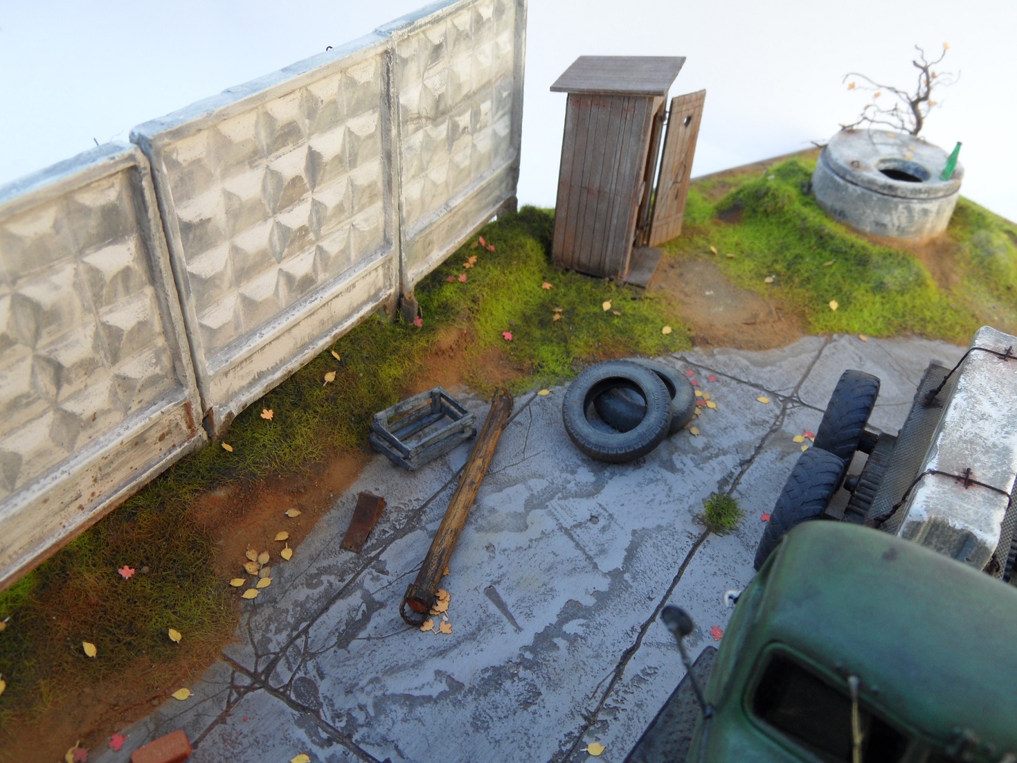 Привет всем! Как и обещал выставляю свою первую диораму, рискну так сказать выставить свою работу в этот раздел. Основа диорамы МДФ, плиты- шпаклевка, трава Зип, забор, колодец, туалет- СМУ 23. Набор Зил 157 решил конверсировать в балластный тягач, для расстановки автобусов итд на автотранспортном предприятии. Вместо кузова сделал подставку для балласта, фундаментный блок- СМУ 23( балласт). В работе использовал травление Петроград-решетки на фары, аккумуляторный отсек, подножки, противооткатные упоры(башмаки), крепление зп, руль , дворники и решетка на заднее стекло. К слову сзади на кабине 4 огромных ( под штатную решетку)отверстия пришлось зашпаклевать. Сделал заднюю фару, лебедку, номера травленые. Мигалка самодельная, переделал габариты. Идея для диорамы приходила по ходу постройки модели- этакая галерка автобазы. Для диорамы изготовил бутылки( как без них) из тянутого литника, диск от Зил 130 пришлось доработать чтоб положить без покрышки, самодельный баллон кислорода, трос самодельный- медная проволока, сцепка из литника, канистра - смола Петроград, кусты- корни дерева, земля- земля и пигмент, ящик из спичек выстрогал). Туалет хоть и покупной , но поработать над ним пришлось- оживить так сказать))). Сделал рулон и держатель туалетной бумаги, газеты, нанес следы эксплуотации на полу и стенах))). Сам туалет подстарил, ну и ведро для бумаги сделал, с бумагой естественно). За забором изобразил этакую поляну для тусовки гоп молодежи по ночам, ну и ПТУ в котором я когда то учился решил прославить, вместе с районом) . Приятного просмотра!