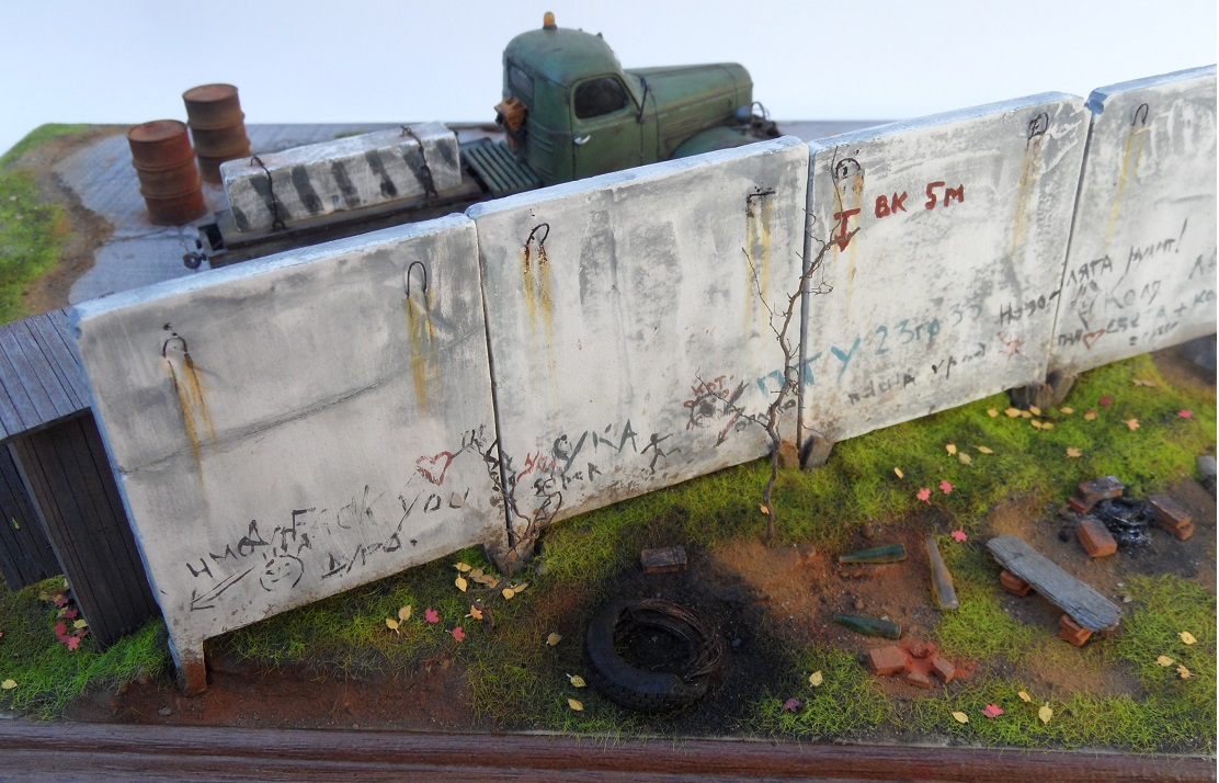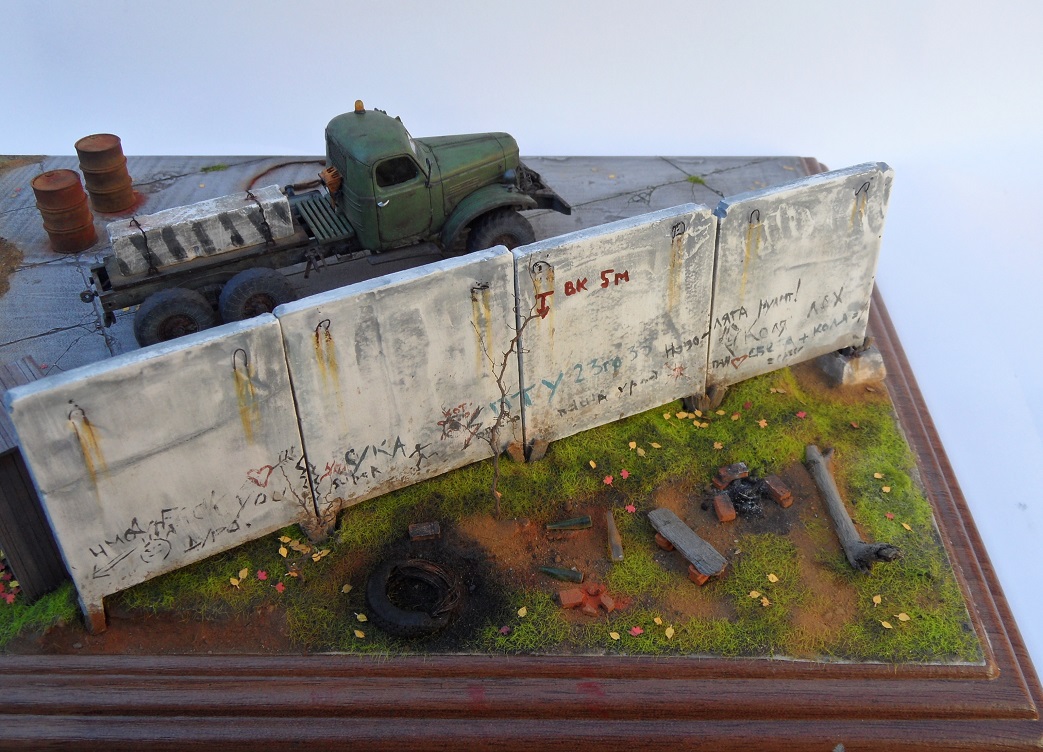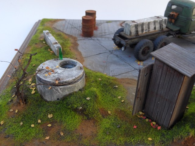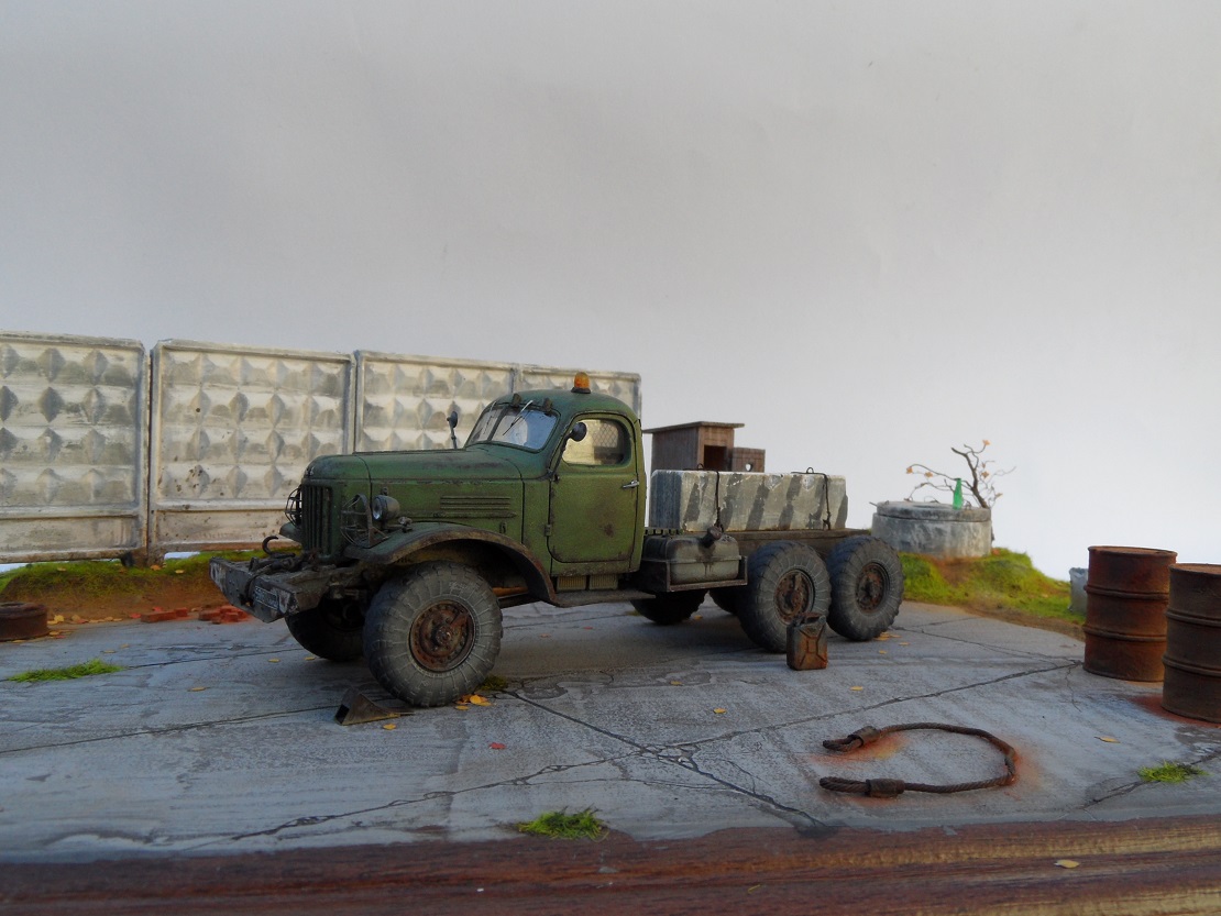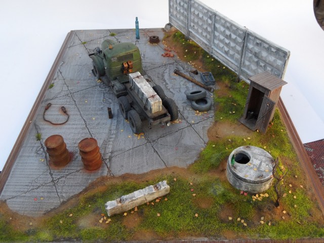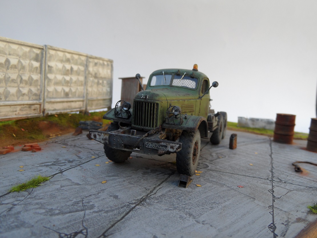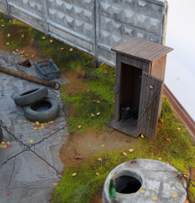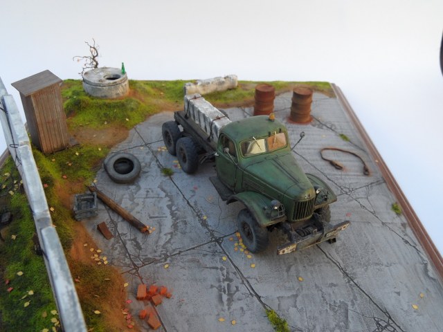 Привет всем! Как и обещал выставляю свою первую диораму, рискну так сказать выставить свою работу в этот раздел. Основа диорамы МДФ, плиты- шпаклевка, трава Зип, забор, колодец, туалет- СМУ 23. Набор Зил 157 решил конверсировать в балластный тягач, для расстановки автобусов итд на автотранспортном предприятии. Вместо кузова сделал подставку для балласта, фундаментный блок- СМУ 23( балласт). В работе использовал травление Петроград-решетки на фары, аккумуляторный отсек, подножки, противооткатные упоры(башмаки), крепление зп, руль , дворники и решетка на заднее стекло. К слову сзади на кабине 4 огромных ( под штатную решетку)отверстия пришлось зашпаклевать. Сделал заднюю фару, лебедку, номера травленые. Мигалка самодельная, переделал габариты. Идея для диорамы приходила по ходу постройки модели- этакая галерка автобазы. Для диорамы изготовил бутылки( как без них) из тянутого литника, диск от Зил 130 пришлось доработать чтоб положить без покрышки, самодельный баллон кислорода, трос самодельный- медная проволока, сцепка из литника, канистра - смола Петроград, кусты- корни дерева, земля- земля и пигмент, ящик из спичек выстрогал). Туалет хоть и покупной , но поработать над ним пришлось- оживить так сказать))). Сделал рулон и держатель туалетной бумаги, газеты, нанес следы эксплуотации на полу и стенах))). Сам туалет подстарил, ну и ведро для бумаги сделал, с бумагой естественно). За забором изобразил этакую поляну для тусовки гоп молодежи по ночам, ну и ПТУ в котором я когда то учился решил прославить, вместе с районом) . Приятного просмотра!