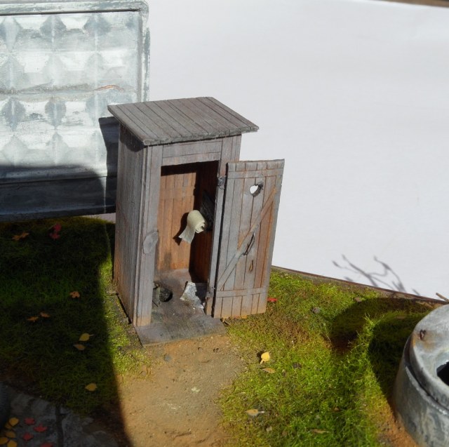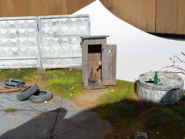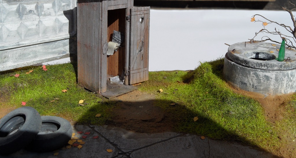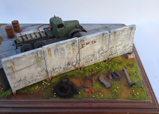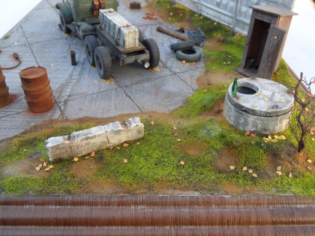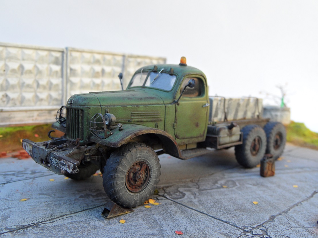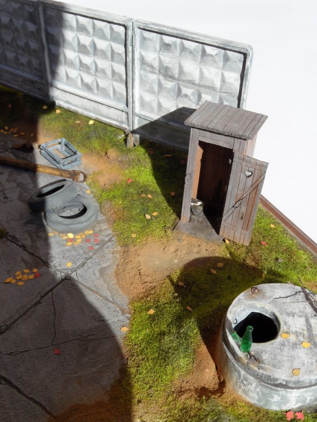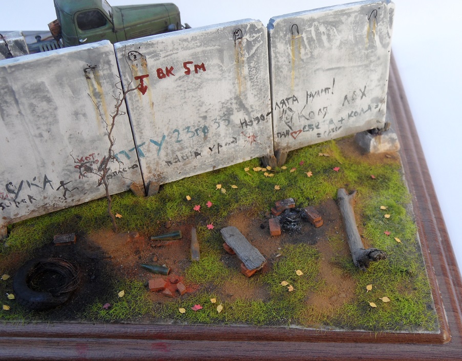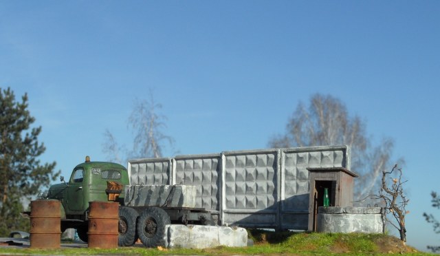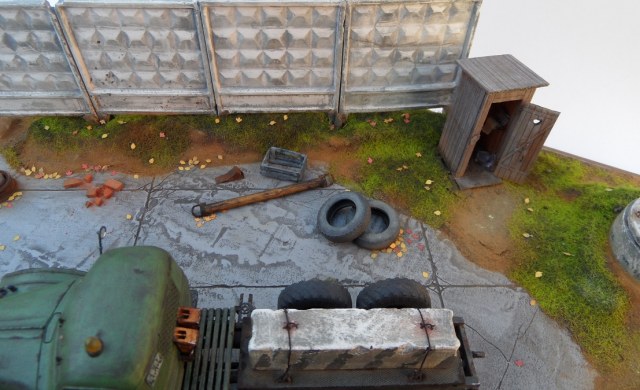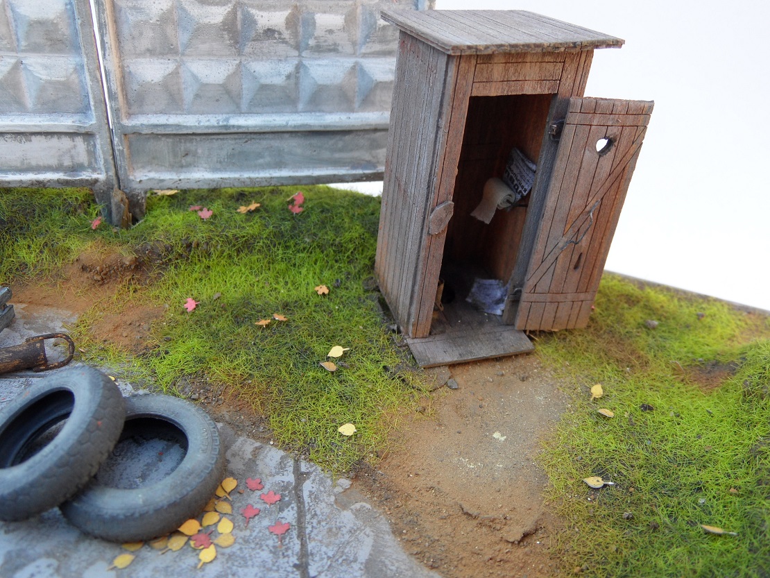Привет всем! Как и обещал выставляю свою первую диораму, рискну так сказать выставить свою работу в этот раздел. Основа диорамы МДФ, плиты- шпаклевка, трава Зип, забор, колодец, туалет- СМУ 23. Набор Зил 157 решил конверсировать в балластный тягач, для расстановки автобусов итд на автотранспортном предприятии. Вместо кузова сделал подставку для балласта, фундаментный блок- СМУ 23( балласт). В работе использовал травление Петроград-решетки на фары, аккумуляторный отсек, подножки, противооткатные упоры(башмаки), крепление зп, руль , дворники и решетка на заднее стекло. К слову сзади на кабине 4 огромных ( под штатную решетку)отверстия пришлось зашпаклевать. Сделал заднюю фару, лебедку, номера травленые. Мигалка самодельная, переделал габариты. Идея для диорамы приходила по ходу постройки модели- этакая галерка автобазы. Для диорамы изготовил бутылки( как без них) из тянутого литника, диск от Зил 130 пришлось доработать чтоб положить без покрышки, самодельный баллон кислорода, трос самодельный- медная проволока, сцепка из литника, канистра - смола Петроград, кусты- корни дерева, земля- земля и пигмент, ящик из спичек выстрогал). Туалет хоть и покупной , но поработать над ним пришлось- оживить так сказать))). Сделал рулон и держатель туалетной бумаги, газеты, нанес следы эксплуотации на полу и стенах))). Сам туалет подстарил, ну и ведро для бумаги сделал, с бумагой естественно). За забором изобразил этакую поляну для тусовки гоп молодежи по ночам, ну и ПТУ в котором я когда то учился решил прославить, вместе с районом) . Приятного просмотра!
