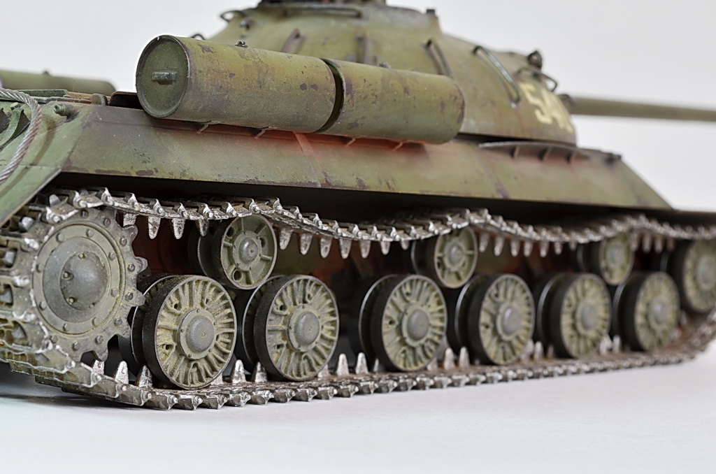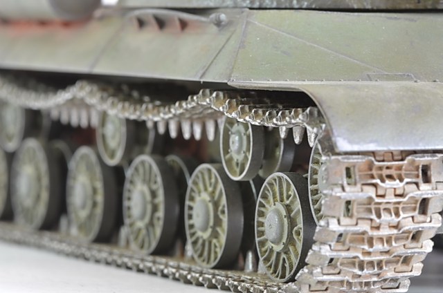 Переписал название с коробки, Иосиф Сталин - Josef Stalin, так утверждают японцы. Насчет провиса, он одинаковый, просто когда фотографировал, танк передвигал и с одной стороны провис получился больше из-за натянутости гусеницы снизу. А если честно то по одному траку не мешало бы убрать