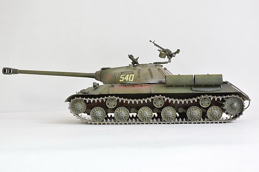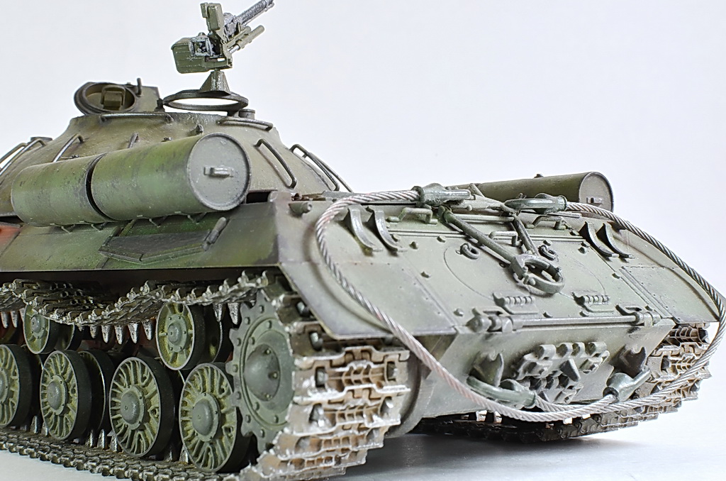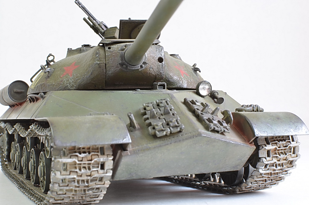 Представляю вторую попытку использования фильтров, масляных точек, пигментов на базе танка ИС-3. Модель собиралась из коробки. Траки заменил на металлические от Фрюил (сборка гусениц доставила одно удовольствие, качество литья на высоте), установил металлический трос (немного толстоват 1,2 мм), установил фару от Эльф.