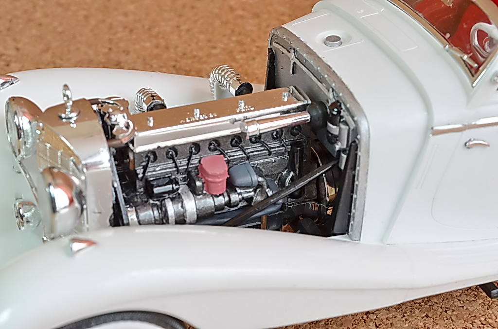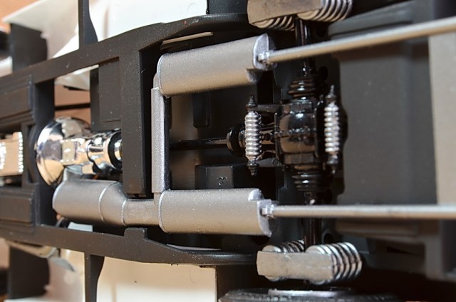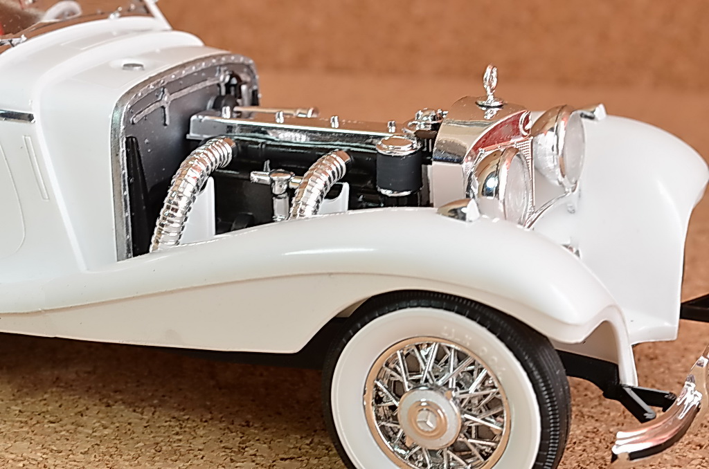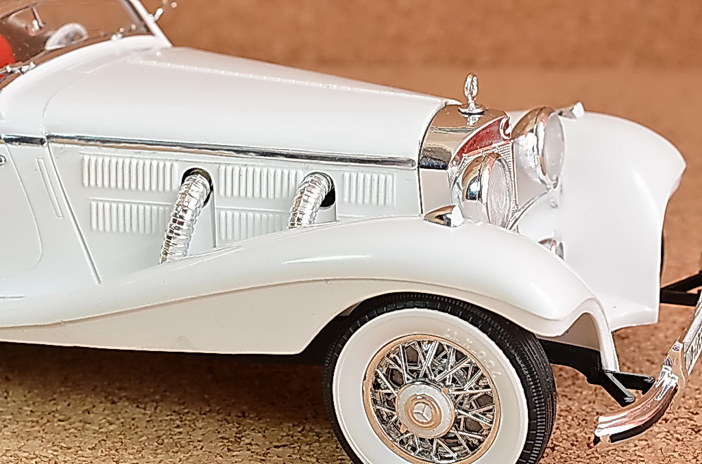 Что можно сказать про сборку данной модели. Впечатление отрицательное, вызвано ужасным качеством деталей, облои, следы от литников, разное качество пластмассы, его состава. Стыкуемость деталей удовлетворительное, хромированные детали выполнены не качественно. Ожидал сюрприз с фарами, одной не было, пришлось делать из коробки для дисков. На фото видно.