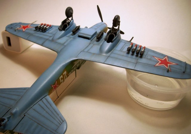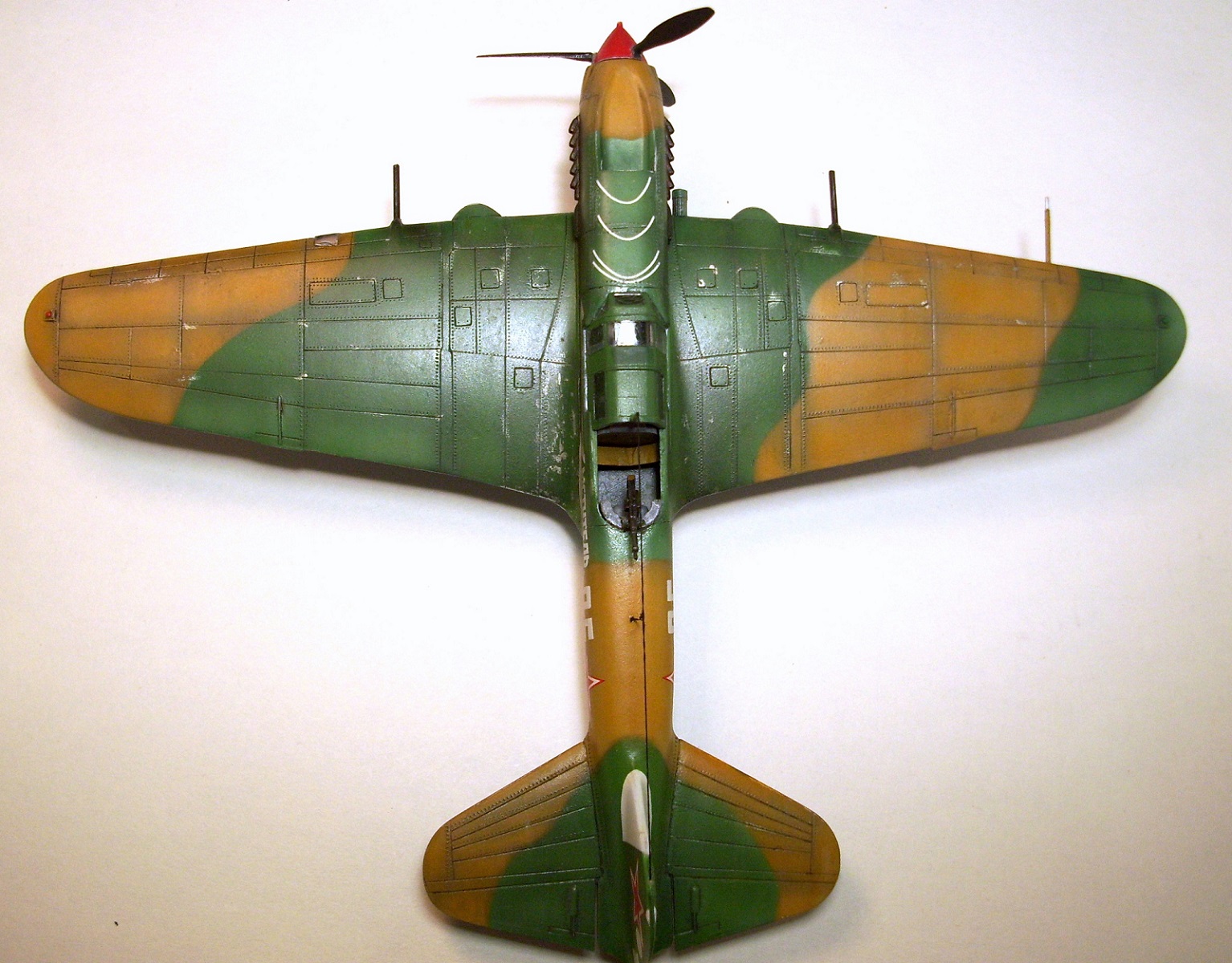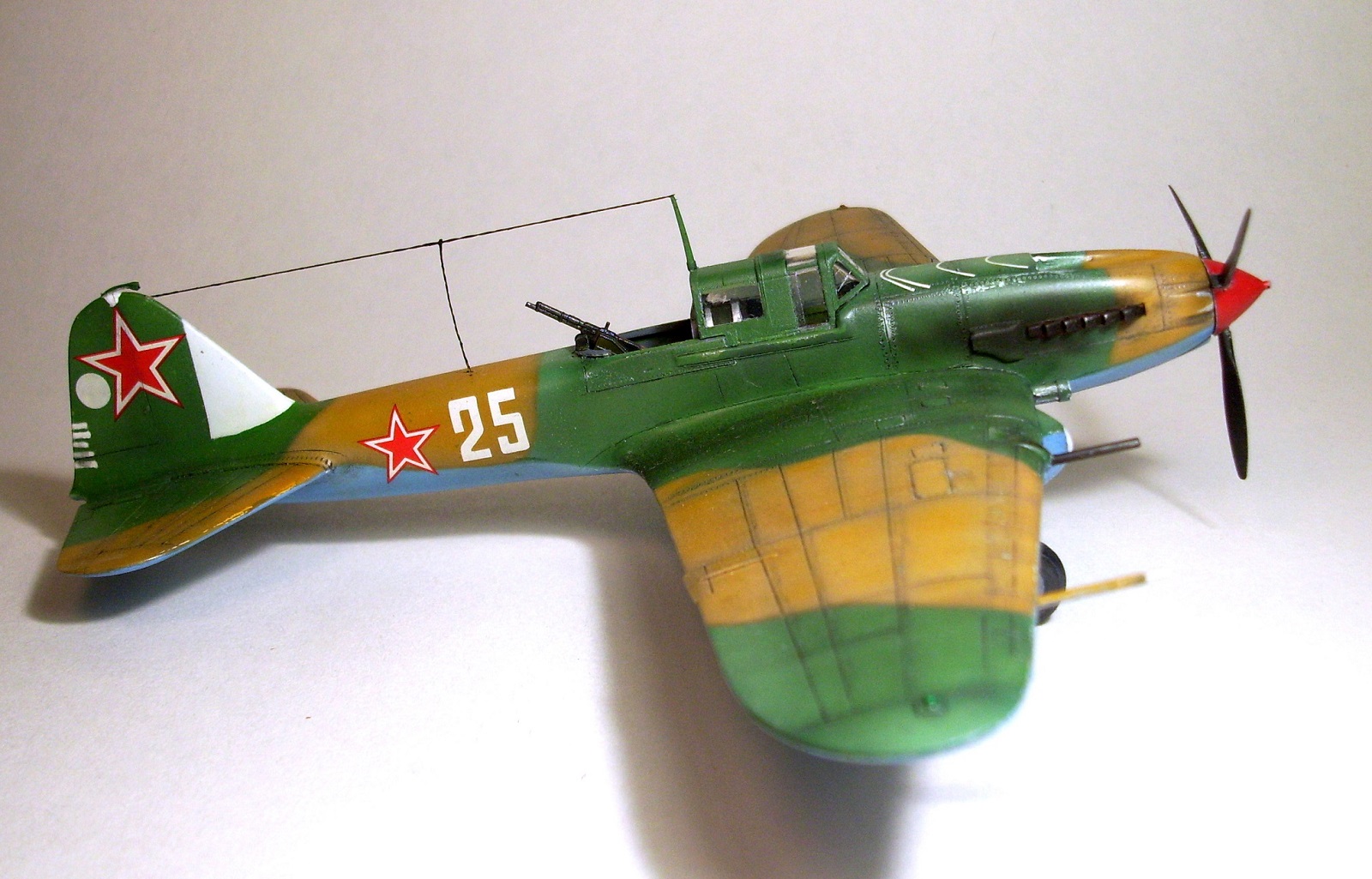 По сборке все штатно, из коробки, единственное что сделал: обрезал козырек фонаря над стрелком, бронелист топливного бака, сиденье стрелка и антену. Окраска: грунтовка, металлик, окраска камо с высветлением, немного обдиринга, футура, декали, футура, смывка, матовый лак, масленые точки, немного обгадинга.