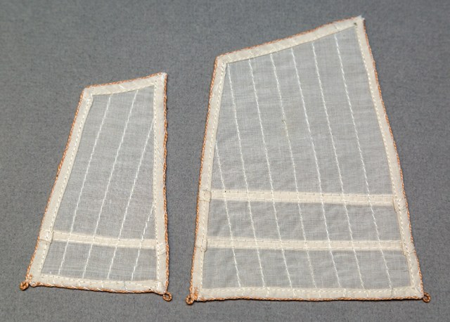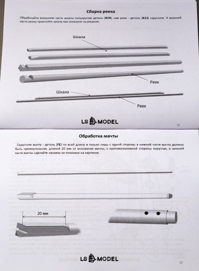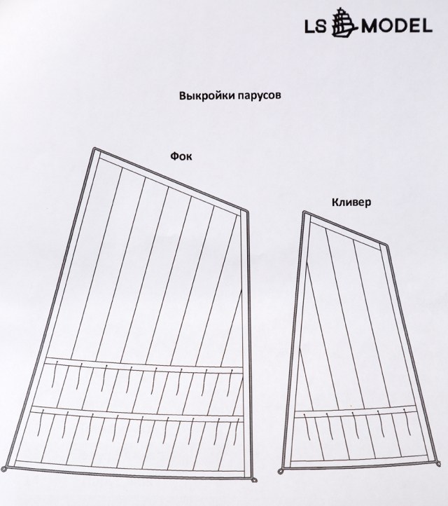 Подробно хочу остановиться на парусах. С одной стороны, это готовые прошитые паруса со шкаторинами, риф-бантами и пришитым ликтросом. С другой стороны, прошивка идёт не по долевой нити ткани, шкаторины и риф-банты широковаты даже относительно шаблонов из инструкции, ликтрос пришит «в охват» а не сквозь, да и в таком масштабе уже можно шить паруса из отдельных полос ткани. В общем, для изкоробочной сборки паруса очень неплохи, а при желании можно сшить свои по шаблону, приведённому в инструкции.