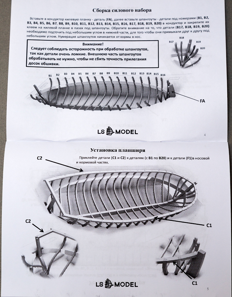 Теперь о самом наборе. Главными особенностями набора, на мой взгляд, являются, во-первых, крупный масштаб – 1/36, а во-вторых, клинкерная обшивка. Насколько я знаю, на момент выхода это был первый отечественный набор с клинкерной обшивкой. Также интересна конструкция стапеля. Он не внутренний, как у шлюпок Милании и Фальконета, а внешний. С одной стороны, так видимо будет удобнее точно и без перекосов собрать набор корпуса. С другой, далее, при наклейке обшивки, набор никак не будет зафиксирован, и скорее всего будет гулять. Кроме того, в дальнейшем, стапель можно будет перевернуть и установить на него корпус, вставив выступы на киле в специальные пазы.