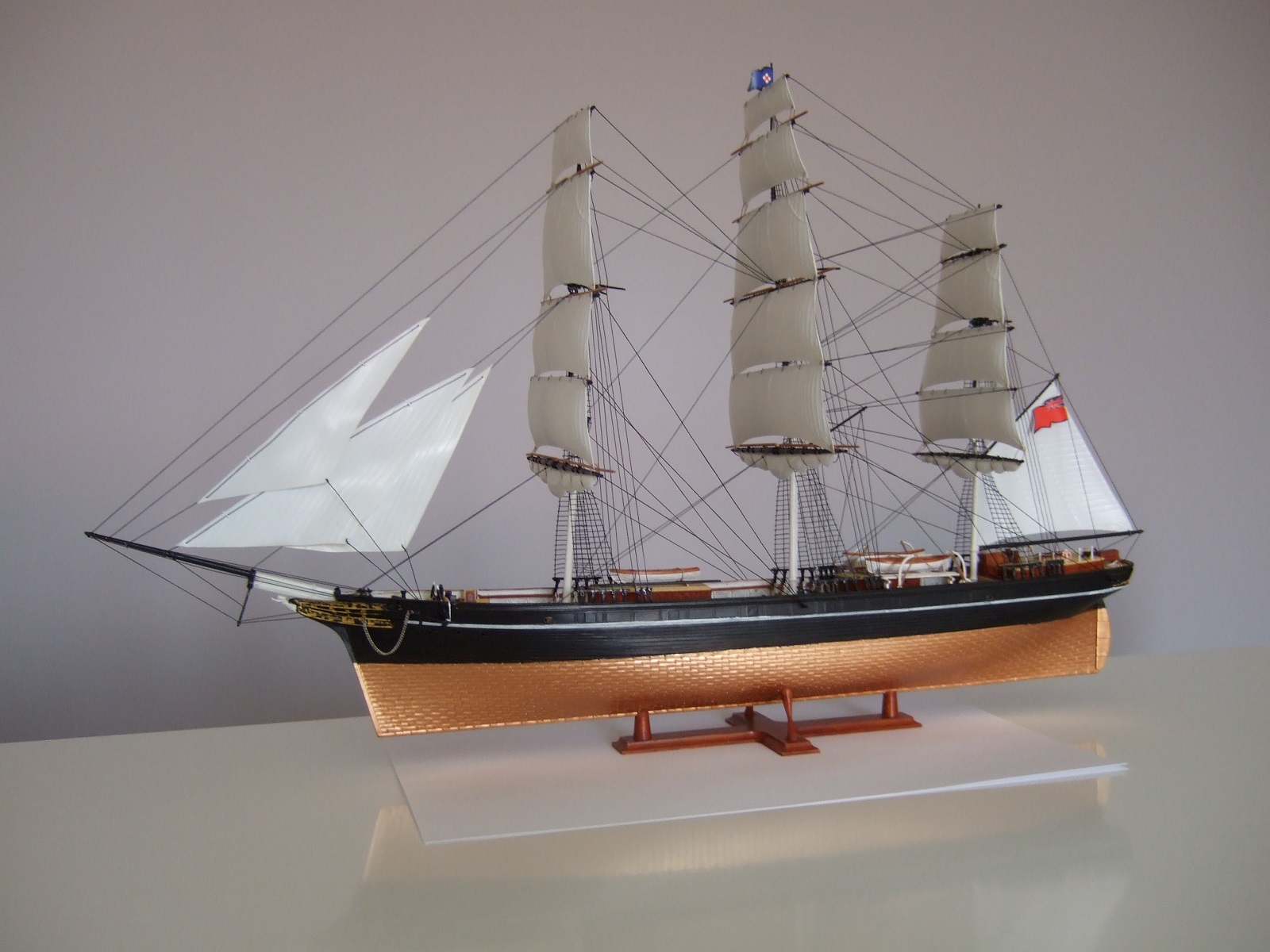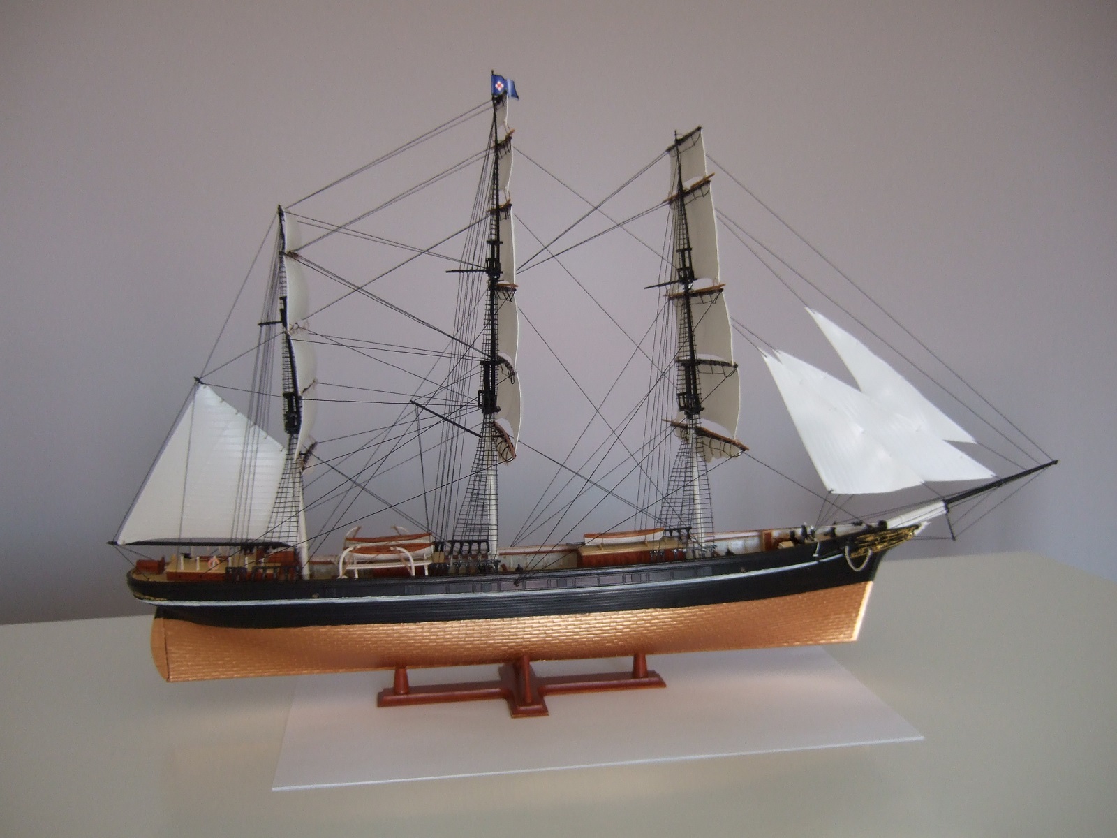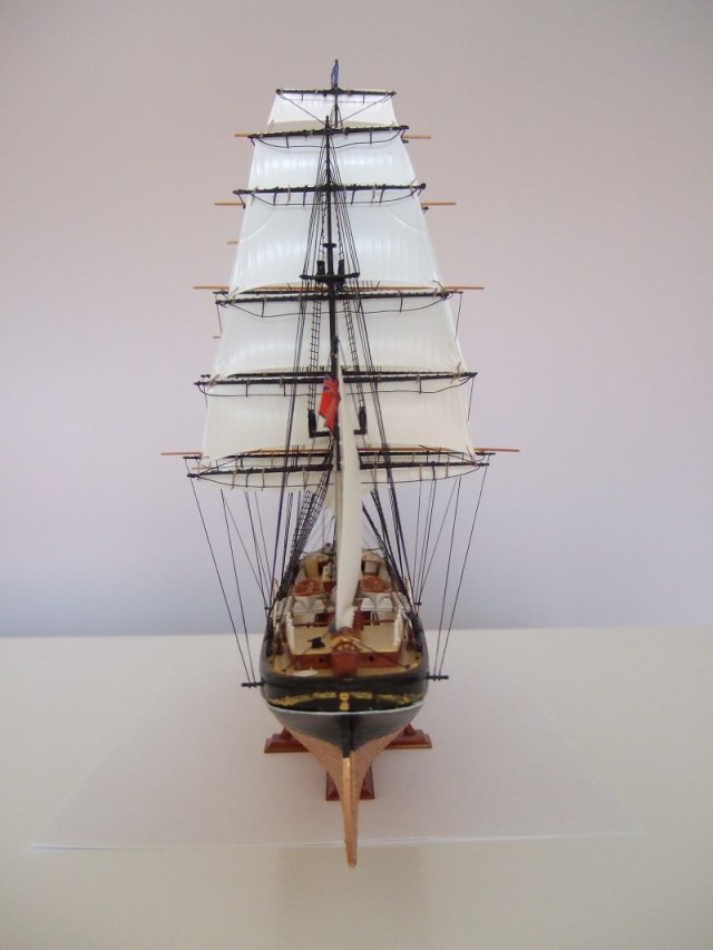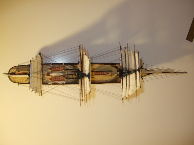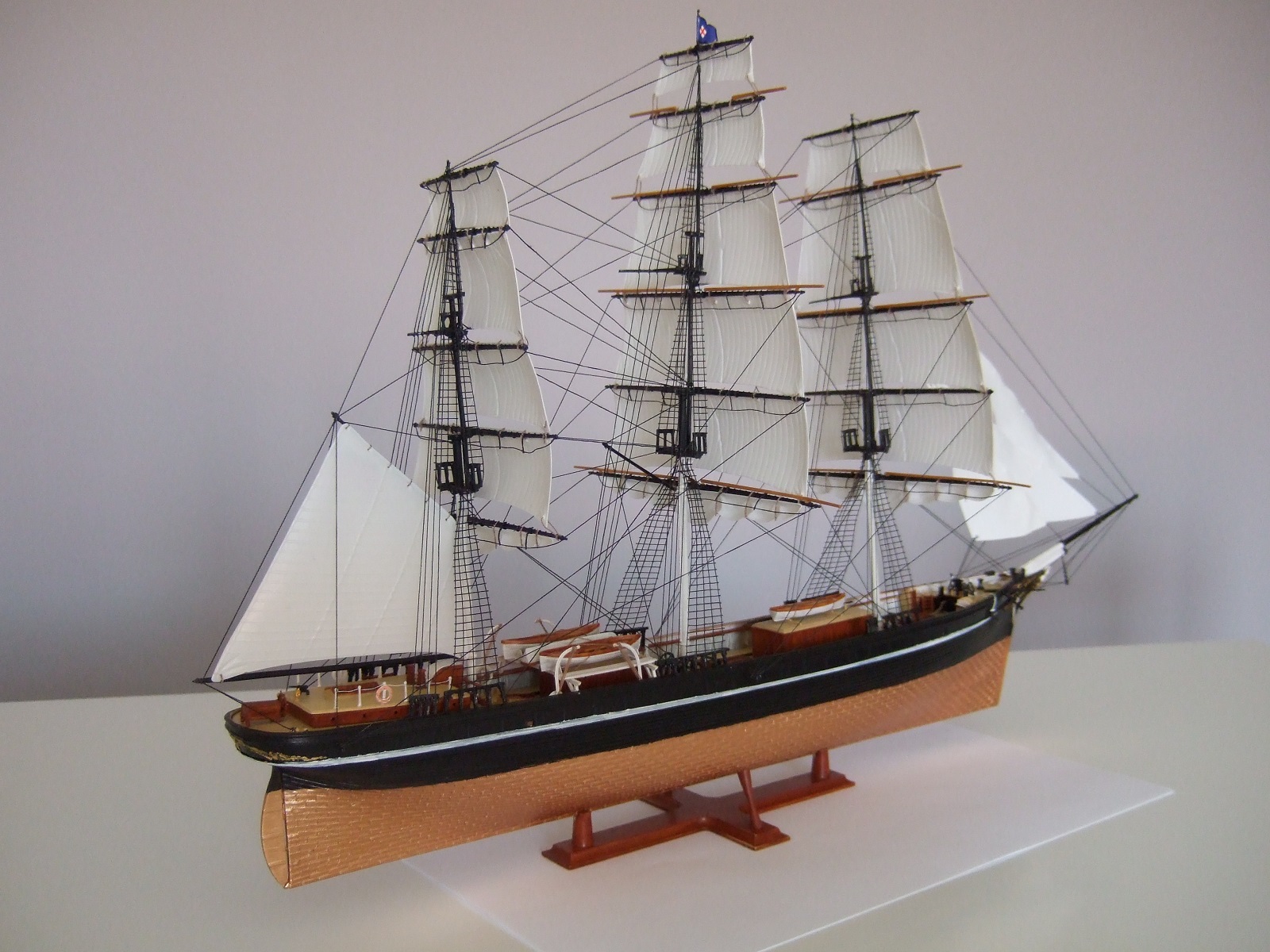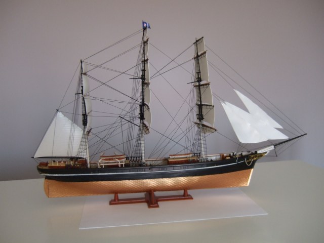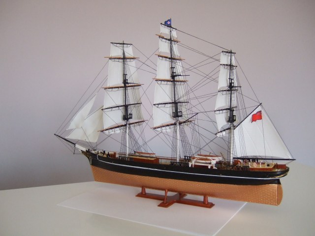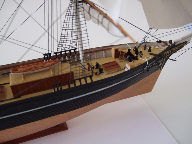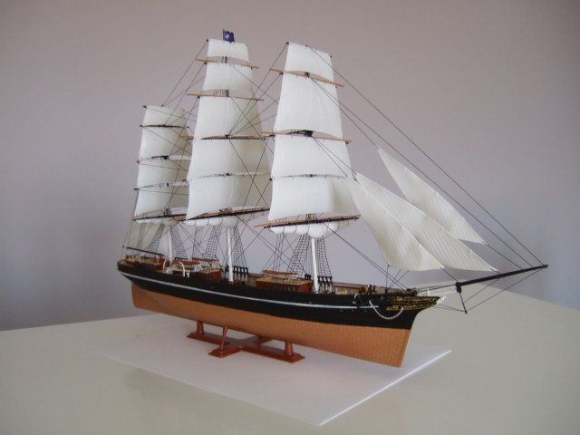 По окраске модель получилась очень смотрибельно. Немного подкачала белая полоса по корпусу. Еще не мешало бы выделить петли руля, затонировать паруса.