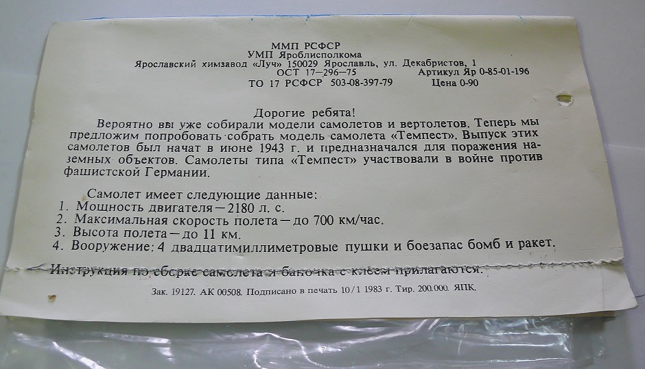 Ярославские модели знают все «Олдскуловцы». В наших краях почему то чаще всего продавались изделия именно Ярославского «Луча». Темпесты в магазинах появлялись всегда вместе с Тандерболтами и Британиями (в 96м). Иногда Тандерболты были даже в добротных НОВОвских коробках. Нововских коробок или лепестков для Темпеста я ни разу не видел. Да и были ль они вообще? (Ау, уважаемый Саурон!). Но чаще модели шли в таком классическом виде – Пакет и стремноватый лепесток прошитый нитками на швейной машинке. Хотя… Такой «лепесток» для советских времен можно даже назвать прогрессивным. Указано не только название, но и дана какая-никакая историческая справка.