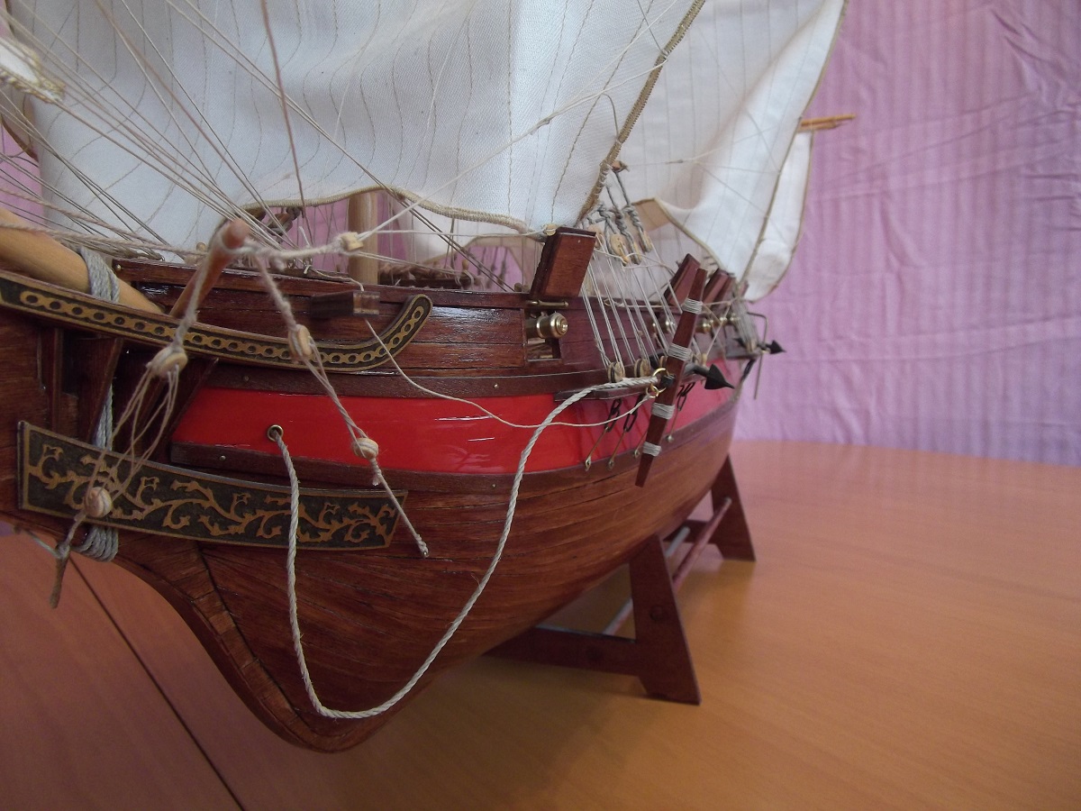 В целом неплохая модель. Что мне бросается в глаза - стоячий такелаж стоило сделать темнее бегучего, не хватает пушечных талей. Странно заведены реванты парусов (через лисель- спирты), не увидел гитовы. Если реи нижних парусов опущены специально, то мне кажется зря - паруса слишком низко сидят и поскольку они не имеют формы, то смотрибельности не добавляют. Не очень нравится блестящий металл орудий, петель и т. д. , но это на любителя