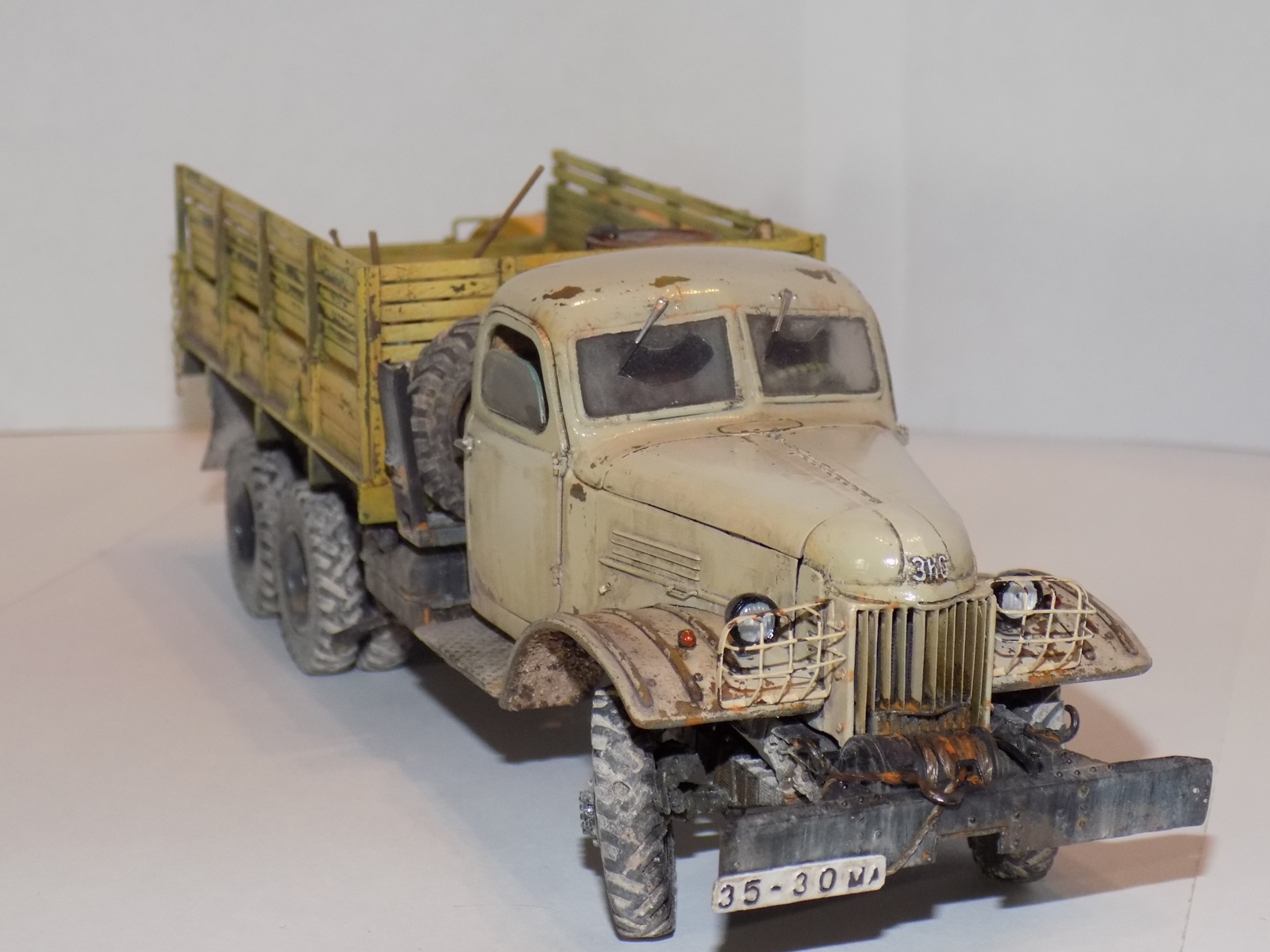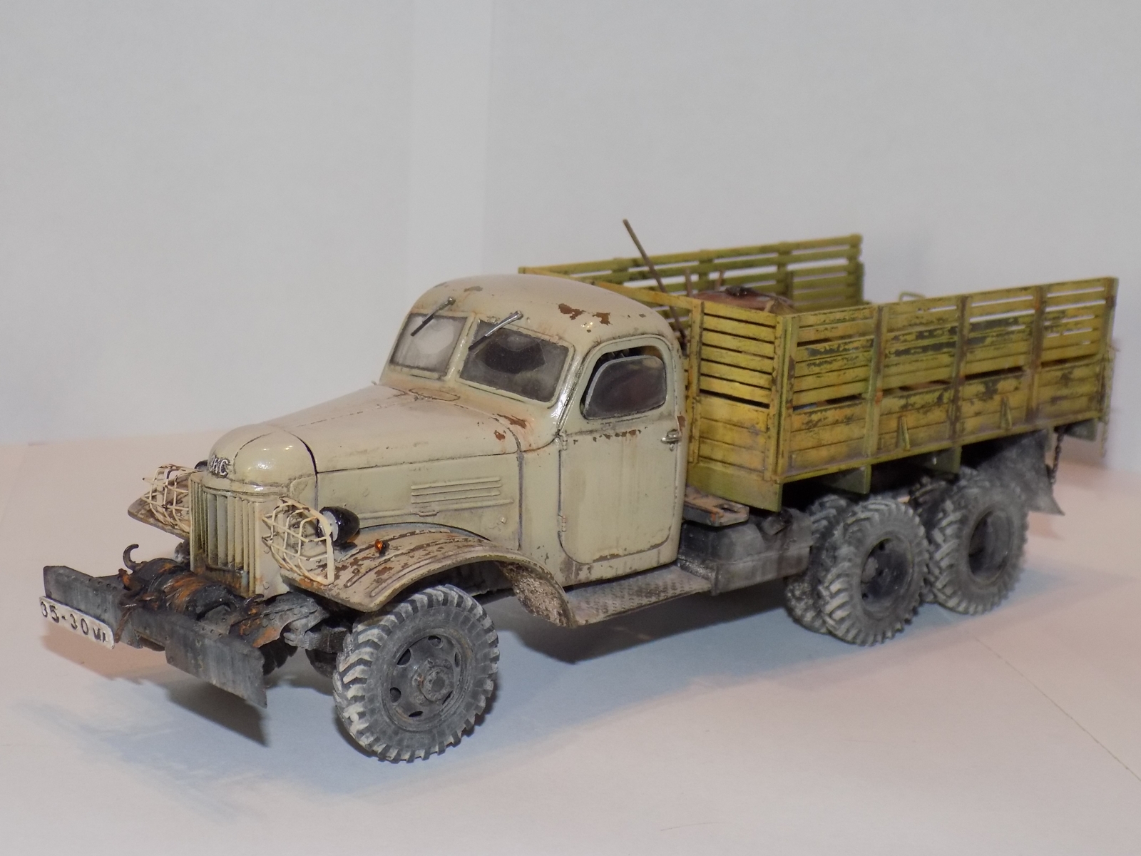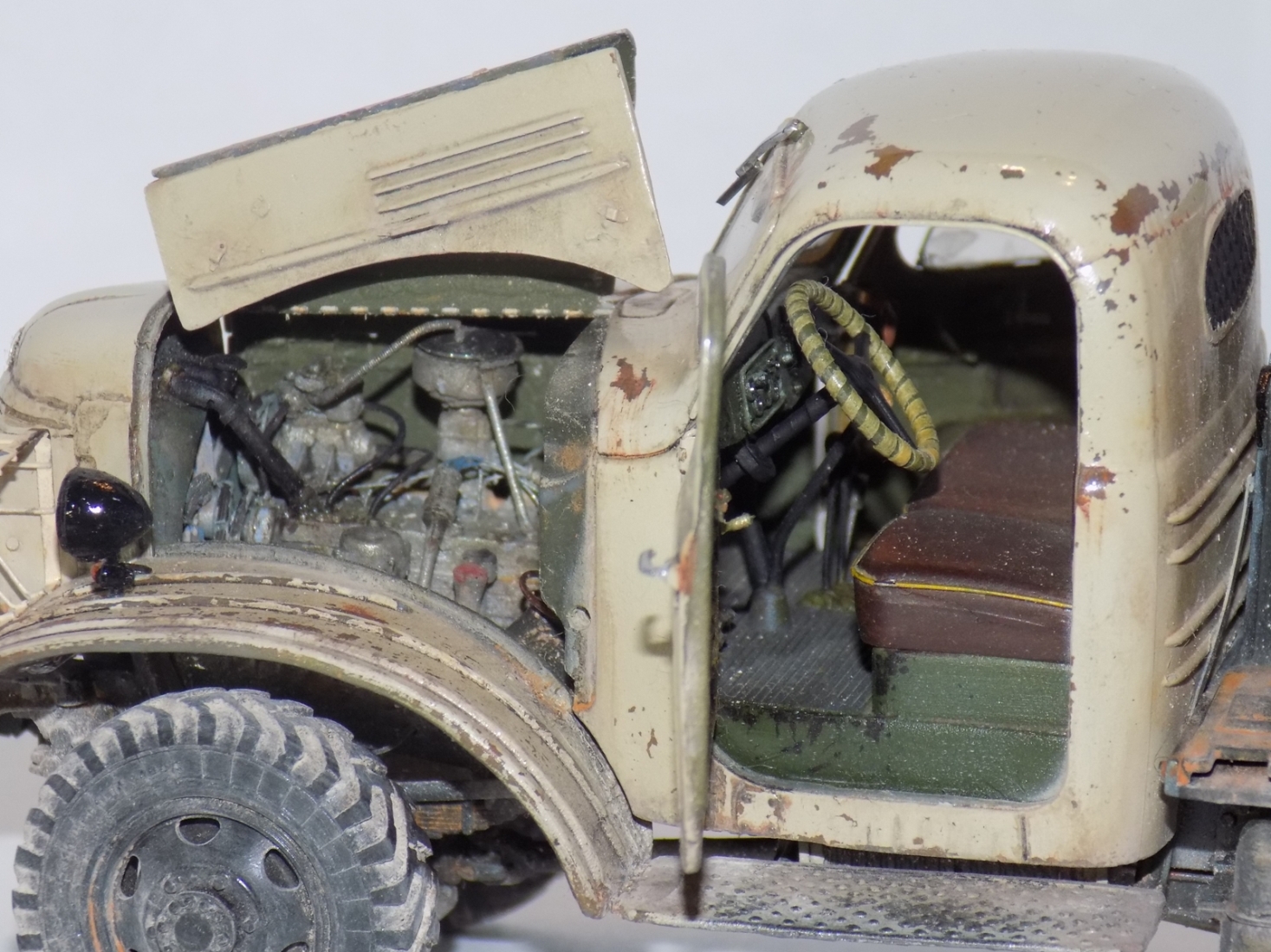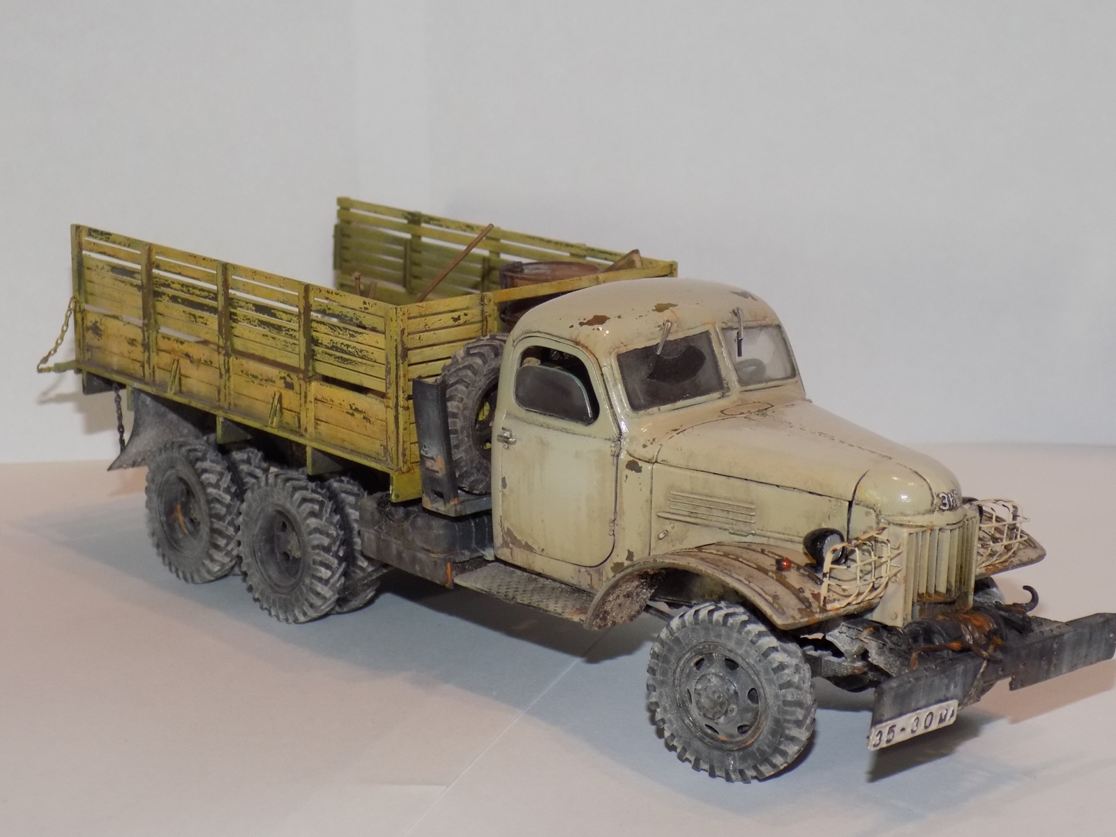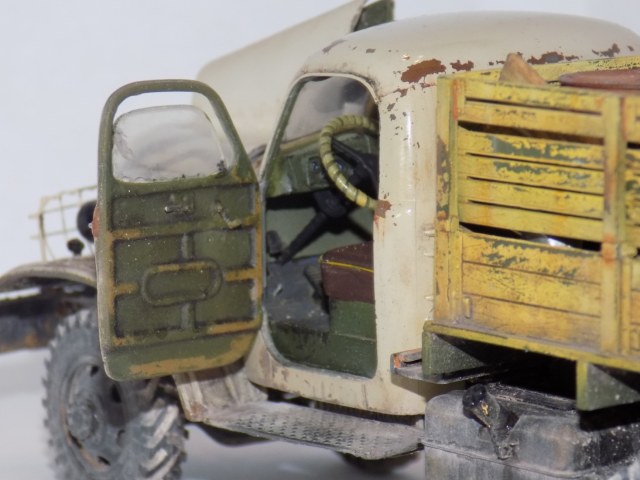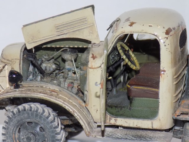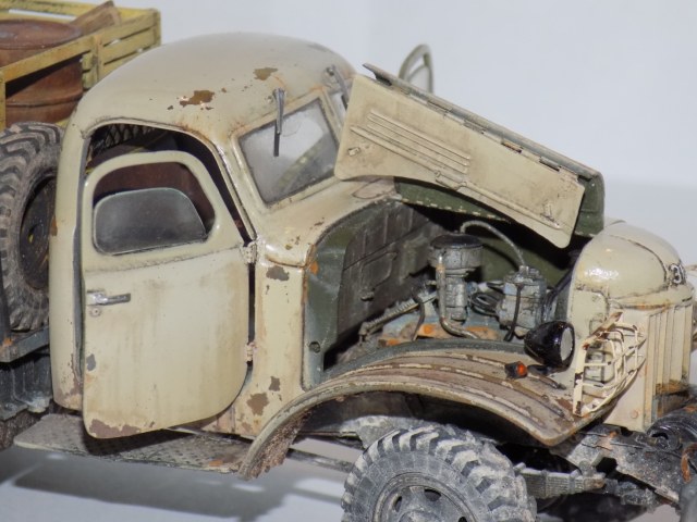 - За основу была взята модель ЗиС'а от Звезды. дополнил конверсией 151А и бочкой от макета. Решил сделать рабочие двери, капот, задний борт кузова. Переделал решетку, так как родная была отлита отвратительно. Детализировал двигатель. Воспроизвел топливные магистрали, а так же воздушные. На бочке перенес заливную горловину и сделал короб. Фары использовались от эльфа.