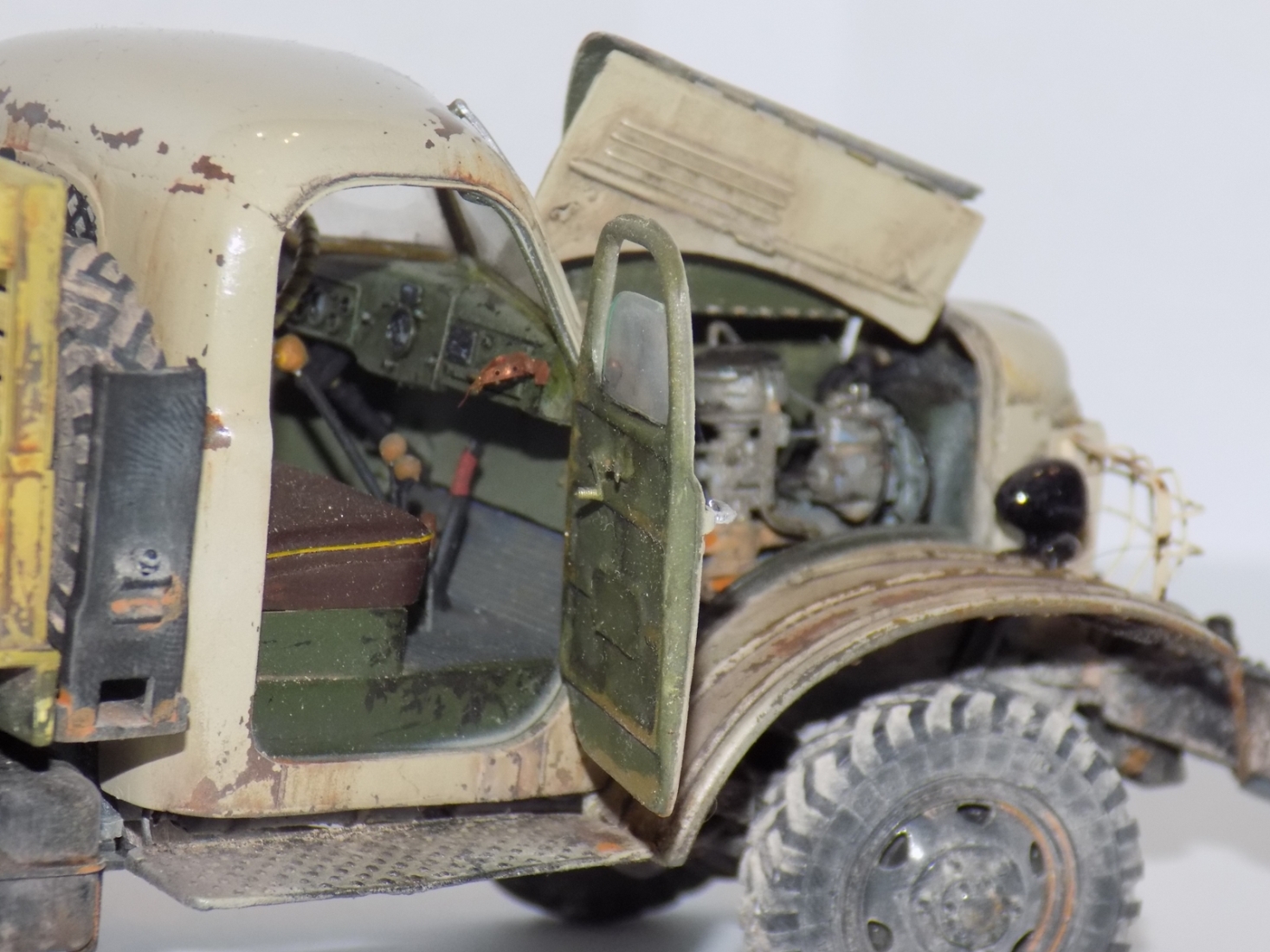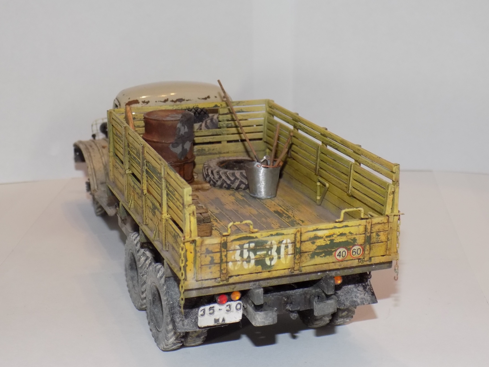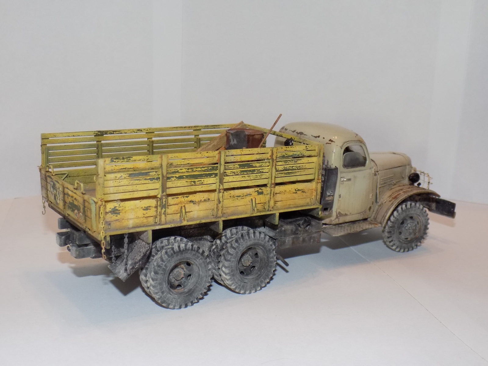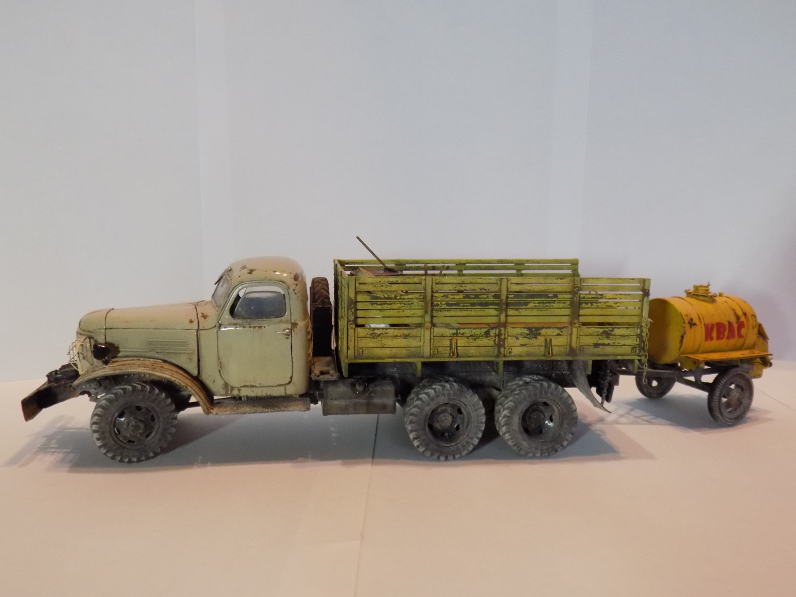 - За основу была взята модель ЗиС'а от Звезды. дополнил конверсией 151А и бочкой от макета. Решил сделать рабочие двери, капот, задний борт кузова. Переделал решетку, так как родная была отлита отвратительно. Детализировал двигатель. Воспроизвел топливные магистрали, а так же воздушные. На бочке перенес заливную горловину и сделал короб. Фары использовались от эльфа.