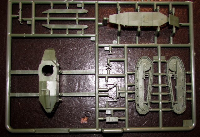 Модель занимает два литника. На первом - башня, вооружение и часть мелочевки, на другом - все остальное. Литье качественное, с минимальным микрооблоем. Клепка в наличии.