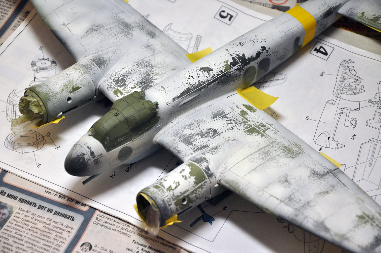 Решил делать зимнего немца. Технология проверенная - на камуфляж нанес лак для волос, затем неравномерно задул белым тамиевским акрилом XF-2 и местами протер смоченной в теплой воде зубной щеткой.