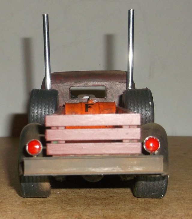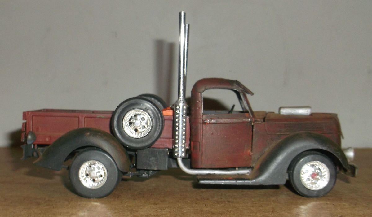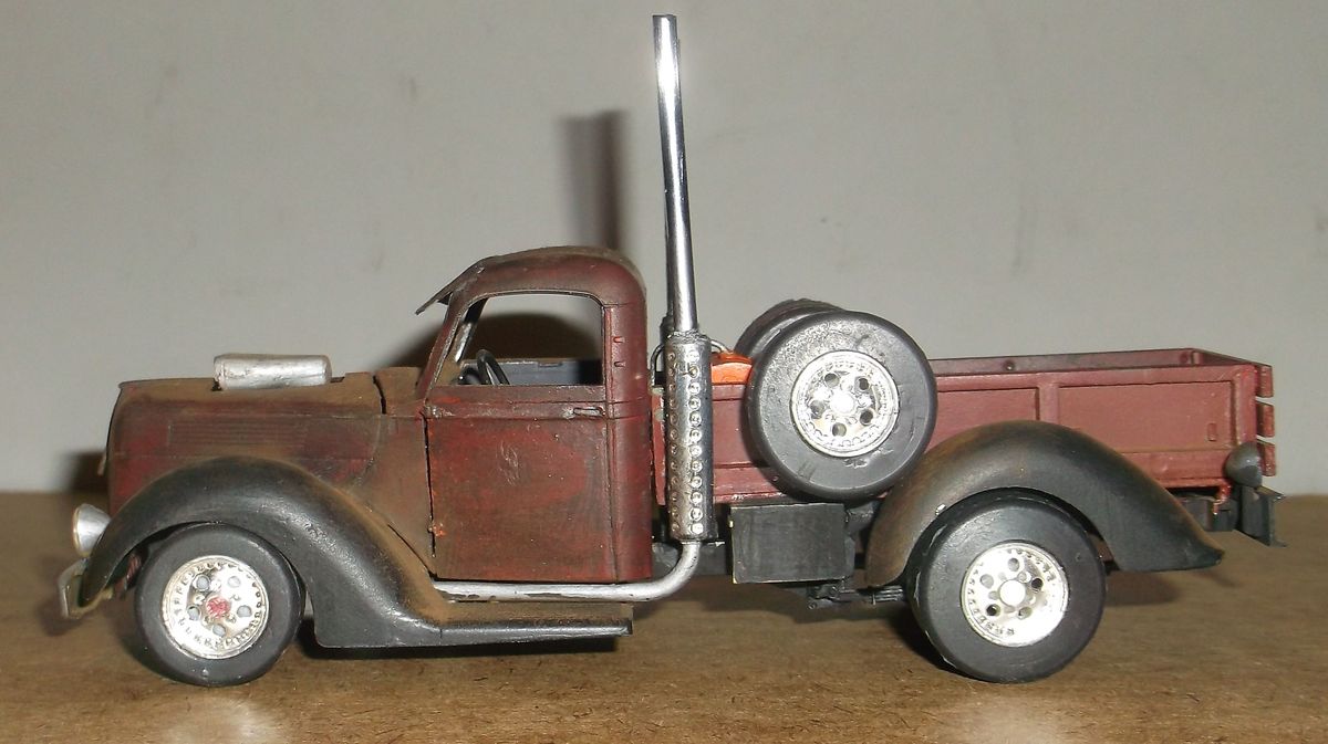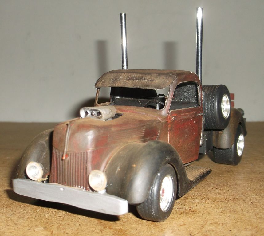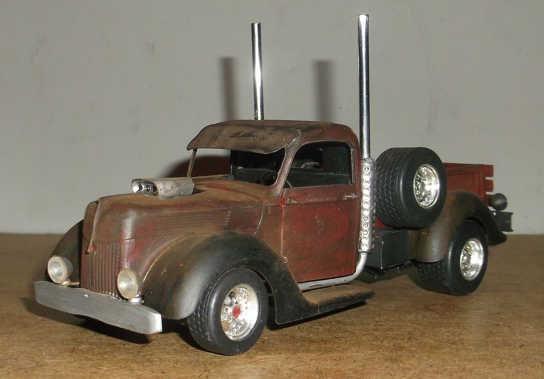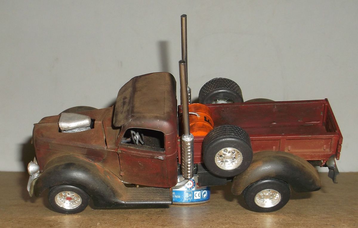 В стиле Rat-Rod ржавые поверхности покрывали лаком для их сохранности. Из-за долгого стояния под открытым небом лак местами облез, а где остался, сохранил свой блеск. Впрочем, это всё отмазки. Наверное я ещё с этим пикапчиком поработаю. Помну и оторву чего-нибудь.