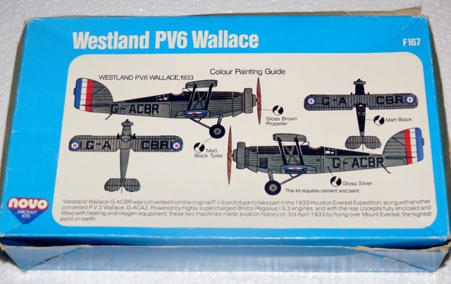 Как и другие ФРОГовские модели из серии «Рекордные самолеты», этот Уоллес, мне кажется, нужно собирать и красить в том виде, в котором предлагает ФРОГ. В смысле, не нужно его перепиливать в вооруженный вариант или лепить из него Уипити. Надо делать Именно как тот самолет, который летал над Эверестом. И тут начинаются заморочки. Заморочки по поводу варианта окраски. Похоже и сами создатели модели толком не разобрались – в каком же все таки виде Уоллес летал над Джомолунгмой и делал снимки вершины. Заморочки разработчиков видны и на коробке. На крышке – самолет с пулеметной установкой и «лаптями на колесах» – Вроде бы Уипити, но… с двигателем и в окраске Уоллеса. На подложке коробки – более «правильный» самолет с гермокабиной фотографа, без «лаптей», но… С британскими кокардами на плоскостях.