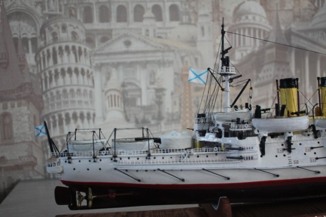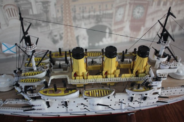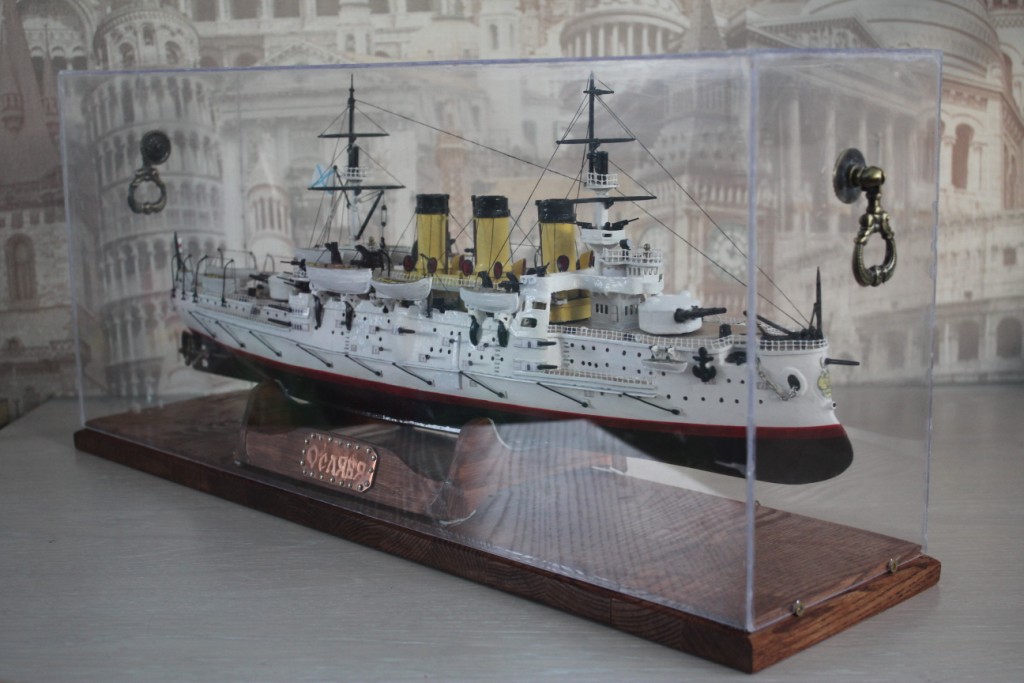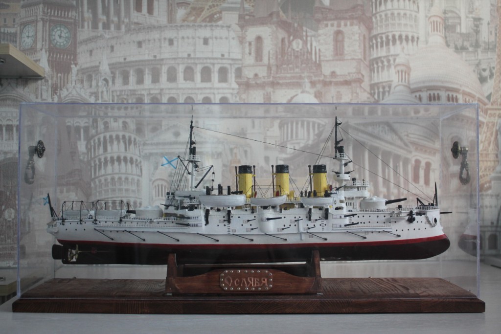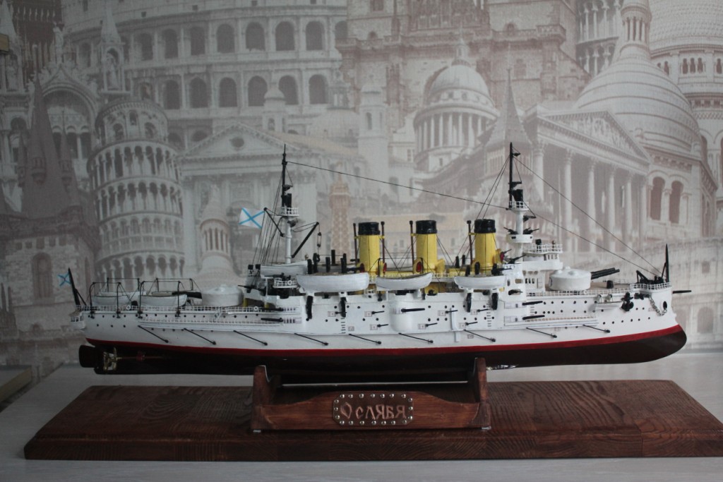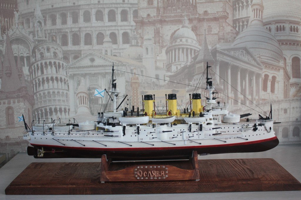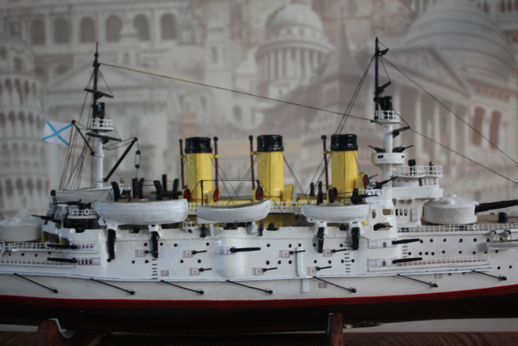 На этом история модели ЭБР не закончилась. "Ослябя" простоял дома, в базовом порту совсем не долго-всего пару месяцев. Кто то из друзей проговорился и хозяин одной антикварной лавки выкупил у меня модель для интерьера магазина. Совсем недавно я попытался было вернуть "Ослябя" , однако броненосца там уже не оказалось - перепродали, а куда - не известно.