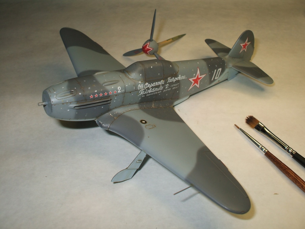 По покраске все как всегда: акриловый сильвер от HobbyColor, футура, лак для волос, прешейдинг, камуфляж намешан из акрила от TAMIYA, мытьё жесткой кистью под проточной водой для имитации сколов по металлу, кисточкой нанесены сколы ЛКП на плоскостях, футура, декали, смывка, матовый лак от HobbyColor, масляные точки, смывка выборочно, финишное покрытие матовым лаком.