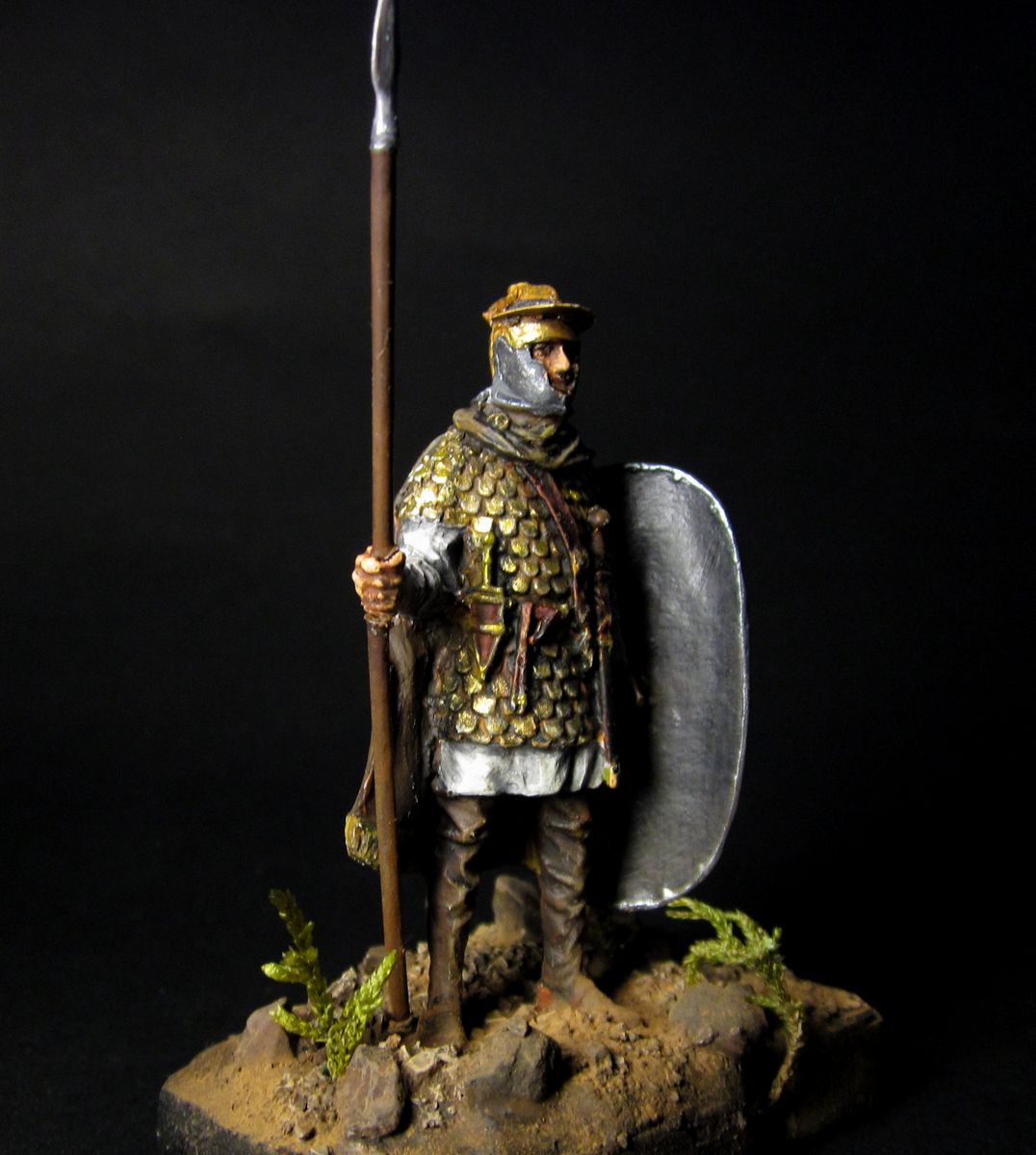 Преторианский гвардеец времён правления Септимия Севера. Довольно приятная фигурка. Заменил копьё. Щит - как обычно, фрихенд. Подставка самодельная. Окраска - акрилы Звезды, Тамии.