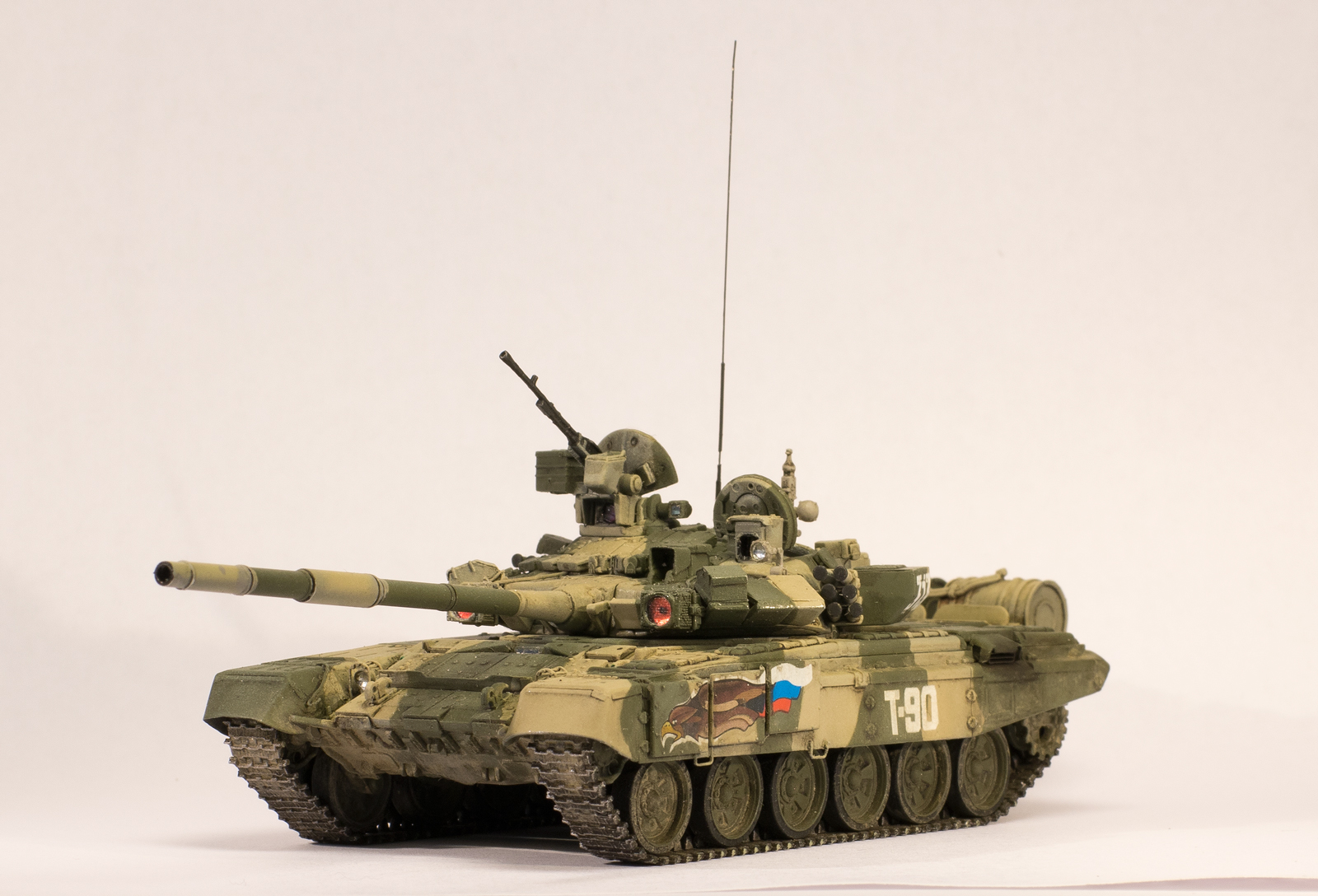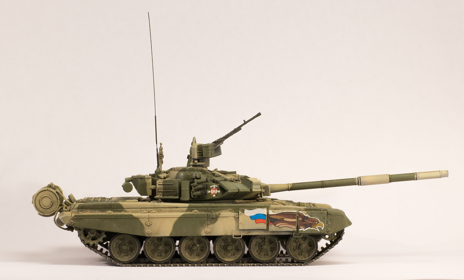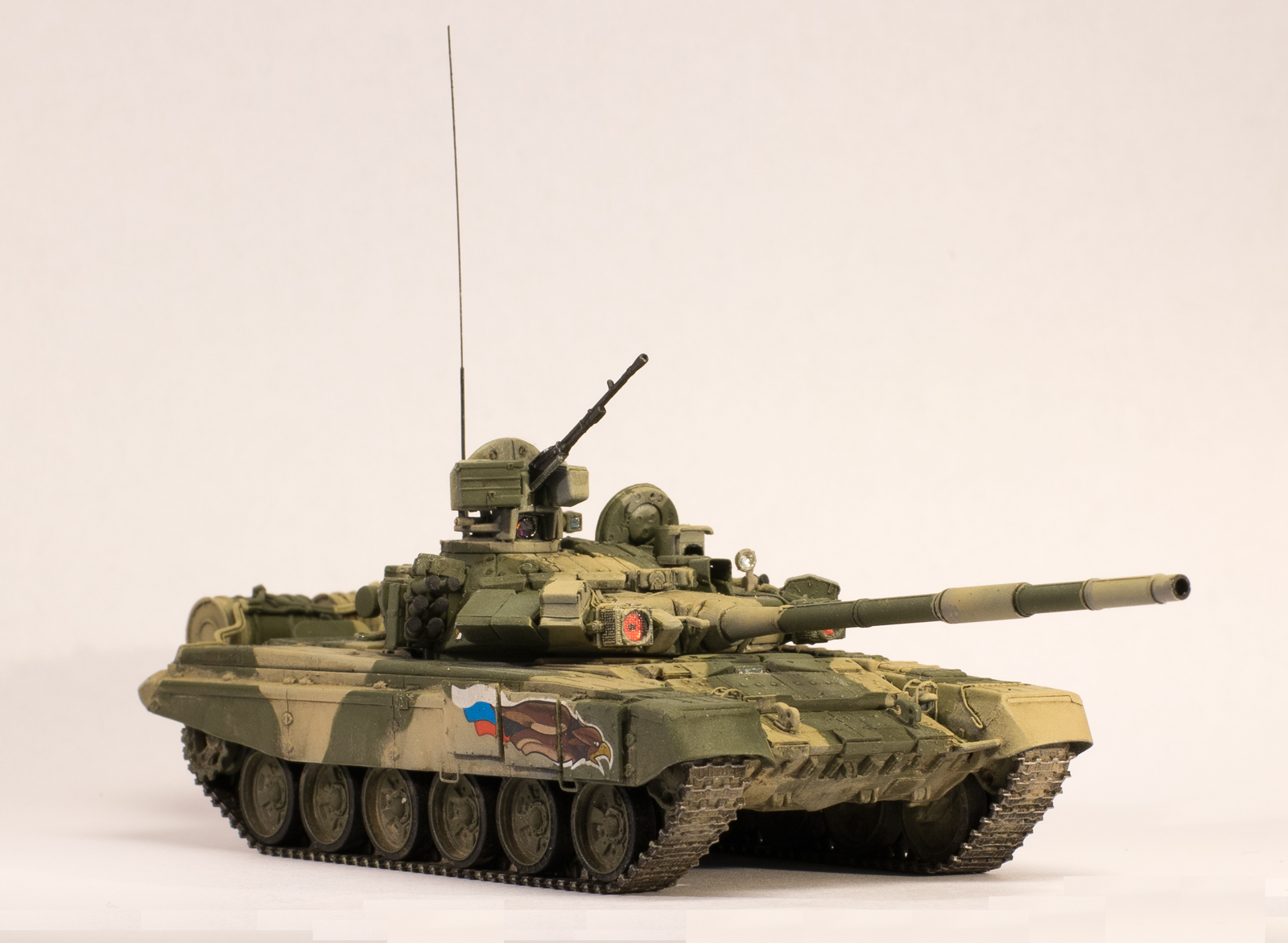Из-за своей рассеянности строил непоследовательно в плане выбора оригинала, т.е. сначала прототип был один (даже не вспомню какой), затем другой (день Танкиста, Кубинка, 2000г.). Вследствие этого у модели оказался уже обновленный выхлоп, изготовленный из пивжести. Поэтому привязка к оригиналу только поверхностная. Покраской старался попасть в оригинал. Маскировал патафиксом, красил акрилами vallejo, лёгкая смывка маслом abteilung, пигменты vallejo. Декали от modelcollect, орлы похожи только с большой натяжкой, да еще и у левого смещен белый контур. Я даже второй комплект заказал в надежде что левый орел не будет смещен, а оказалось у них везде они со сдвигом белого контура, пришлось использовать какой есть, не смог бы кисточкой вывести сам.
