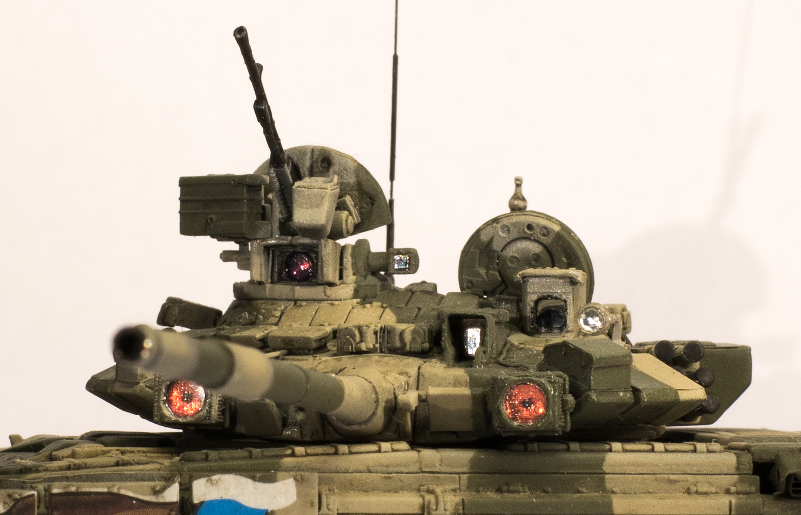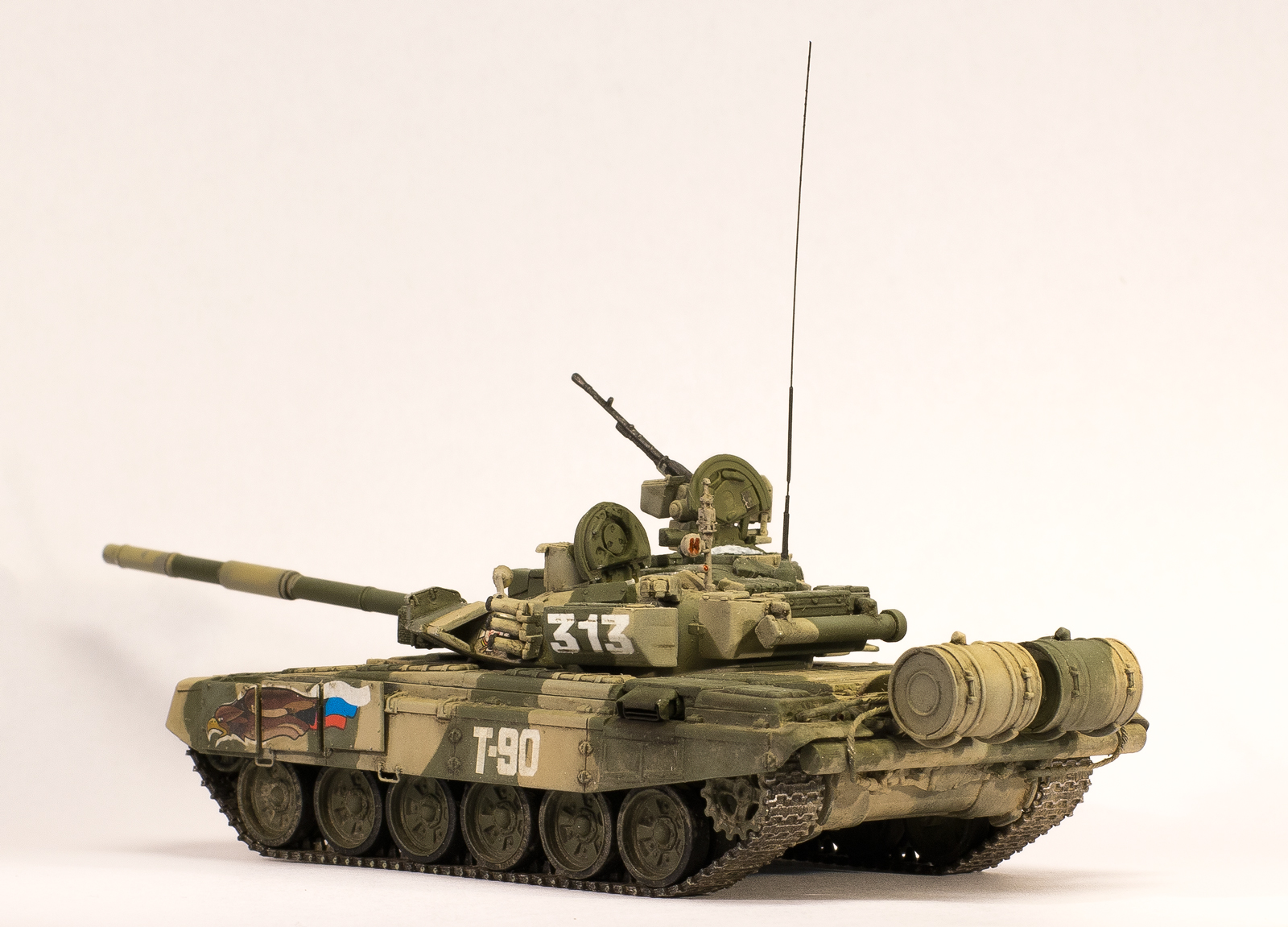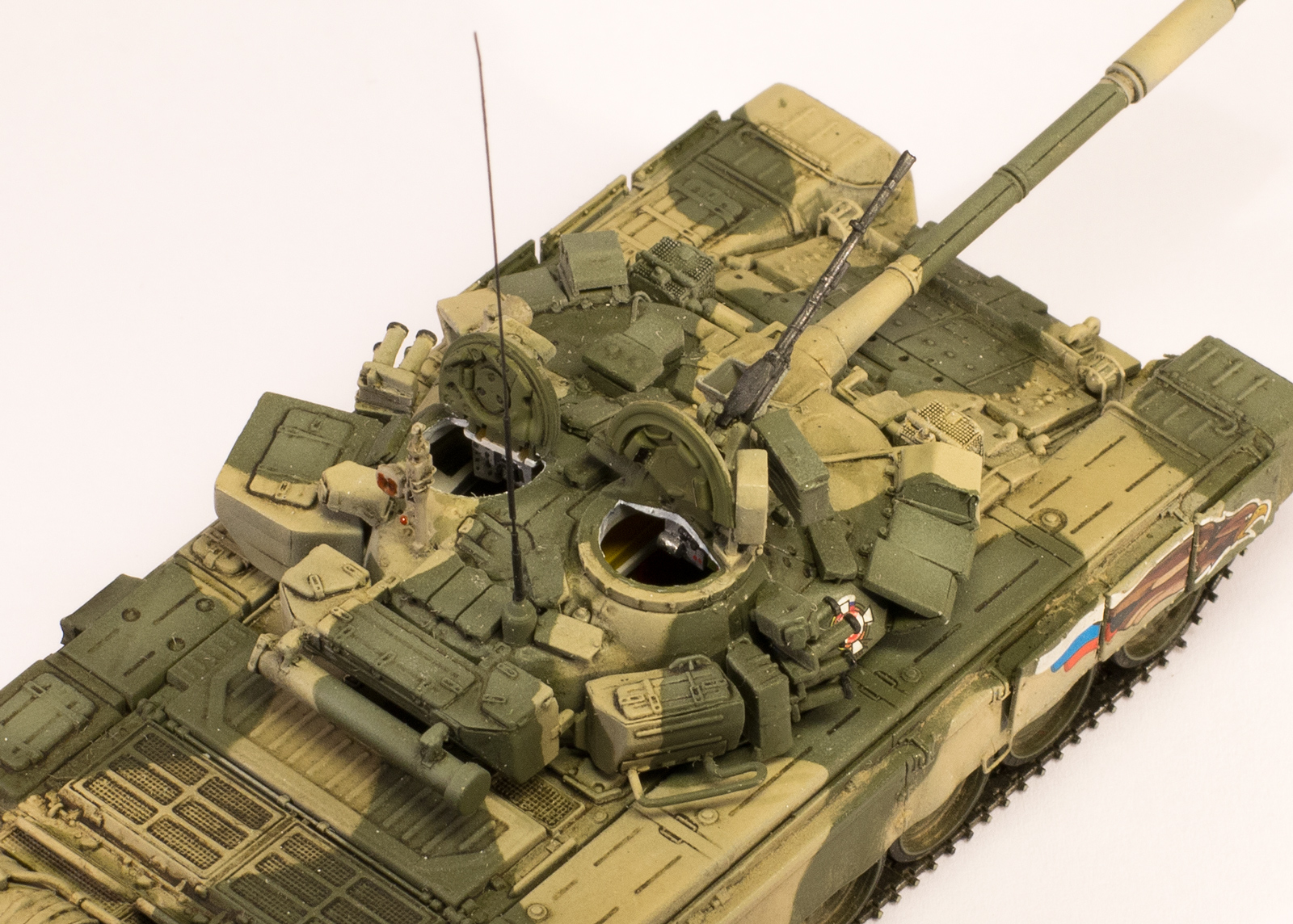 Из-за своей рассеянности строил непоследовательно в плане выбора оригинала, т.е. сначала прототип был один (даже не вспомню какой), затем другой (день Танкиста, Кубинка, 2000г.). Вследствие этого у модели оказался уже обновленный выхлоп, изготовленный из пивжести. Поэтому привязка к оригиналу только поверхностная. Покраской старался попасть в оригинал. Маскировал патафиксом, красил акрилами vallejo, лёгкая смывка маслом abteilung, пигменты vallejo. Декали от modelcollect, орлы похожи только с большой натяжкой, да еще и у левого смещен белый контур. Я даже второй комплект заказал в надежде что левый орел не будет смещен, а оказалось у них везде они со сдвигом белого контура, пришлось использовать какой есть, не смог бы кисточкой вывести сам.