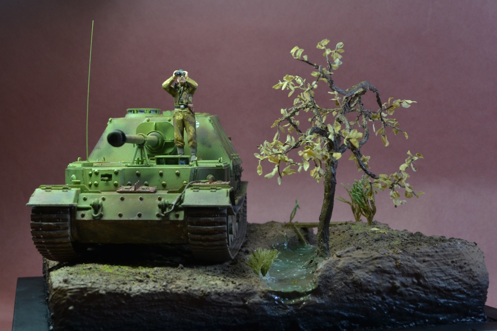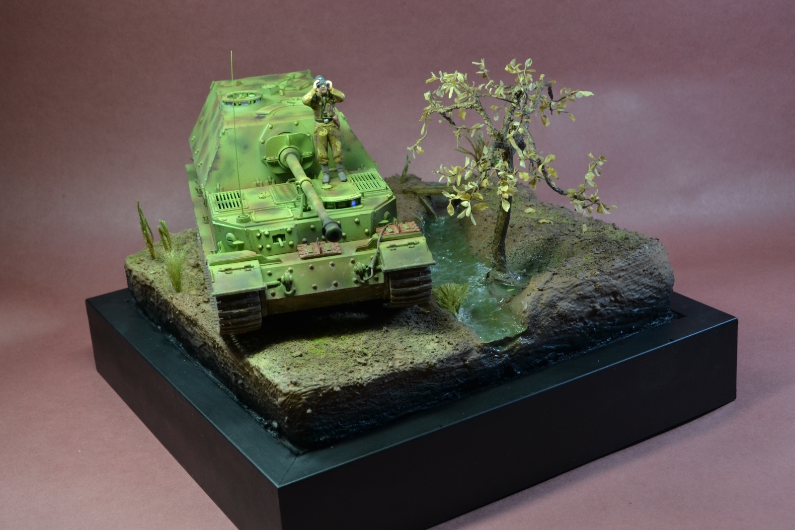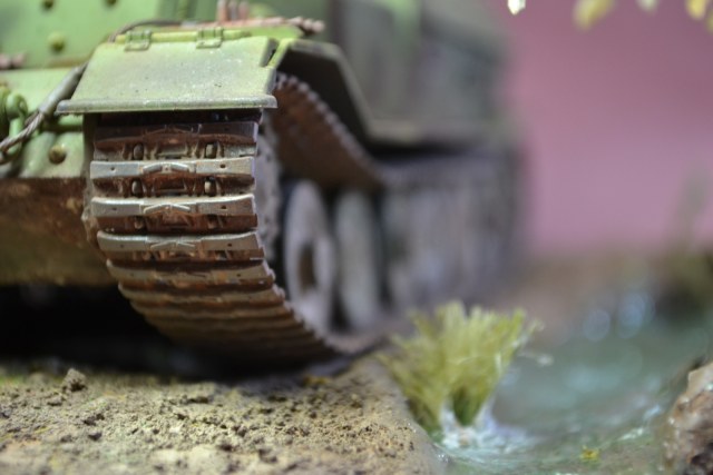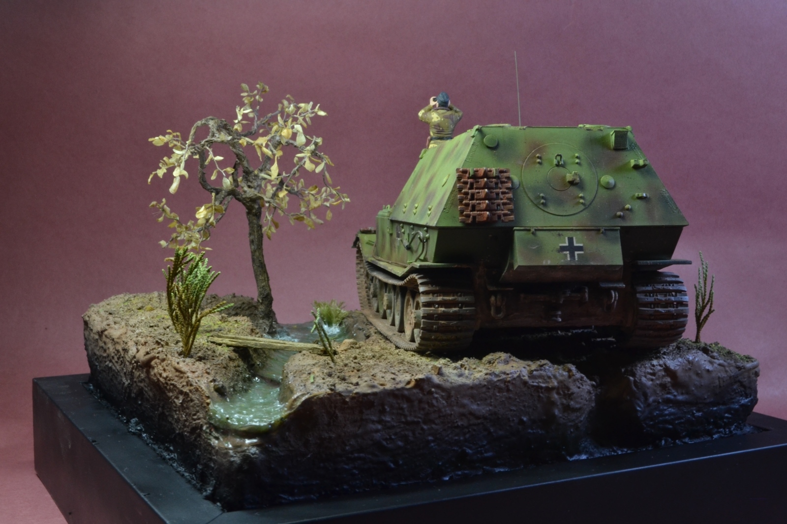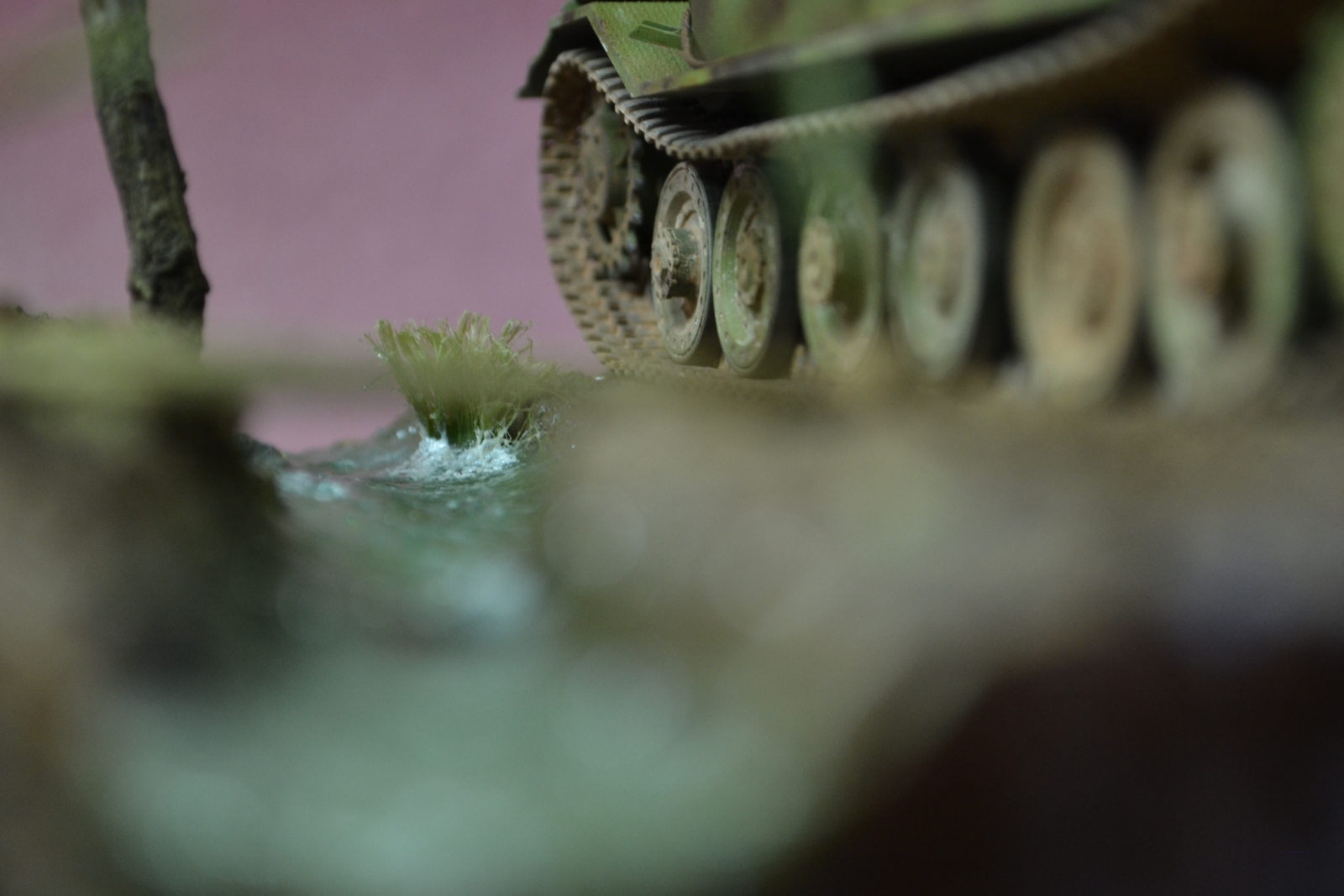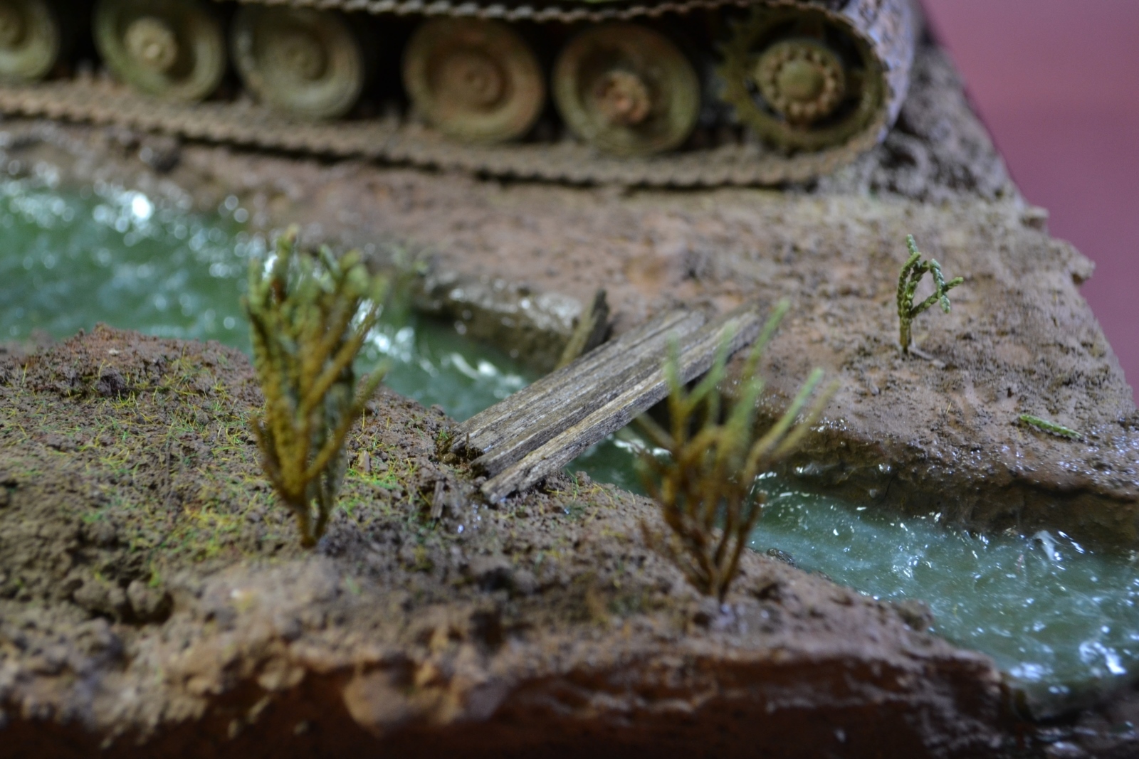 По работе, как уже и говорили, подставка, ручей, растительность на отлично, в покраске машины замшелости не углядел, всё сделано как надо(ИМХО)... но вот цвет, и ещё более усиливающий цвет фона ассоциируется не как со слоном 2й Моровой, а скорее с Вахаммер, что то такое космическо-потустороннее... камок на такисте тоже понравился.