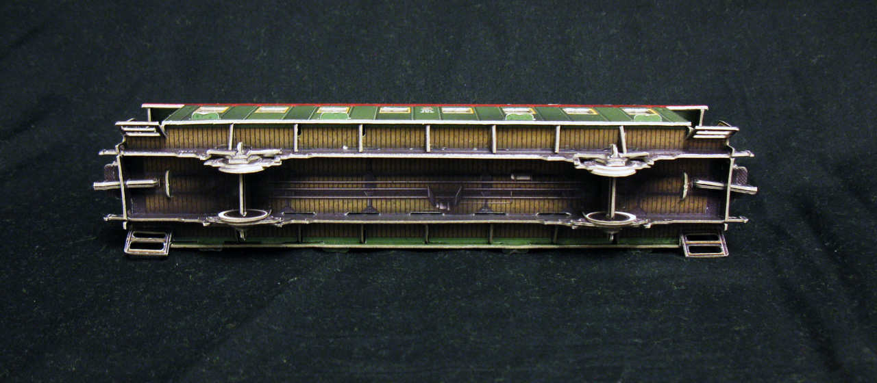 Недостатки: края деталей «лохматятся», соединение на трении не везде надёжное. После отделения деталей остаются заметные заусеницы, которые трудно убрать. И, наконец, не предусмотрено никаких рельс, а без этого ж/д техника не смотрится.
