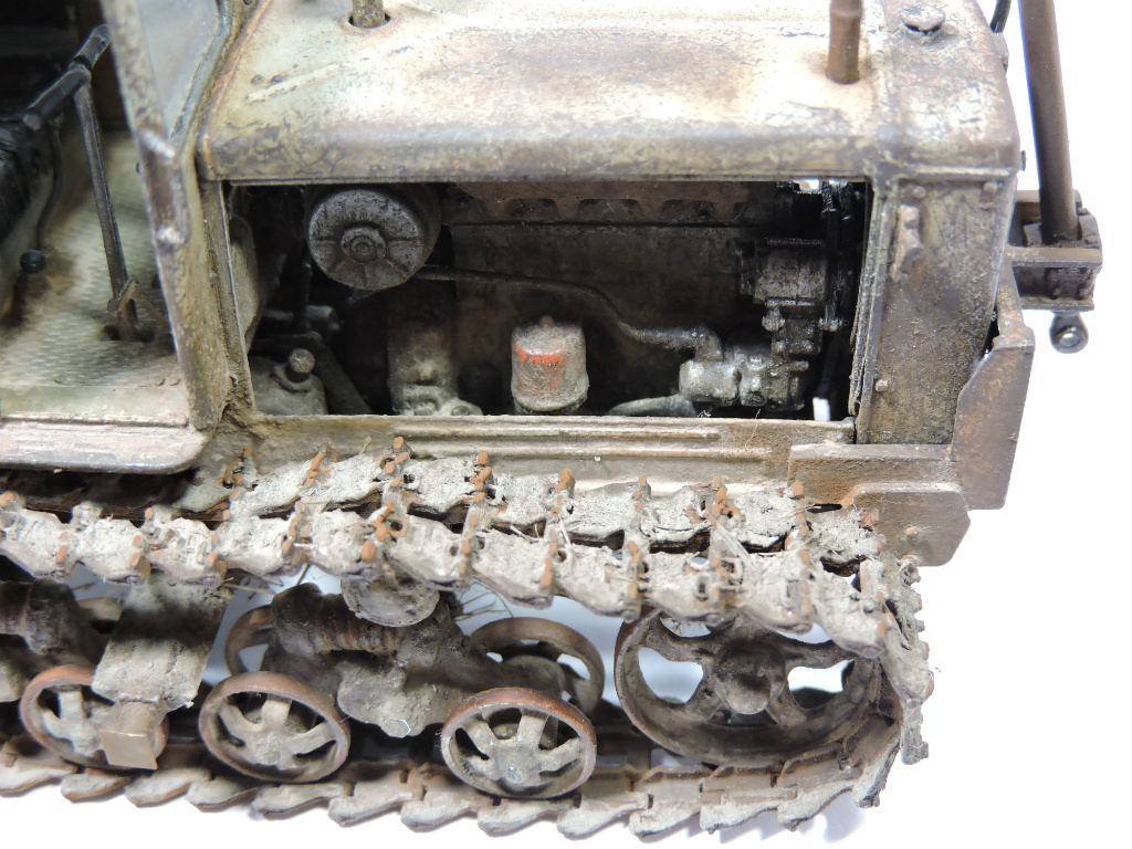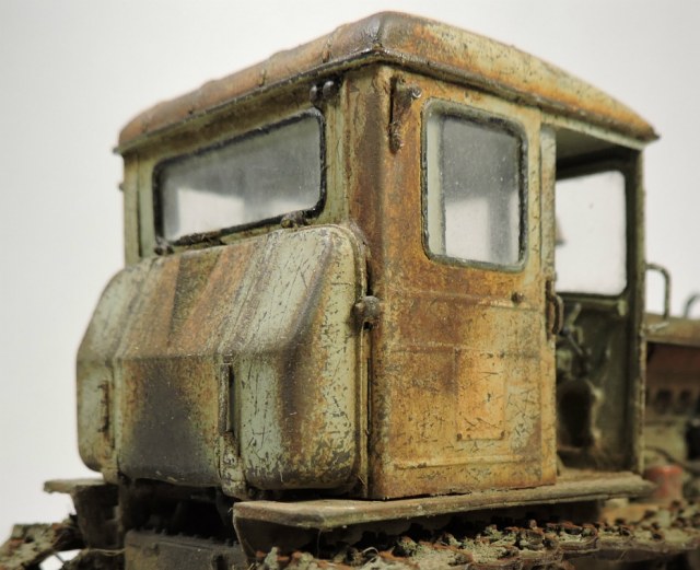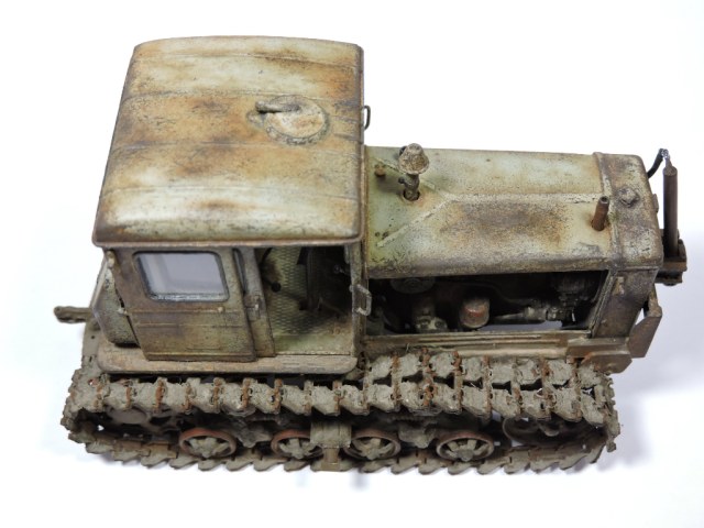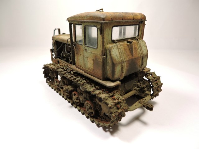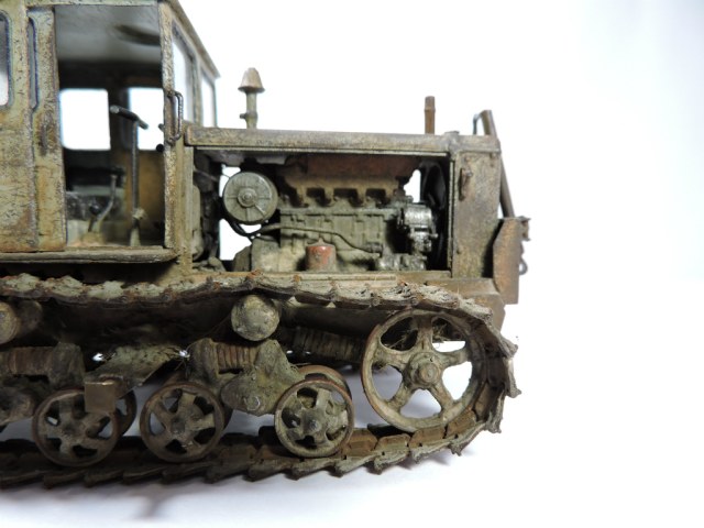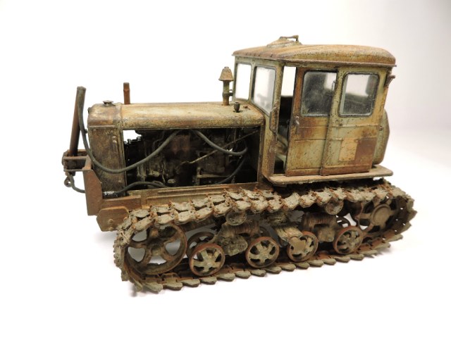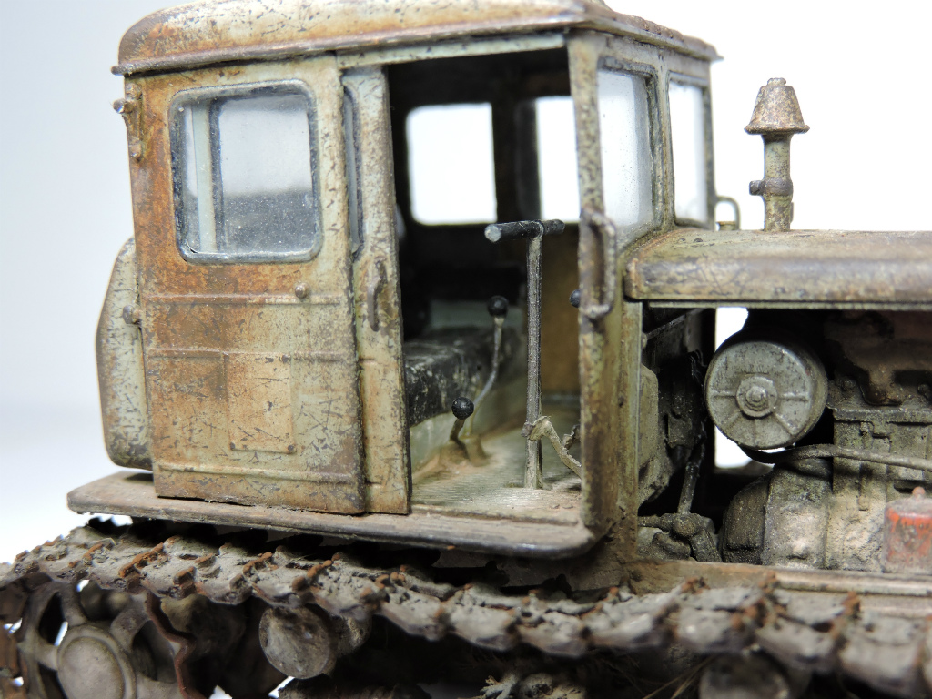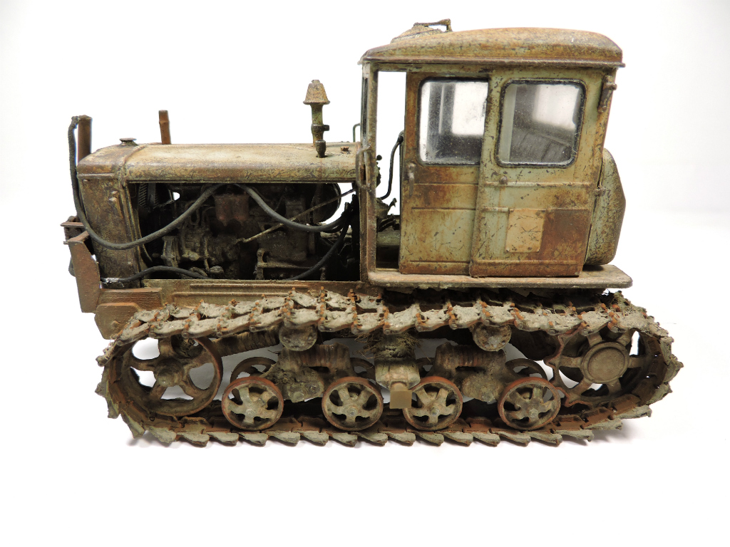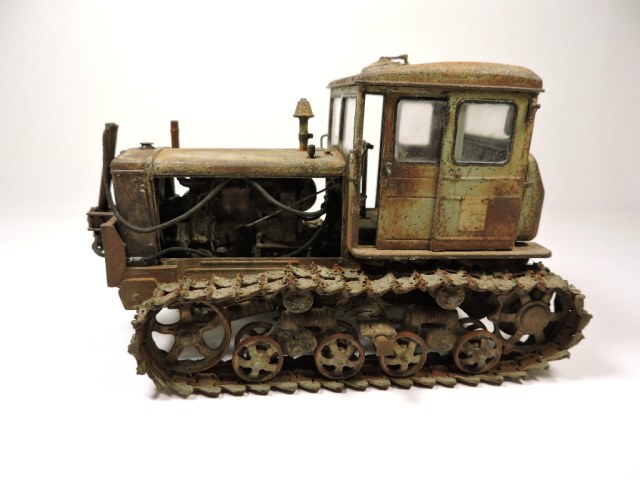 Эта модель и задумывалась под диорамку с деревенским двориком, где этой машиной определенное время не пользовались. Ржавые катки, снятый отвал. В принципе на ходу, если приложить руки. Вот какая-то такая задумка... Можно наверно назвать "подзаборной" (хотя не знаю, что именно вы в это слово вкладываете).
