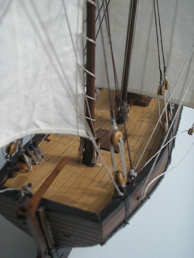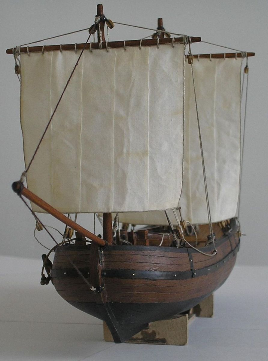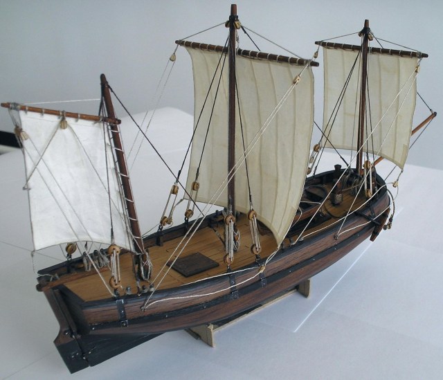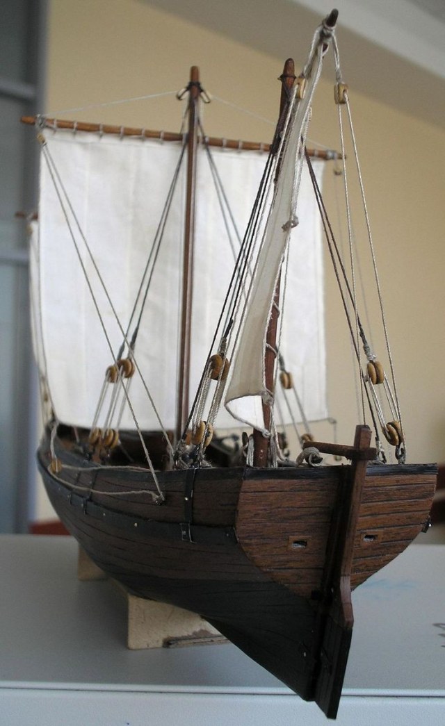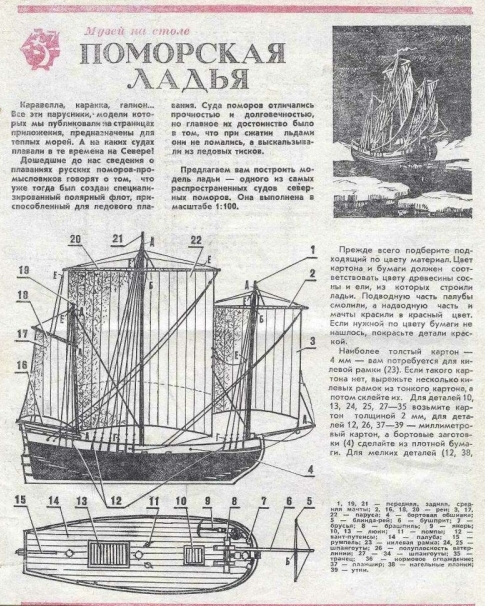 Поморская ладья ЮТ для умелых рук №8 1983 г. Музей на столе. Кораблик делался в 2013 году. Корпус из картона + шпаклёвка по дереву и грунт. Обшивка самоклеющейся плёнкой под дерево 3-х разновидностей. Мачты - кисточки, реи -бамбуковые шпажки, юферсы - "верфь на столе", нагели и блоки из деагостиниевской "Виктори". Впоследствии сильно пожалел, что не обшил корпус деревянными рейками, по моим ощущениям трудоёмкость работы с плёнкой выше, а результат в итоге хуже.