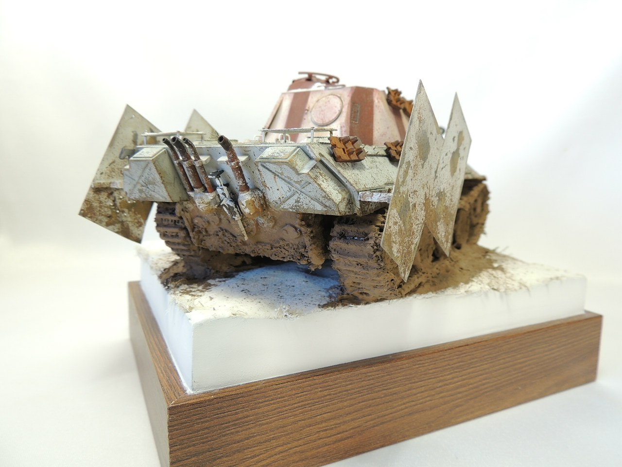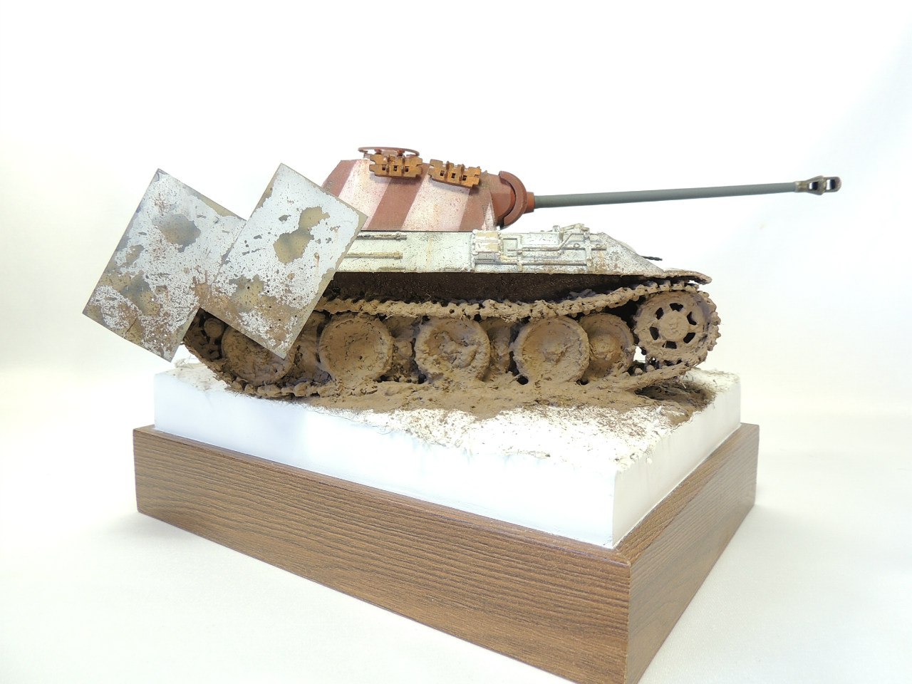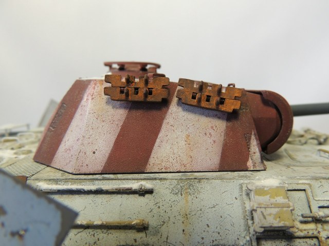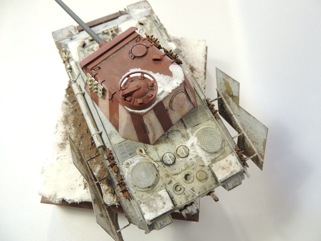 Далее чтоб машина не была уж сильно пустой, сделал для нее бортовые экраны и поставил их не обычным способом(даже если и будут мешать повороту башни), ведь упор был на тематику 46 года . Так же сверху над воздухозаборниками поставил самодельные решетки сделанные из фильтра для питьевой воды. Потом над ними же поставил защитные листы. На башне хотел поставить трофейный пулемет от ис 2 с щитком , но передумал. Защитил перед машины толстыми листами. На моторное отделение кинул остатки троса с проушиной. После таких не больших доработок машина стала выглядит более менее не так пусто.