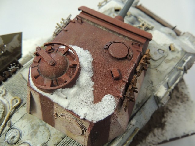 Корпус после просушки , покрасил лаком из под волос с жесткой фиксацией. После 2х часов просушки, обдирался подручными средствами в виде старых кистей, щеток , зубочисток . На корпус с башней на носились 2 - 3 самодельных фильтра разбавленных пиненом , смывка. Масляные точки, предшейдинг.