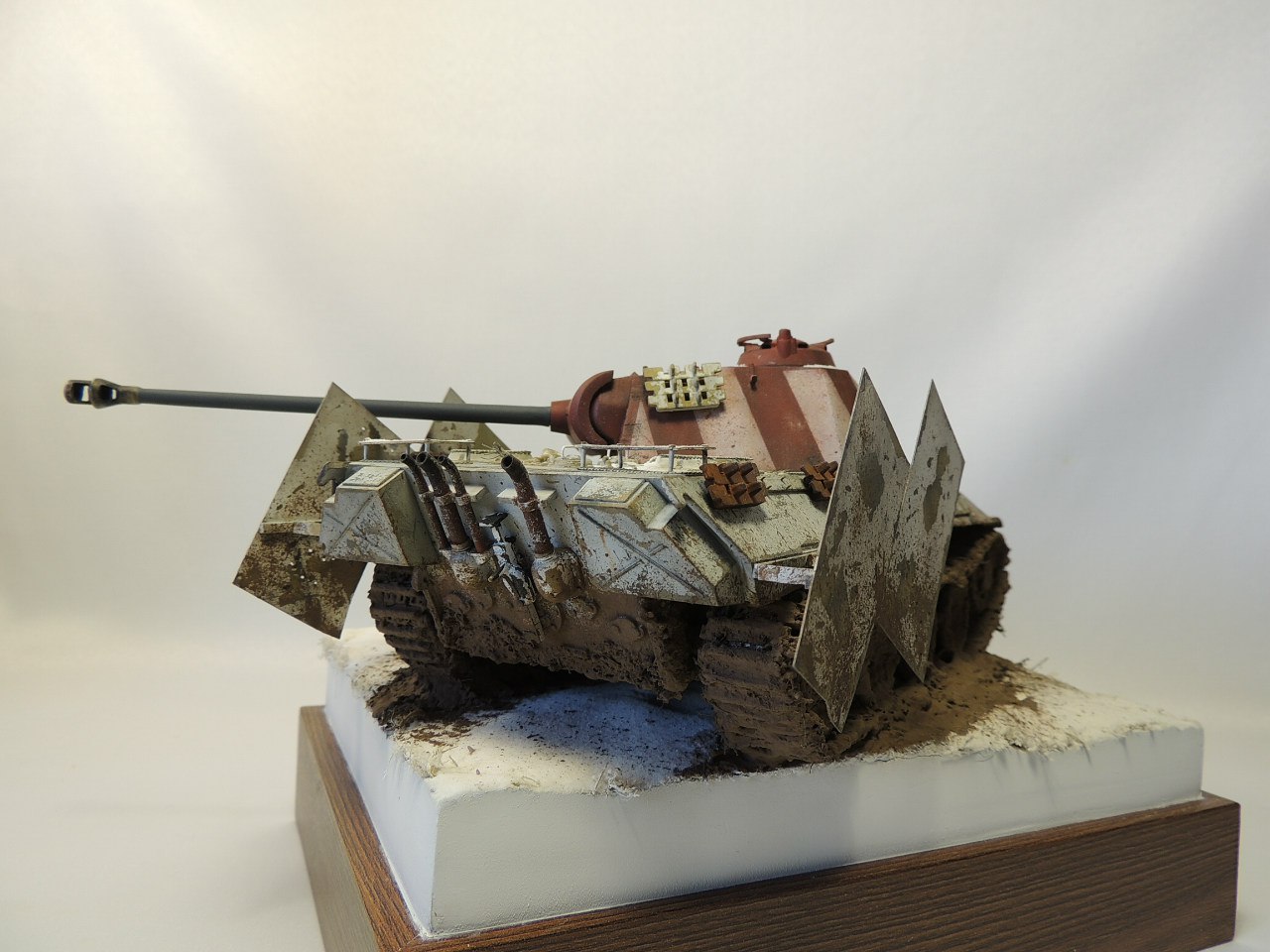 Камуфляж смесь ХF 57 (и еще 2 цвета, не помню) с добавлением глянцевого лака. ХF 58 (c добавлением гл. лака) , ствол окрашен XF 63 . Башня красками ZIP , с применением скотча от тамии.