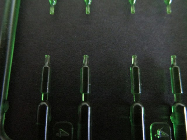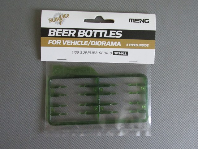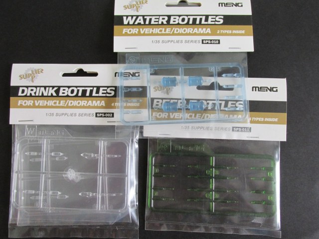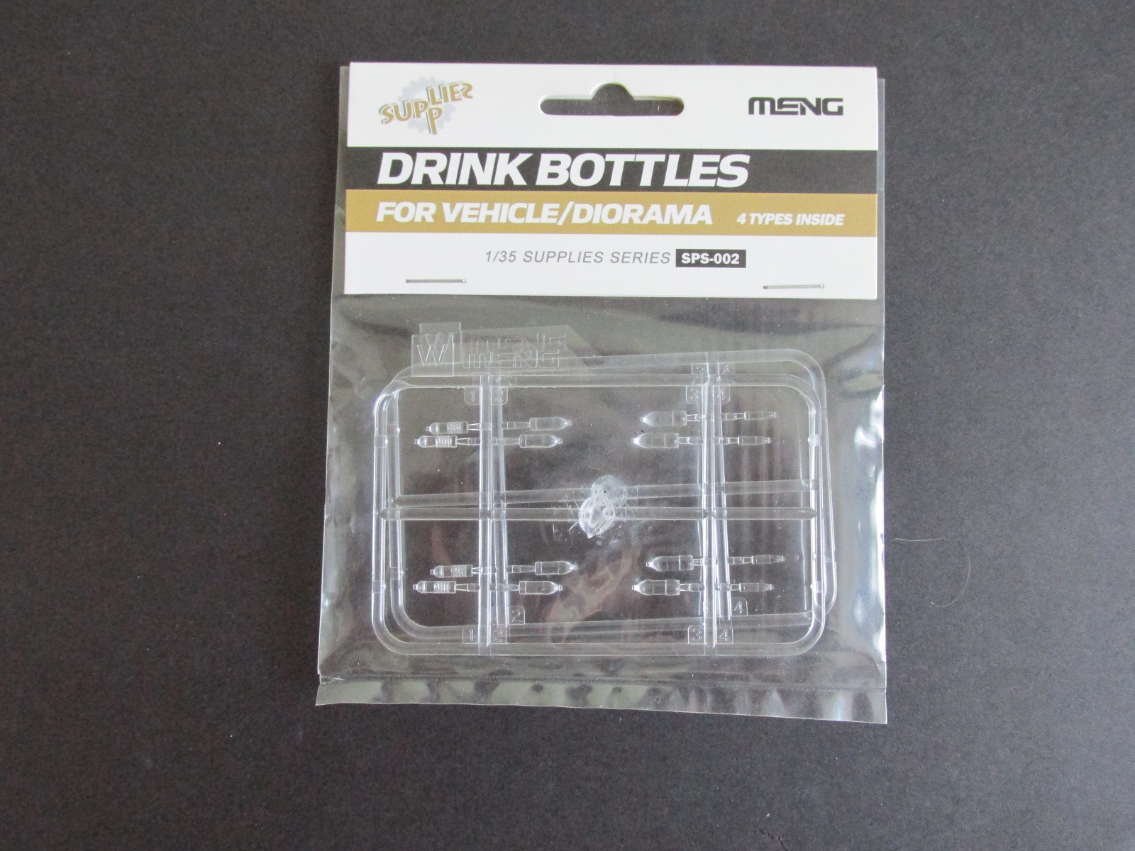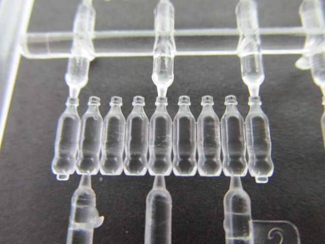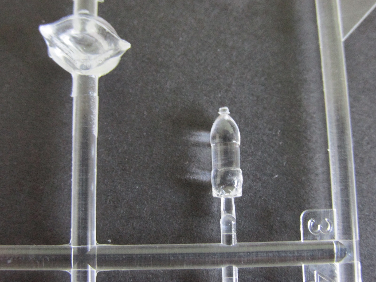Ну а теперь к допам, наборчик “Beer Bottles for Vehicle/Diorama”. Небольшой литник зелённого цвета, упакованный в маленький пакетик. На нём выполнены четыре вида бутылок по четыре штуке каждого вида, объёмом предположительно 0,3 – 1 л., итого шестнадцать бутылок. Причём каждый вид пронумерован. Качества литья отличное, ни облоя, ни утяжин, шов если и есть, его не видно. Следующий набор: “Drink Bottles For Vehicle/Diorama”. В полиэтиленовом пакете, чуть больше, чем предыдущий, упакованы два абсолютно одинаковых прозрачных литника. На каждом выполнены четыре вида бутылок (каждый вид пронумерован) объёмом предположительно 0,3л., 1 л., 1,5 л. и 2л. Всего шестнадцать бутылок. Качество литья отличное. Ни облоя, Ни утяжин, шов есть, но видно его, только если хорошенько присмотреться. Декалий ни у одного из них нет. Обзор набора “Water Bottles for Vehicle/Diorama” уже есть на каропке, так что делать его не стану, чтоб не было конфронтаций. Если кому интересно, можно посмотреть у Мегавольта (Megavolt). От себя лишь добавлю, что на бутылях для кулера нет ручки для переноски, а может это просто один из вариантов.