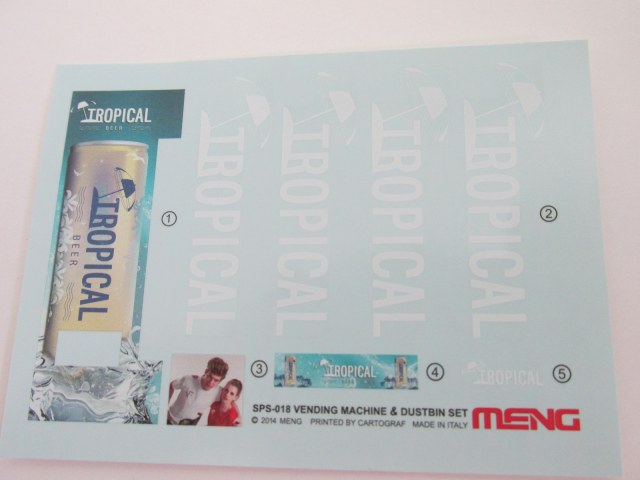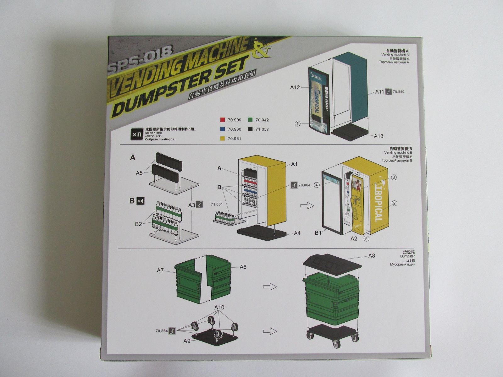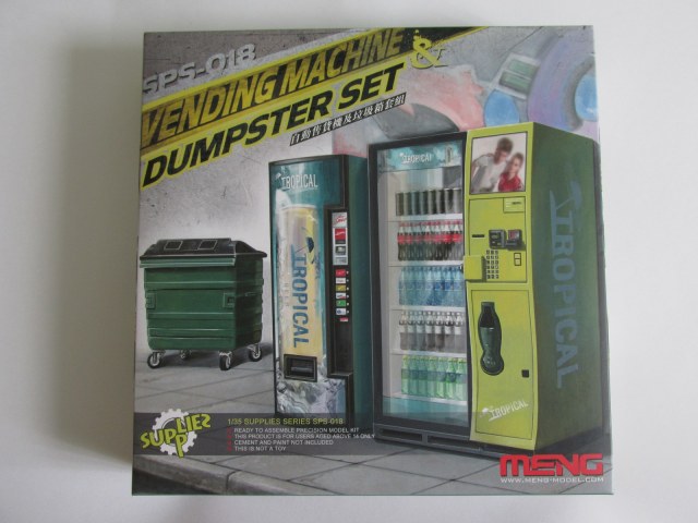 Всемпривет! Всё таки удалось победить земноводное. И вот, на днях пришла посылка, и я решил сделать обзор своего нового приобретения, набор фирмы “Meng” “Vending Machine & Dumpster Set”, артикул SPS-018. Дословный перевод – “Торговый аппарат и набор корзин”. Надо сказать вторая часть названия не совсем точная, вместо набора корзин лишь один мусорный бак, а ведь хотя бы одна корзина или урна была бы не лишней. Но меня заинтересовали именно торговые автоматы, собственно из – за них я его и приобрёл. Так же к одному из них докупил наборчики: “Beer Bottles for Vehicle/Diorama”, артикул SPS-011 (Пивные бутылки);“Drink Bottles For Vehicle/Diorama”, артикул SPS-002 (Пэтсбутылки); и “Water Bottles for Vehicle/Diorama” артикул SPS-010 (Правильней будет назвать пэт бутылки и бутыли с водой для кулера). Но обо всём по порядку.