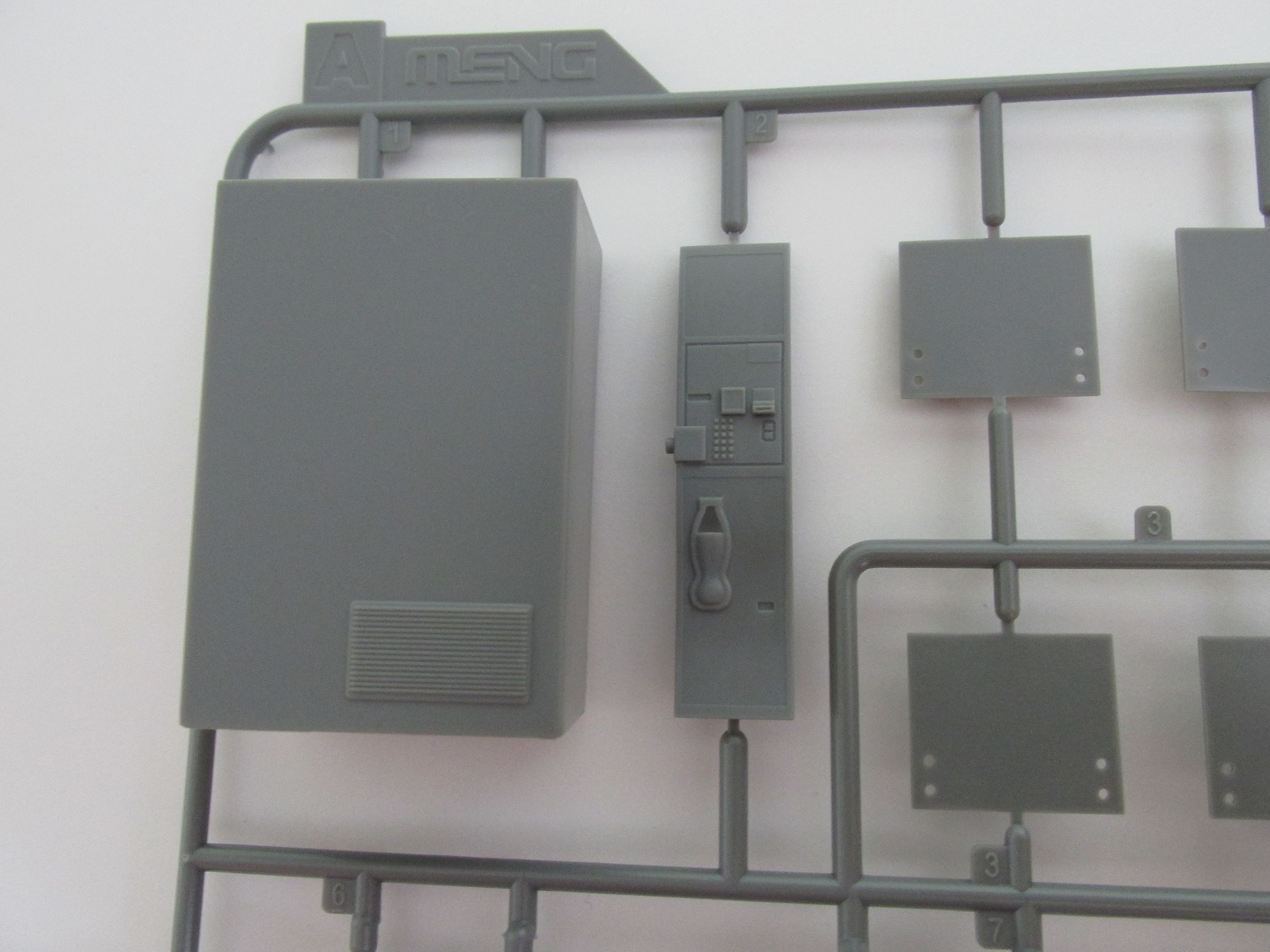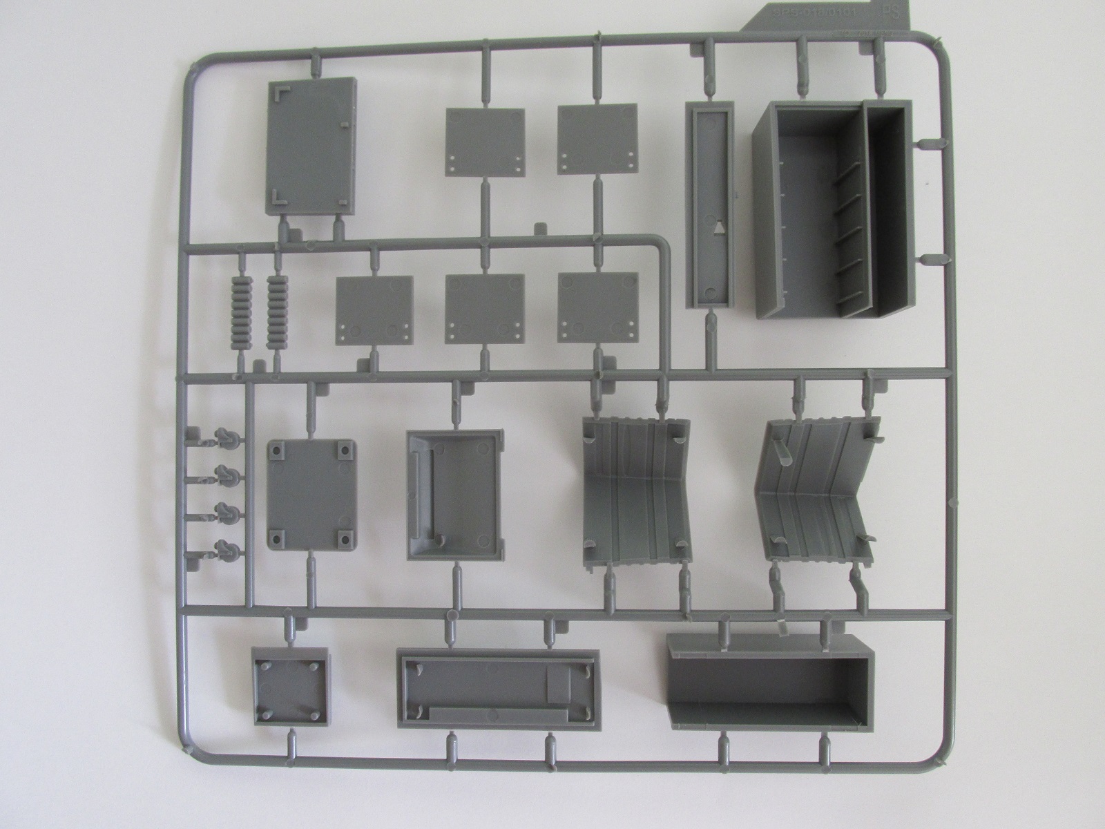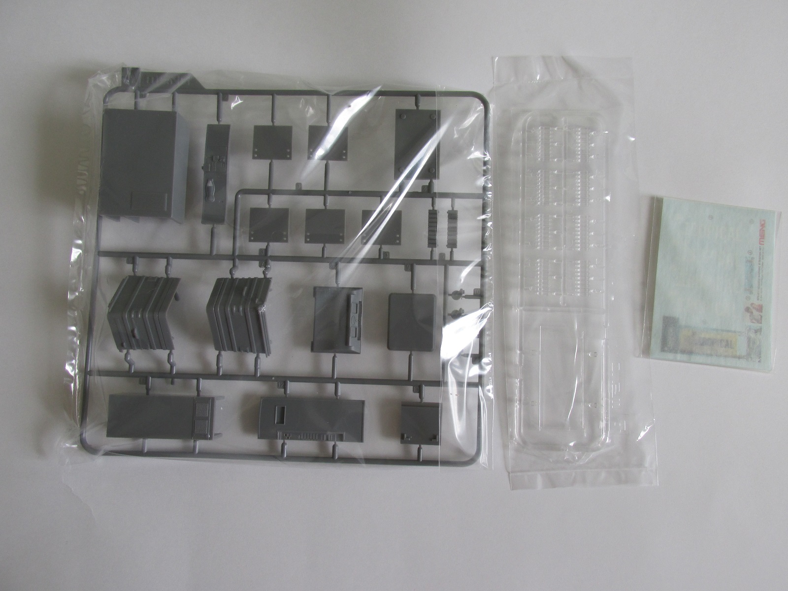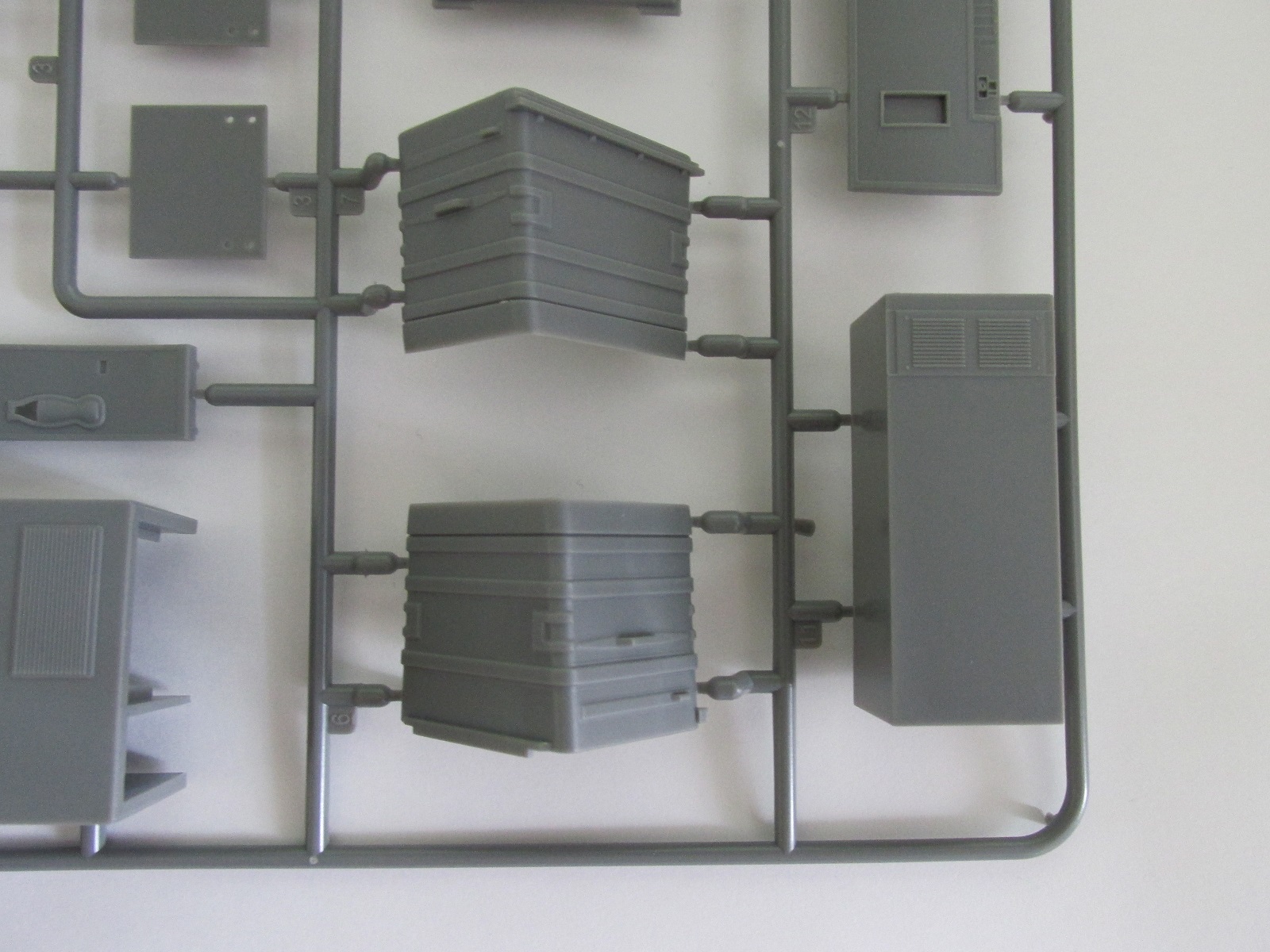 Коробка размерами 220х220х37 мм., с боковой загрузкой и с красочным бокс артом на лицевой стороне. На обратной схема сборки, она же схема окраски. Внутри два литника и маленький листочек с декалями размером 85х62 мм., каждый упакован в отдельный пакетик (прозрачный литник дополнительно покрыт плёнкой, а листочек с декалями дополнительно защищён калькой, так что прибыли в сохранности). Литник А серого цвета, на котором выполненыдетали для сборки торговых автоматов А (судя по декали и картинке для пивных банок) и В (соки, газировка и прочее) и мусорного бака. Качества литья отличное, все дизайнерские детали автоматов чётко видны. Шов и облой по минимум (какой то мизерный процент от общего), утяжин нет, следы от толкателей с внутренней стороны, если лень, то можно и не шпаклевать, после сборки они вряд ли будут видны. Литник В из прозрачного пластика. На нём выполнены прозрачная дверь торгового автомата В и бутлки ёмкостью ориентировочно 0,33 л. Бутылки отлиты блоками по девять штук, всего восемь блоков, итого 72-е бутылки. Декали даны лишь на оформление торговых автоматов. Стыкуемость покажет сборка. Минусы набора: