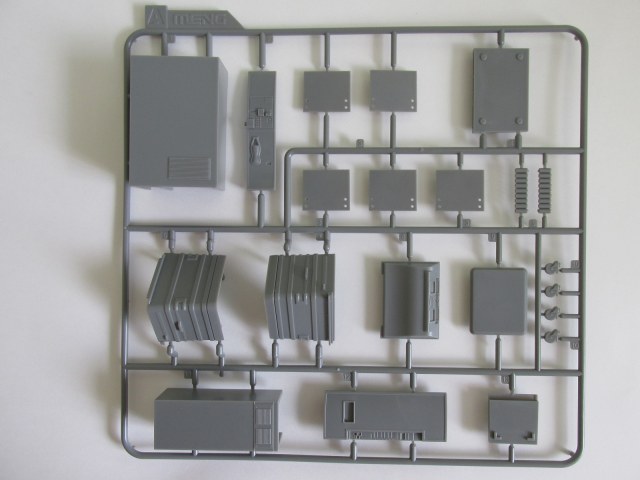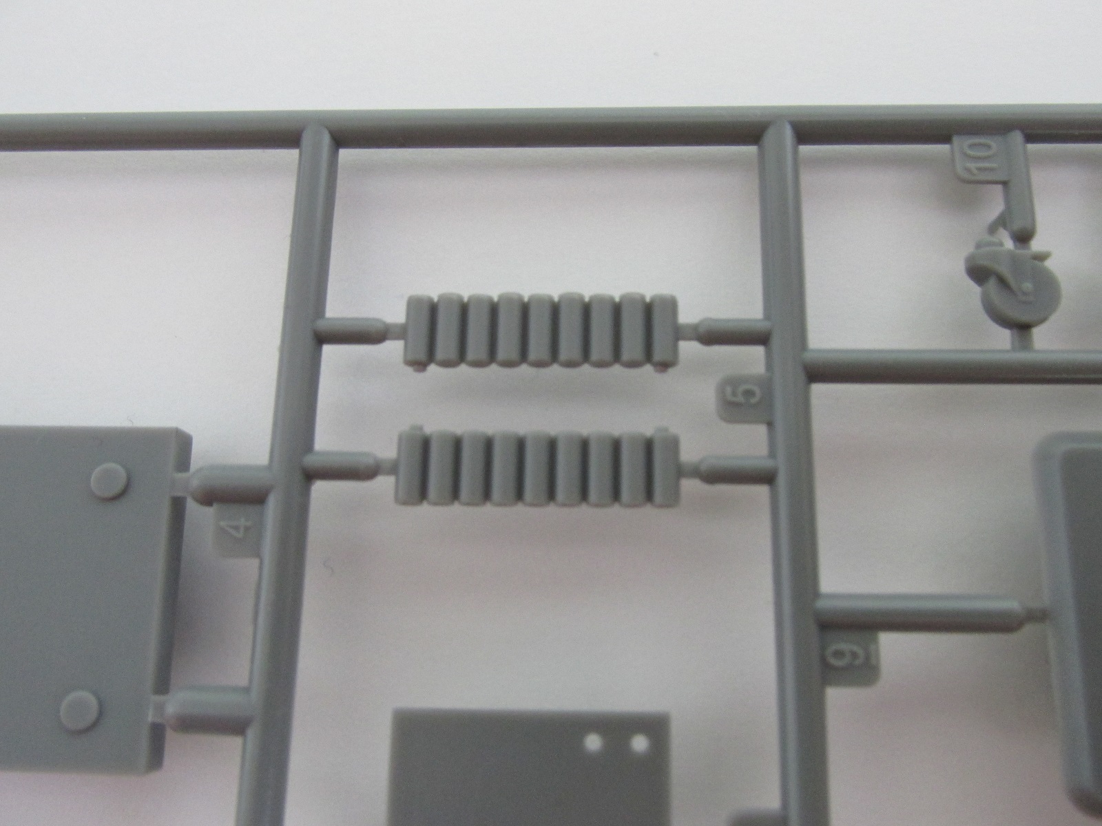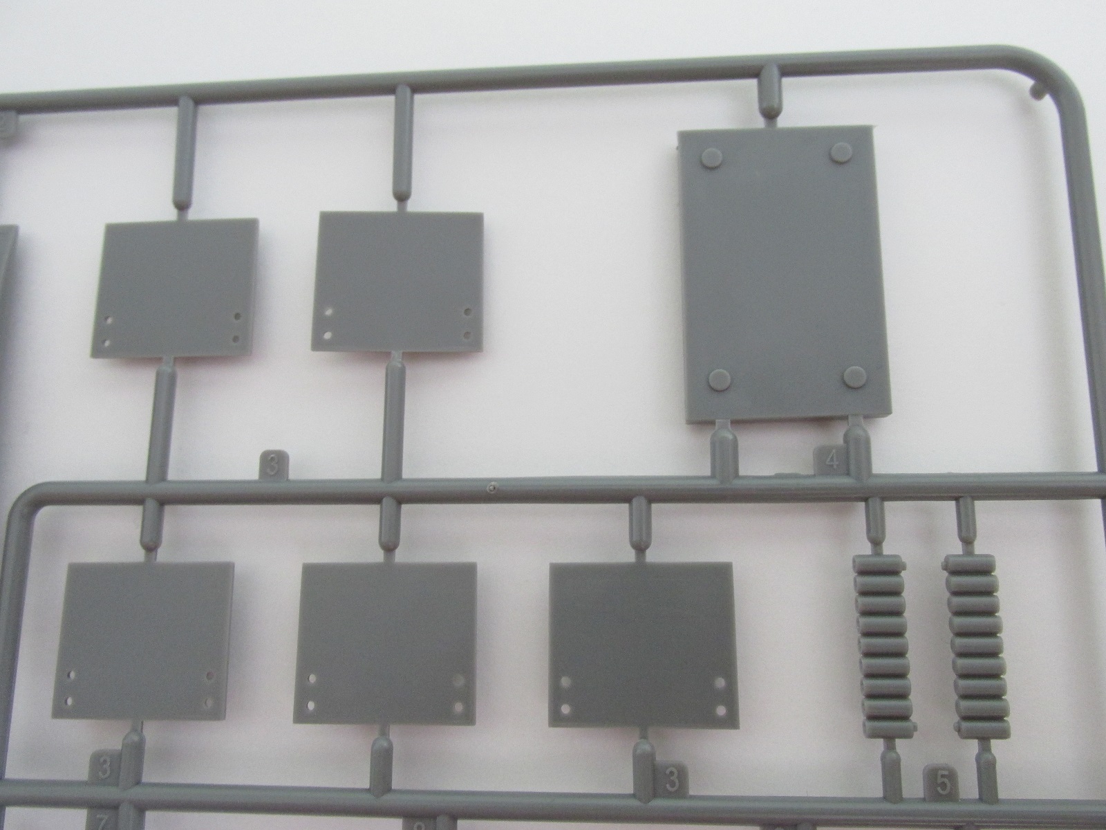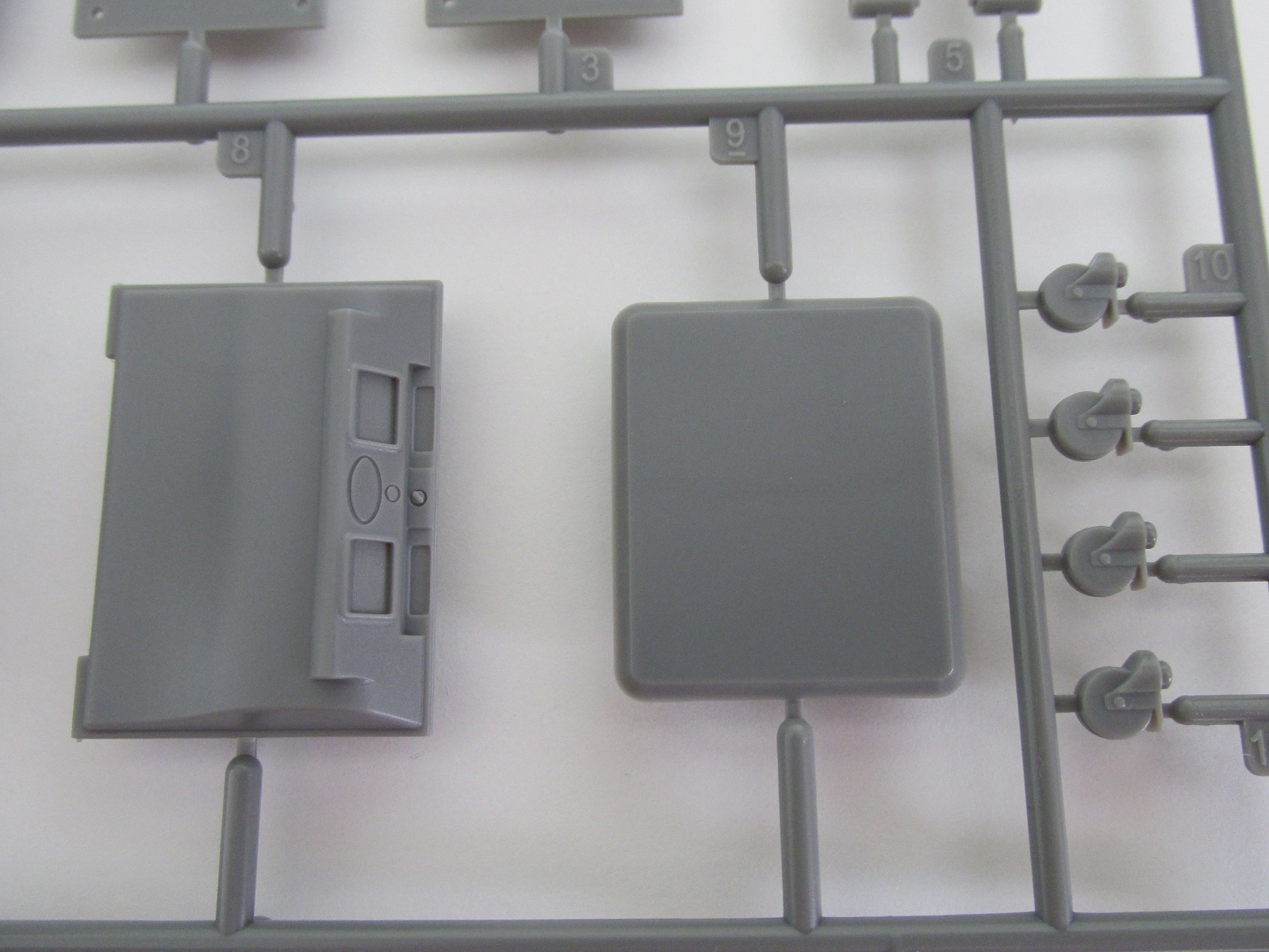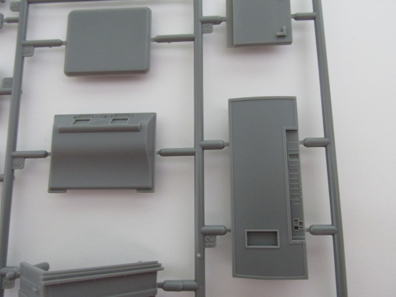 Коробка размерами 220х220х37 мм., с боковой загрузкой и с красочным бокс артом на лицевой стороне. На обратной схема сборки, она же схема окраски. Внутри два литника и маленький листочек с декалями размером 85х62 мм., каждый упакован в отдельный пакетик (прозрачный литник дополнительно покрыт плёнкой, а листочек с декалями дополнительно защищён калькой, так что прибыли в сохранности). Литник А серого цвета, на котором выполненыдетали для сборки торговых автоматов А (судя по декали и картинке для пивных банок) и В (соки, газировка и прочее) и мусорного бака. Качества литья отличное, все дизайнерские детали автоматов чётко видны. Шов и облой по минимум (какой то мизерный процент от общего), утяжин нет, следы от толкателей с внутренней стороны, если лень, то можно и не шпаклевать, после сборки они вряд ли будут видны. Литник В из прозрачного пластика. На нём выполнены прозрачная дверь торгового автомата В и бутлки ёмкостью ориентировочно 0,33 л. Бутылки отлиты блоками по девять штук, всего восемь блоков, итого 72-е бутылки. Декали даны лишь на оформление торговых автоматов. Стыкуемость покажет сборка. Минусы набора: