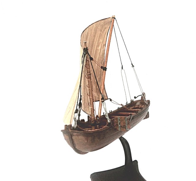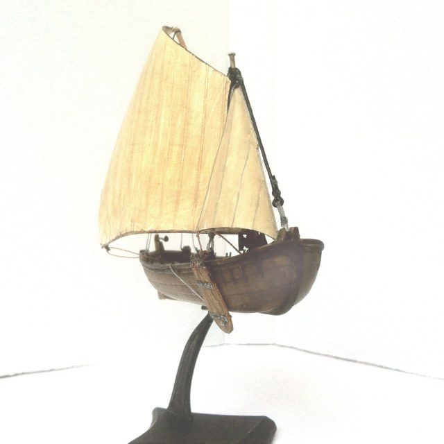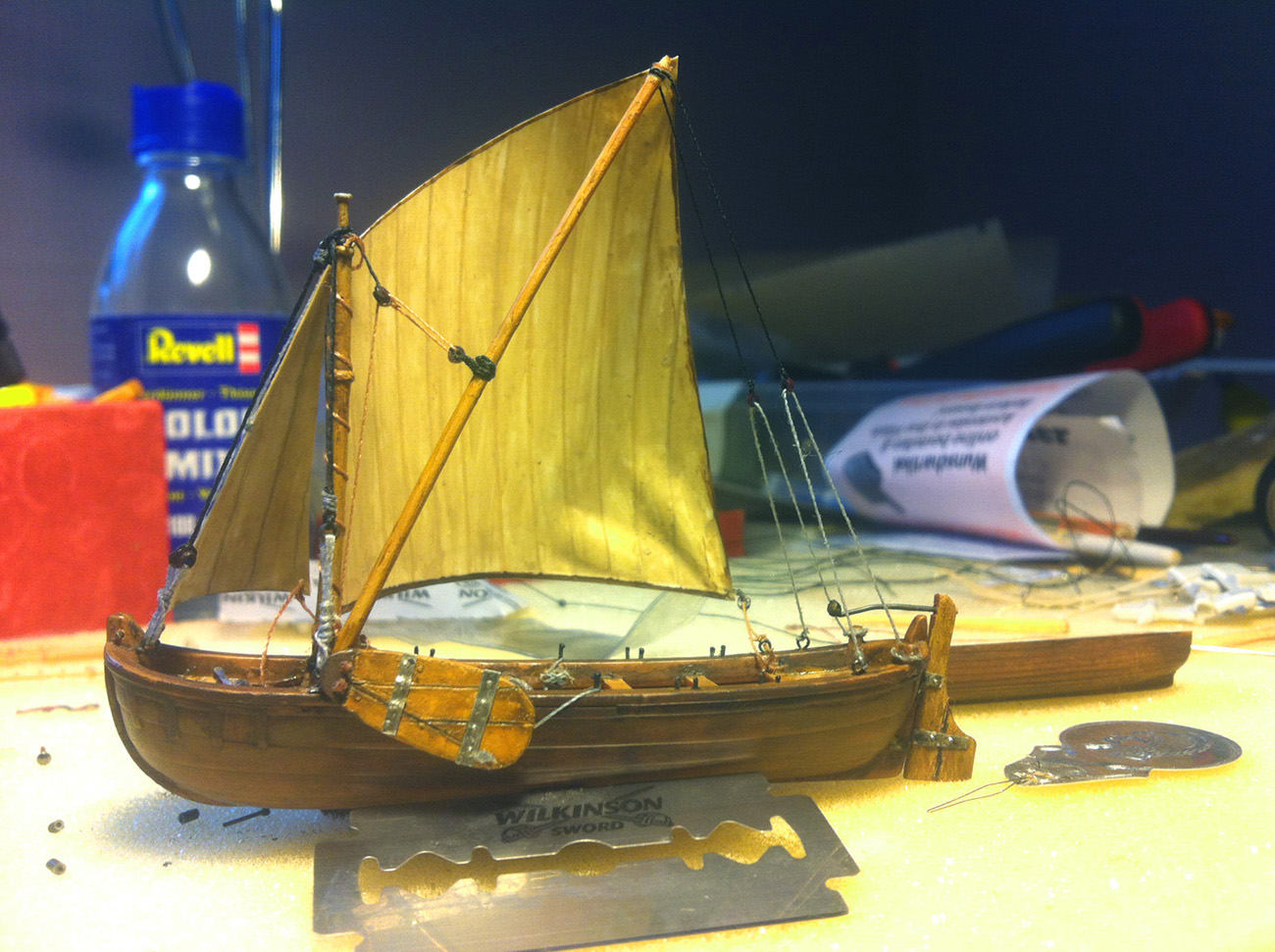 Готовясь к сборке модели от HELLER и опять в масштабе 1:150 решил потренироваться и собрать барказ со шпринтовым парусом. Мачту взял от шлюпки "Жемчужины", вакушки от грота Вазы, руль, брашпиль и шверцы сделал сам из листового пластика.