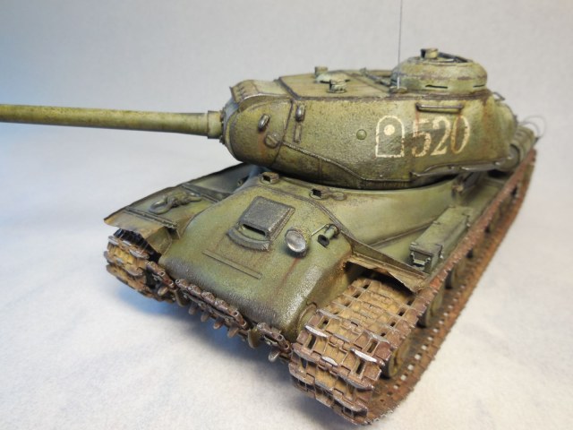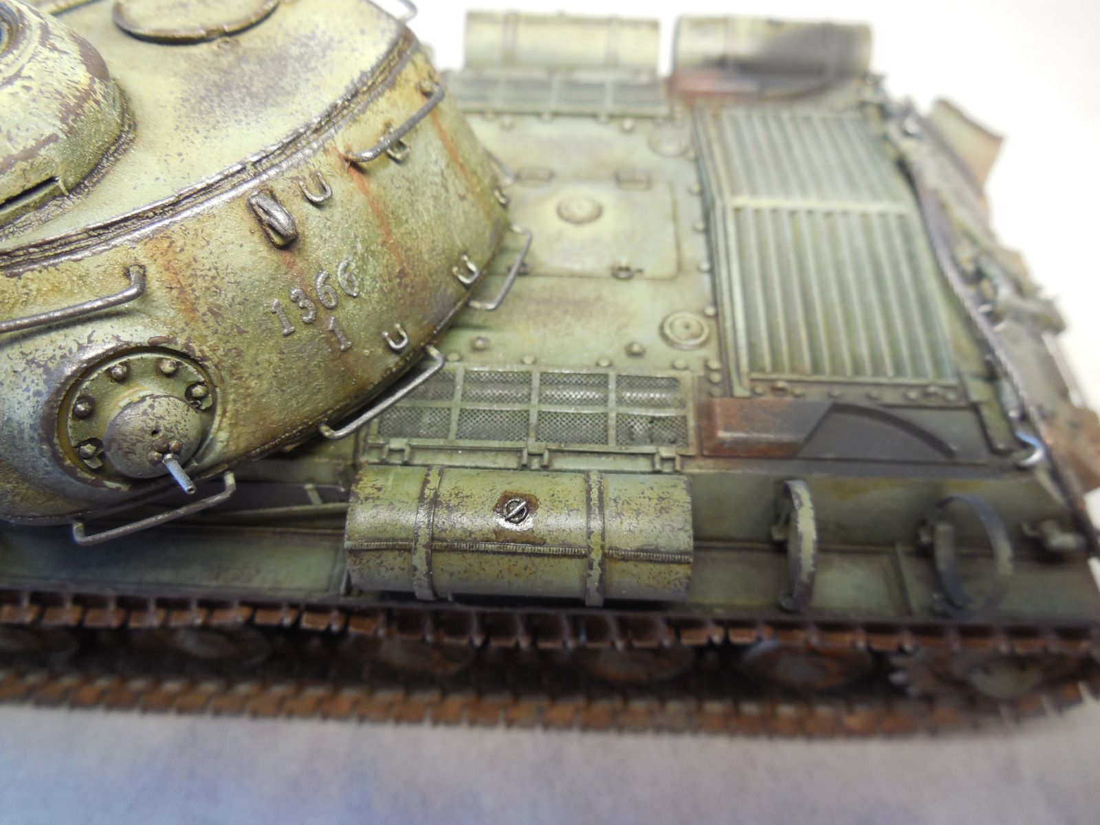 Здравствуйте коллеги моделисты.Хочу представить модель танка ИС-2,62-го гвардейского тяжелого танкового полка,8-го танкового корпуса,гвардии подполковника,Героя Советского Союза Е.Ф.Ивановского.На создание именно этой машины меня сподвигли две причины.Во первых Евгений Филиппович являлся уроженцем Республики Беларусь,коим я также являюсь,что очень символично для меня,а во вторых мне не хотелось брать за основу уже "заезжанные" варианты машин,хотелось чего то нового,не стандартного и результат оценивать вам. Для воплощения модели в жизнь, использовал всем известный набор от Тамии и башню Miniarm.Честно говоря я долго колебался,доработать родную тмиевскую башню,или всетаки докупить миниарм.Любопытство взяло верх и я решил докупить миниарм, о чем абсолютно не жалею.Правда ствол пушки предложенный миниармом я выкинул сразу,так как он длиннее чем надо на 5мм, на стволе зачем то нарезаны пять насечек а дульный тормоз мне больше тамиевский понравился.Поэтому ствол я купил RB Model отдельно.Для деталировки были использованы:1.Два набора от Aber,основной и надгусеничные полки.2.Траки Friulmodel.3.Фара Elf.4.Тросы от Eureka.5.Петли RB Model.6.Болты Master Club.7.Листовой пластик эвергрин,листовая латунь,проволка.Все доработки описывать не буду,долго очень читать придеться.Дорабатывалось практически все,по этой причине работа шла долго.Зато за это время я досконально изучил мат.часть ИС-ов,за что спасибо литературе,коллегам и в частности Денису Кузнецову.Из основных доработок.Башню я решил сделать завода СиМ,с башенкой завода №200,характерными отличиями для данных башен является вертикальный шов на скуле,определенный изгиб шва под пистолетным портом и калиграфический номер на корме.Номер был взят произвольно.Носовая часть корпуса и башня,текстурированы Mr.Surfacer 500. Баки самодел из листовой латуни,плюс сварной шов от aber,болты были заменены на мастерклаб,все швы шпаклевка,кое где от aber,триплексы CD,ну и т.д.Моя любимая,художественная часть работы была выполнена акрилом Tamiya,Vallejo,эмалью Hummbrol.Тонировка прорабатывалась маслом,пигментами от MIG,AK.О художественной технике коротко,база,модуляция,высветление,сухая кисть,тактический номер прорисовал на маскировочной бумаге и вырезал ножом,после чего задул на модели,два фильтра,лак,далее сколы кисть плюс тампирование,потеки,смывка,пигменты и снова слегка лак.Вроде с большего все.Спасибо за внимание.Приятного просмотра.