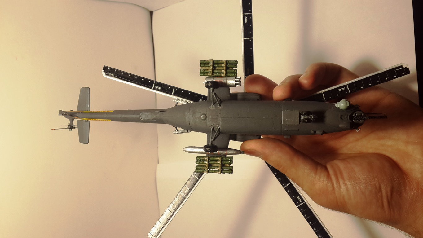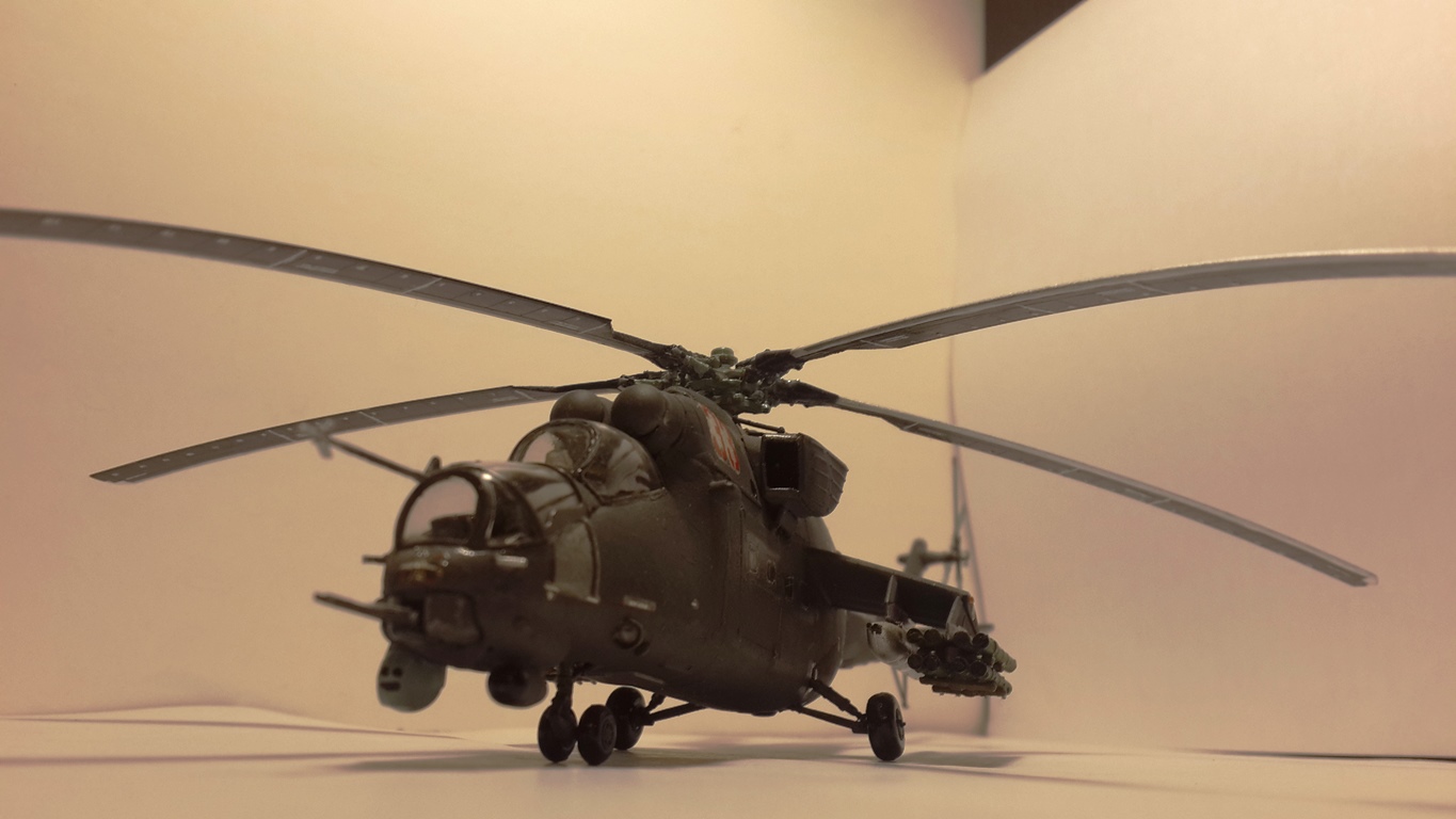 Ми-35 М от Звезды. Данную модель пытался приблизить к машинам Кореновского полка. Модель сложная при сборке. Очень туго подгоняется кабина к фюзеляжу. Очень много пришлось запиливать и подтачивать. Добавлений своих почти не делал, немного деталей на хвост и кабину. Декали от "Бегемота", краска "Тамия". Некоторые части пострадали при переезде с квартиры на квартиру, ремонт криво получился.