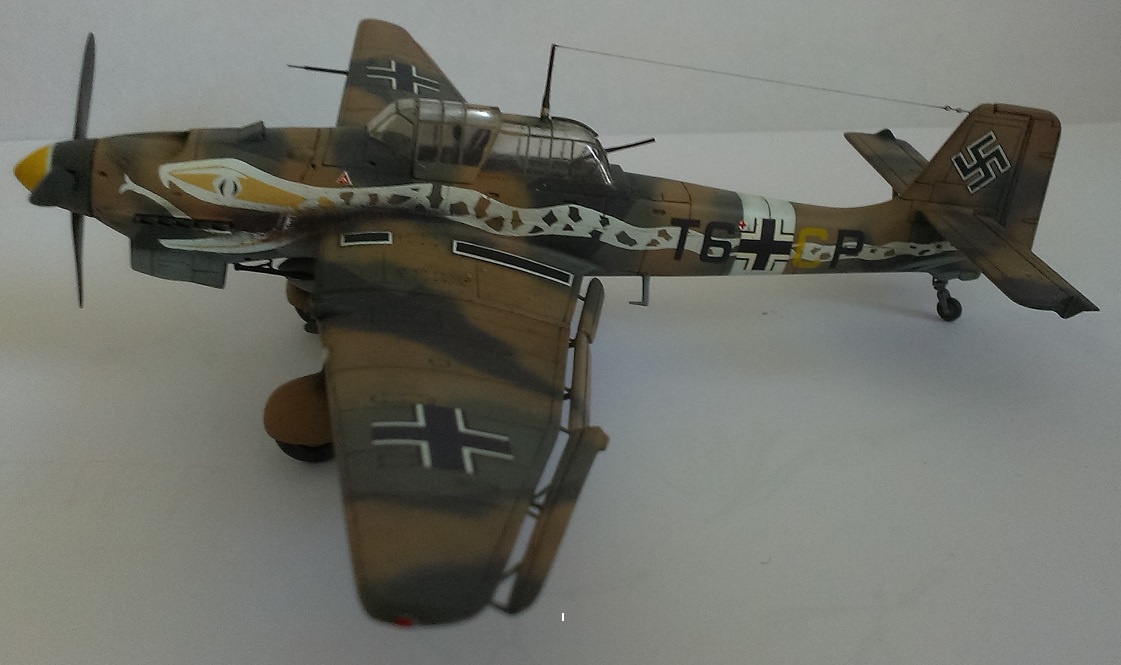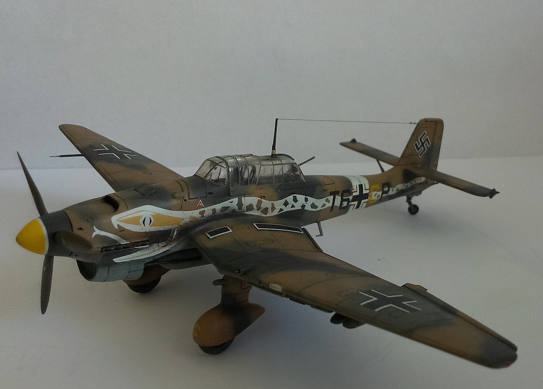 Это как раз фотография Ju 87R-2 из 6./St.G 2 лейтенанта Hubert Pölz, он сидит на фонаре. Снимок сделан летом 1941 года, на аэродроме Тмими