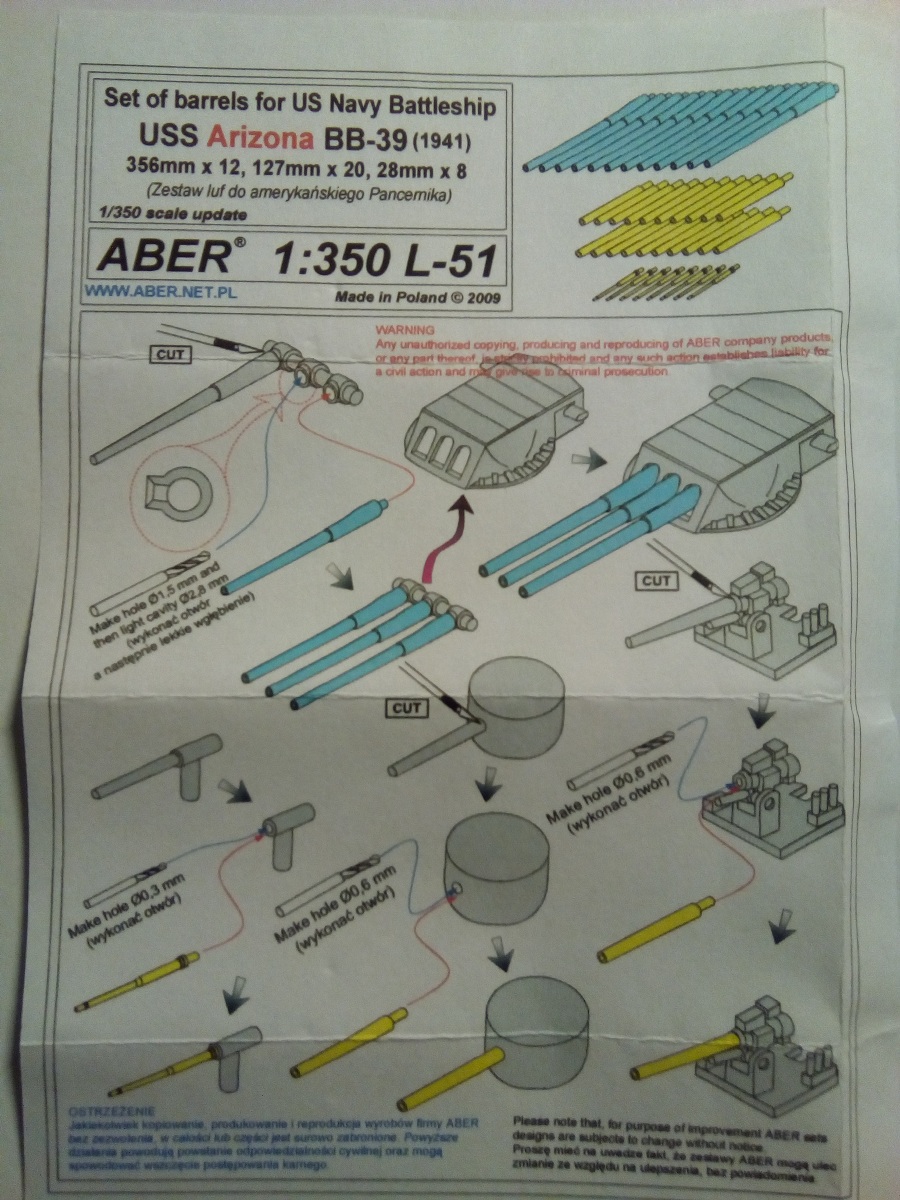 Недавно пришла посылка с обвесом для линкора Аризона. Данный набор жизненно необходим для детализации выше означенного корабля. В частности для орудий гк, казематных орудий противоминного калибра, а так же 8 универсальных орудий калибра 127 мм. Совместно с данным набором был приобретён набор для замены вышеозначенных универсальных орудий был приобретён набор от Flyhawk. И длина стволов весьма существенно отличается, что вгоняет в некий ступор.Так стволы от Flyhawk короче стволов от Aber.