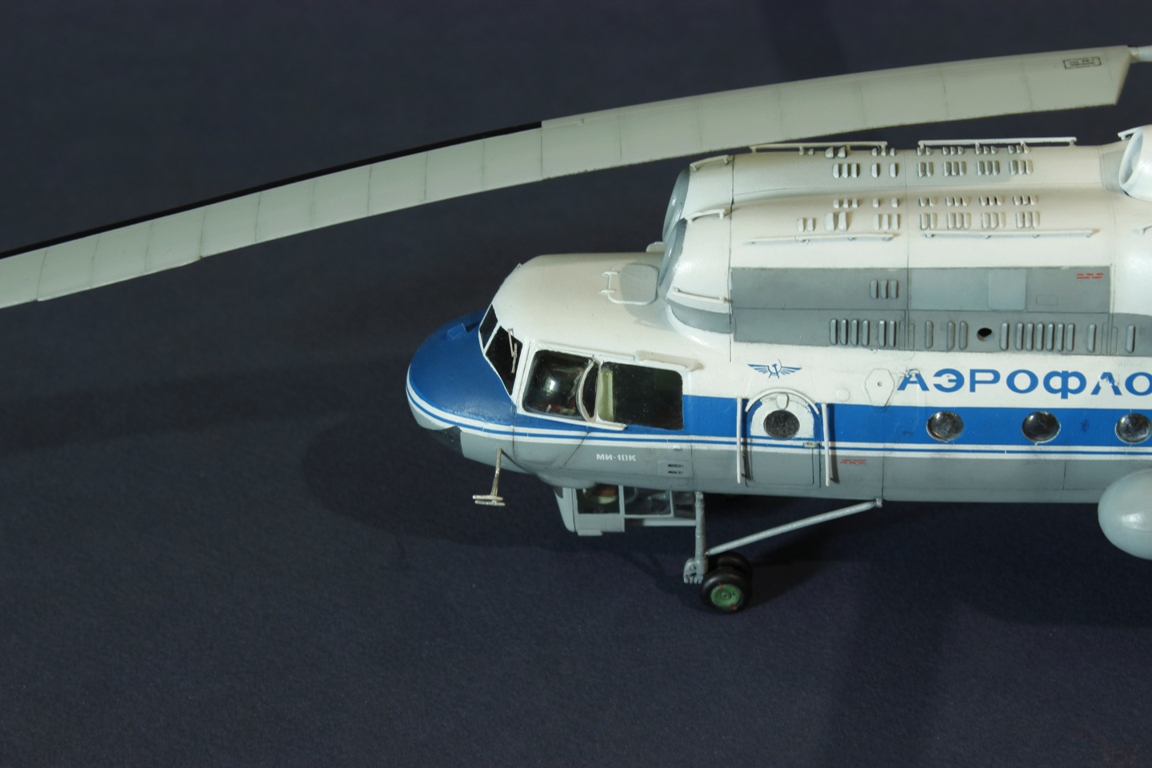 Всем здравствуйте! Представляю вам долгожданное пополнение в моей коллекции - знаменитого труженика Ми-10К от всем известного производителя. Что сказать по модели... ЛНД есть ЛНД, но порадовала проработка мелочей, особенно интеръера кабины, от себя добавил мелочи но в меру - аптечки, ремни. Что хорошо, внутрянка вся прекрасно просматривается - благодаря большой площади остекления, само остекление тоже порадовало, не мутное. Сборка шла без особых нареканий, в меру шпаклёвки, в меру наждачной бумаги, пока не дошло дело до баков, вот тут меня ждала серьёзная засада. Упаковшики по ошибке положили в мой набор баки от длинноногой "десятки"! А они разные - у Ми-10К они короче, задняя часть у них закруглена. Пришлось отпиливать ненужные части и из пластика и шпаклёвки формировать правильную форму - нарезал из литников стержней, получилась этакая "арматура", которую я напихал внутрь баков и шпаклёвкой сформировал заднюю часть, а после того как застыла, шлифовал до нужной формы. На правом баке шпаклёвка дала сильную усадку, причём не сразу а уже после даже покраски, немного заметно "арматурину", но переделывать уже не стал. Добавил шланги различные на баки, на основные стойки - БАНО и шланги тормозной системы. Что касается перекоса вертолёта вправо, мне он показался слишком сильным, поэтому я немного "приспустил" шины на левой стойке. Доработал втулку несущего винта - сделал болты крепления лопастей и шланги противообледенительной системы. Из мелких дополнений - дворники, антенны. Красил всё это хозяйство тамией, с декалями пришлось поматериться от души - очень хрупкие оказались, рвались постоянно. При покраске носа немного всё-таки в цвет не попал) Немного смыл масляной краской, тонировал карандашом, особо пачкать и ушатывать его рука не поднялась. Ну вот, в кратце и всё, спасибо за внимание, приятного просмотра)