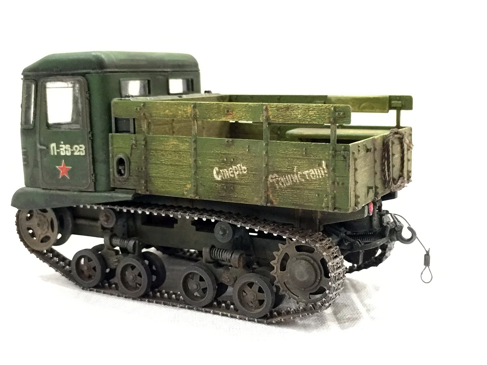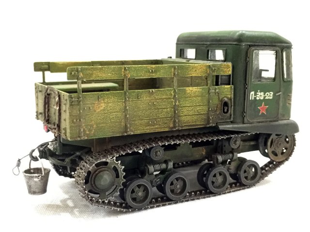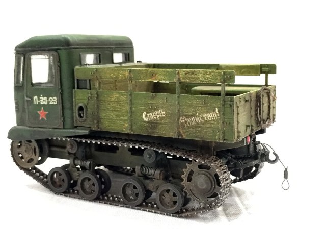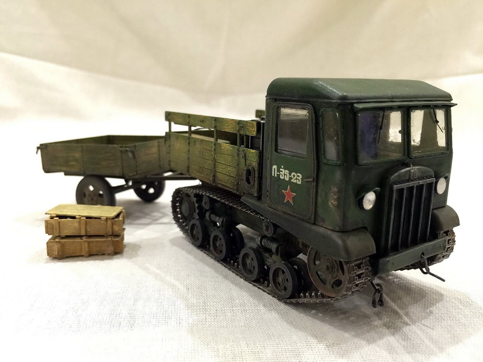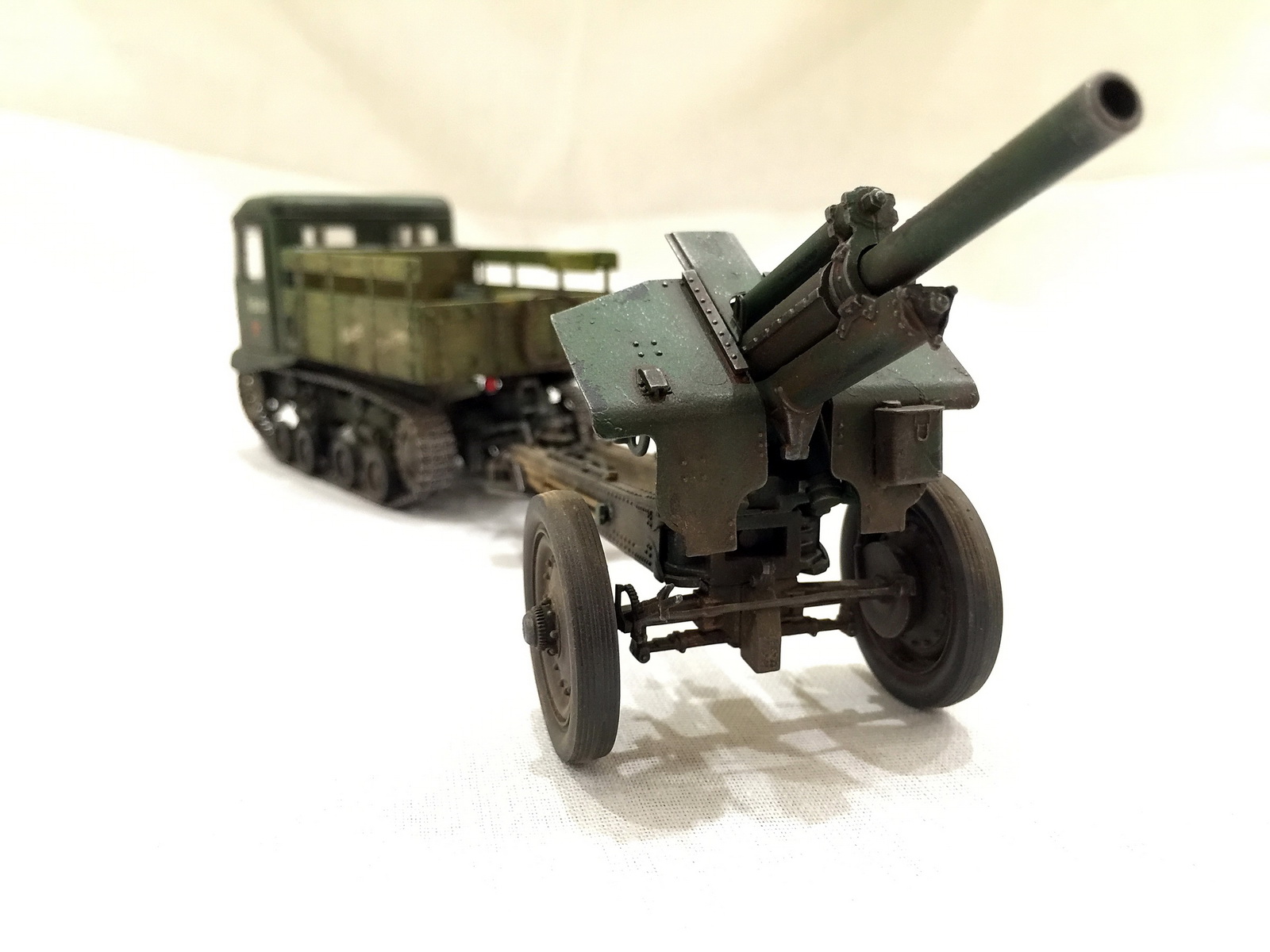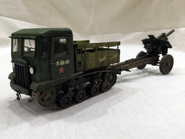 Стройка модели заняла месяц: 09.05.16 – 08.06.16. Качество деталей оцениваю на «четыре» (есть небольшие огрехи у деталей, но они решаемы простым путем). Покраску делал красками от А-Model. Опять решил попробовать жидкость для создания эффекта потрескавшейся краски от этой же торговой марки на крыше кабины. Что из этого получилось – видно на фото. Для зрелищности пришлось параллельно сделать какой-нить прицеп. Под горячую руку попала советская гаубица М-30 и автоприцеп АП-1 (хотя последний исторически никак не вяжется с СТЗ-5). Вот и все.