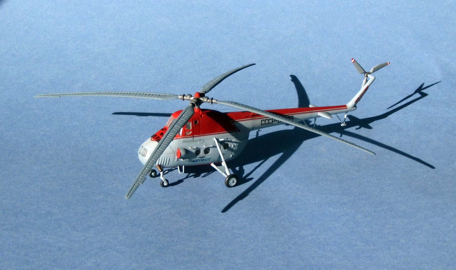 Эта модель - презент одного из сотоварищей по нашему увлечению, и теплит одни из самых ностальгических воспоминаний моего детства. Но под нож пошла, не раздумывая... Так как модель имеет большие проблемы с геометрией, в первую очередь, была укорочена непомерно длинная хвостовая балка на 1 секцию, «подбрюшная ванна» не использовалась, на её место вклеена заглушка, обточены лопасти хвостового винта, чтобы немного приблизить их очертания к истине. Из толстой прозрачной упаковочной пленки изготовлены боковые сдвижные двери кабины, задние боковые окошки кабины выточены из прозрачного пластика, наклеены направляющие сдвижных дверей, значительно укорочены штоки основных стоек шасси, в противном случае вертолет будет находится в такой стойке, что пассажирам бы приходилось проникать в салон только с помощью трапа, так же укорочены стойки носовых шасси. Колеса основного шасси взяты из модельного лома, так как из набора несуразно малы, колеса носовых шасси оставлено штатное, ибо по размеру они примерно подходят, а к фактуре требования невысоки в силу специфики их расположения на стойках. Всем известно качество пластикартовских иллюминаторов с обязательным атрибутом – глубочайшей утяжиной посередине, поэтому по самому удачному иллюминатору сделана матрица из силикона, в которую были отлиты остальные стекла иллюминаторов из прозрачного литника. Заново сделаны поручни и все антенны, тросовые натянуты из бантика, из обрезков декальной бумаги изготовлены заглушки воздухозаборников. Естественно, был сошкурен огуречный клеп и заново нарезан крой расшивки.