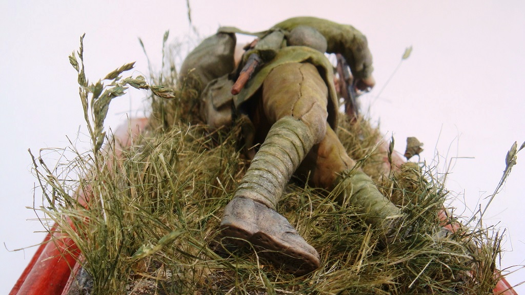 Всем добрый вечер.Представляю миниатюру"Ворошиловский стрелок".Боец РККА с нагрудным значком на конец лета 1941г.,вооруженный карабином Мосина обр.1938г.В реале он на 20см. короче винтовки Мосина.Штык не прилогался.Положение-ведение огня лежа,с заряжанием патронов через обойму.Фигура размером 90 мм.Слеплен из обычного эпоксилинаDUO на проволочном каркасе от сварочного полуавтомата,предварительно обожженной.Все ремни из фольги.Приклад из школьной линейки.Затвор,коробчатый магазин,ствол из алюминевой проволоки разного сечения.Подставка от фоторамки.Трава сантехнический лен.Окрашен акриловыми красками Гамма"Студия".Приятного просмотра.