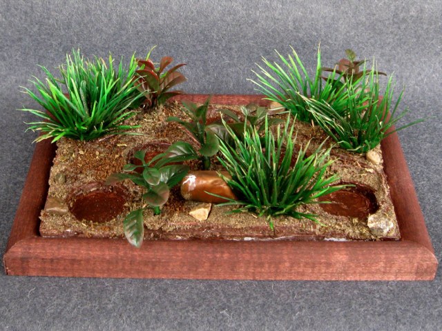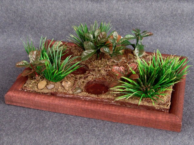 Подставка – фоторамка, пенопласт, песок с ПВА, камни натуральные, проволока и нитки (корни), растения пластмассовые для аквариума.